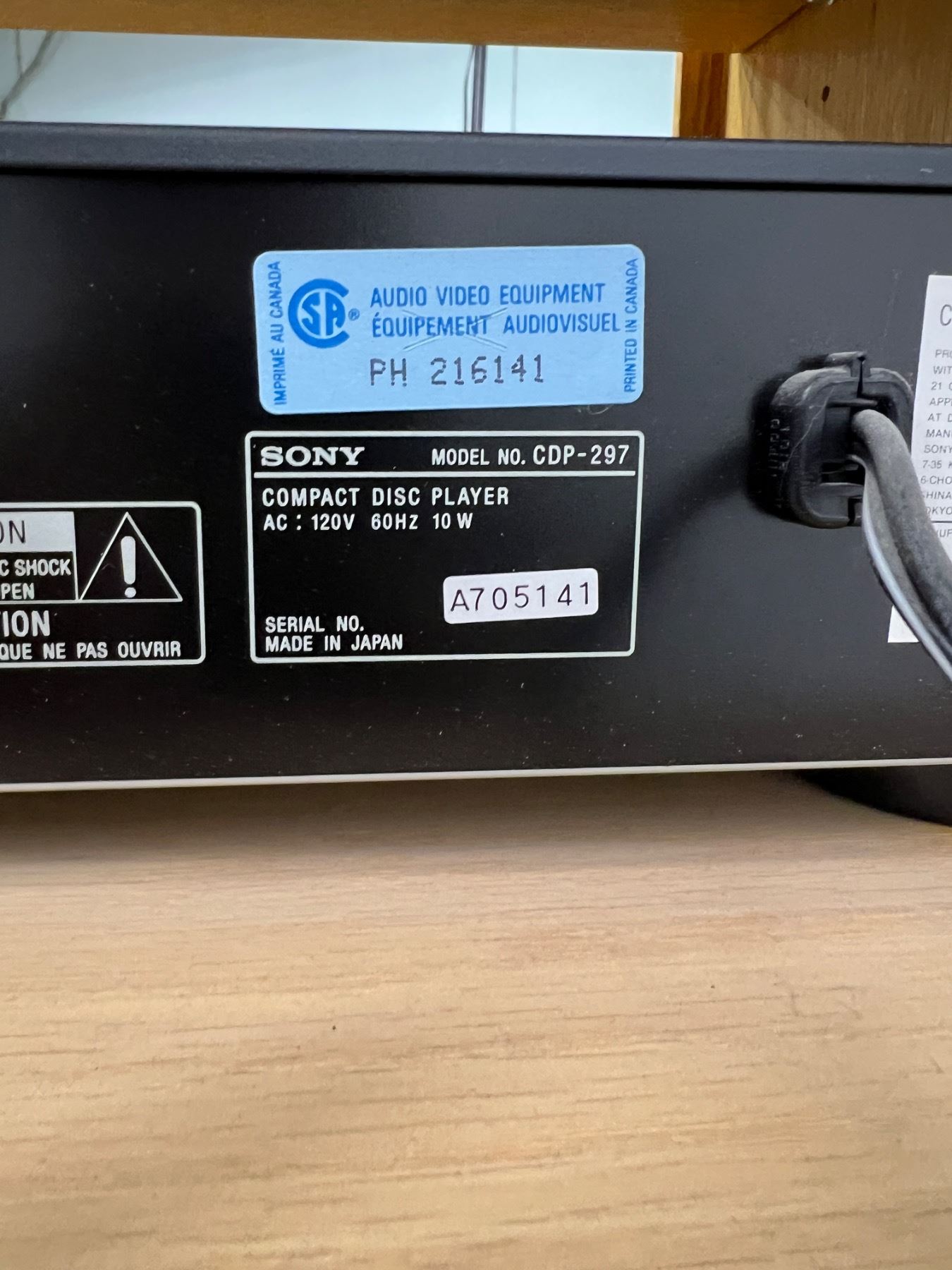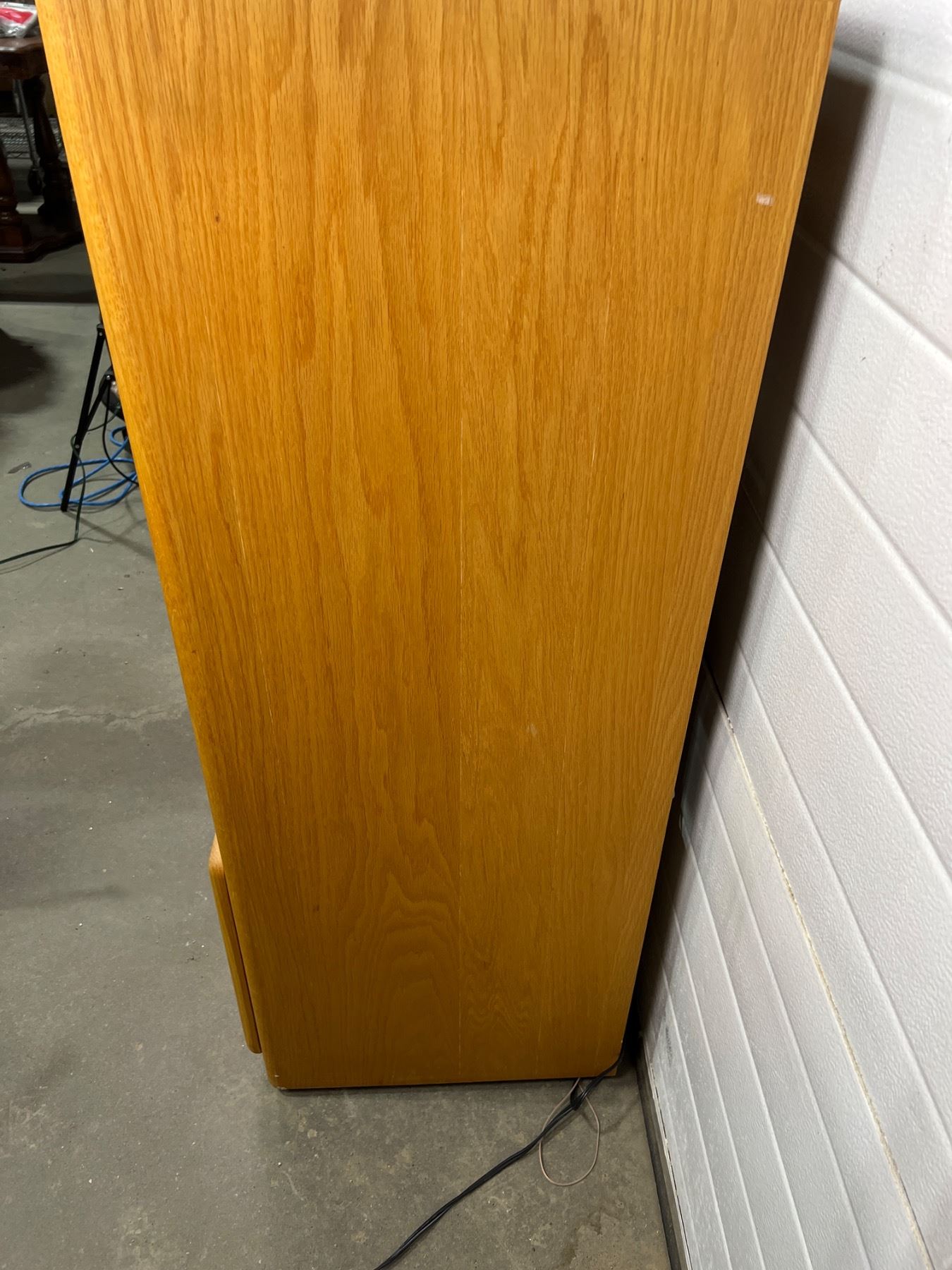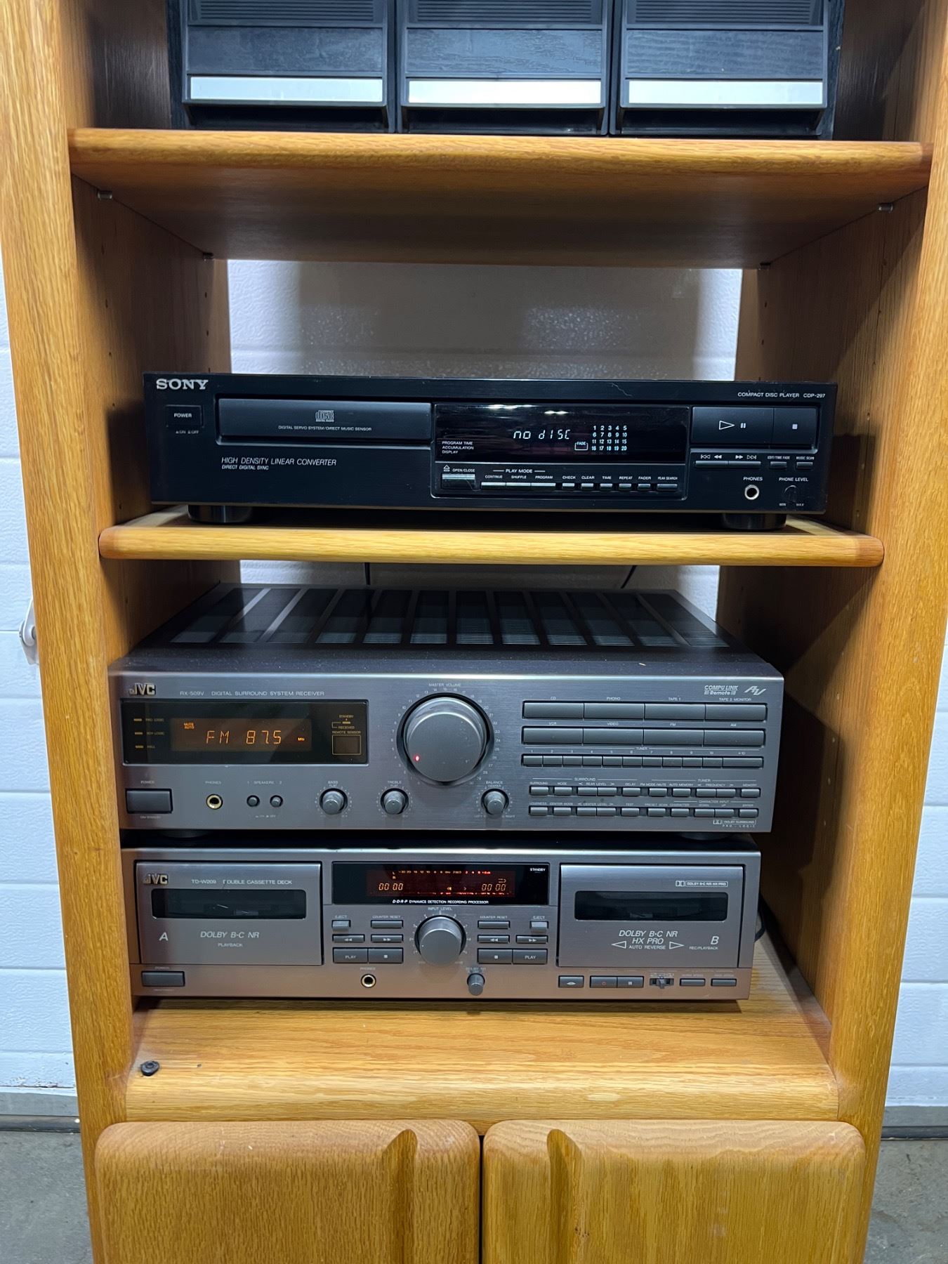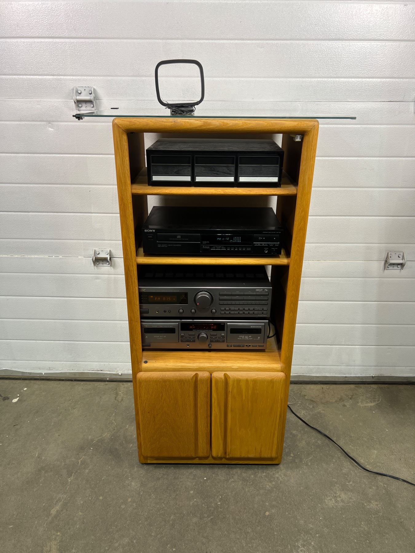 21W x 18D x 48H. All units power on and Model No. are in order on shelf: Sony CDP-297, JVC RX-509VTN, and JVC TD-W209. Cabinet has damage to wood panel on top, broken off and glued on. Will come off. Door has bottom hinge broken and small corner of glass broken.