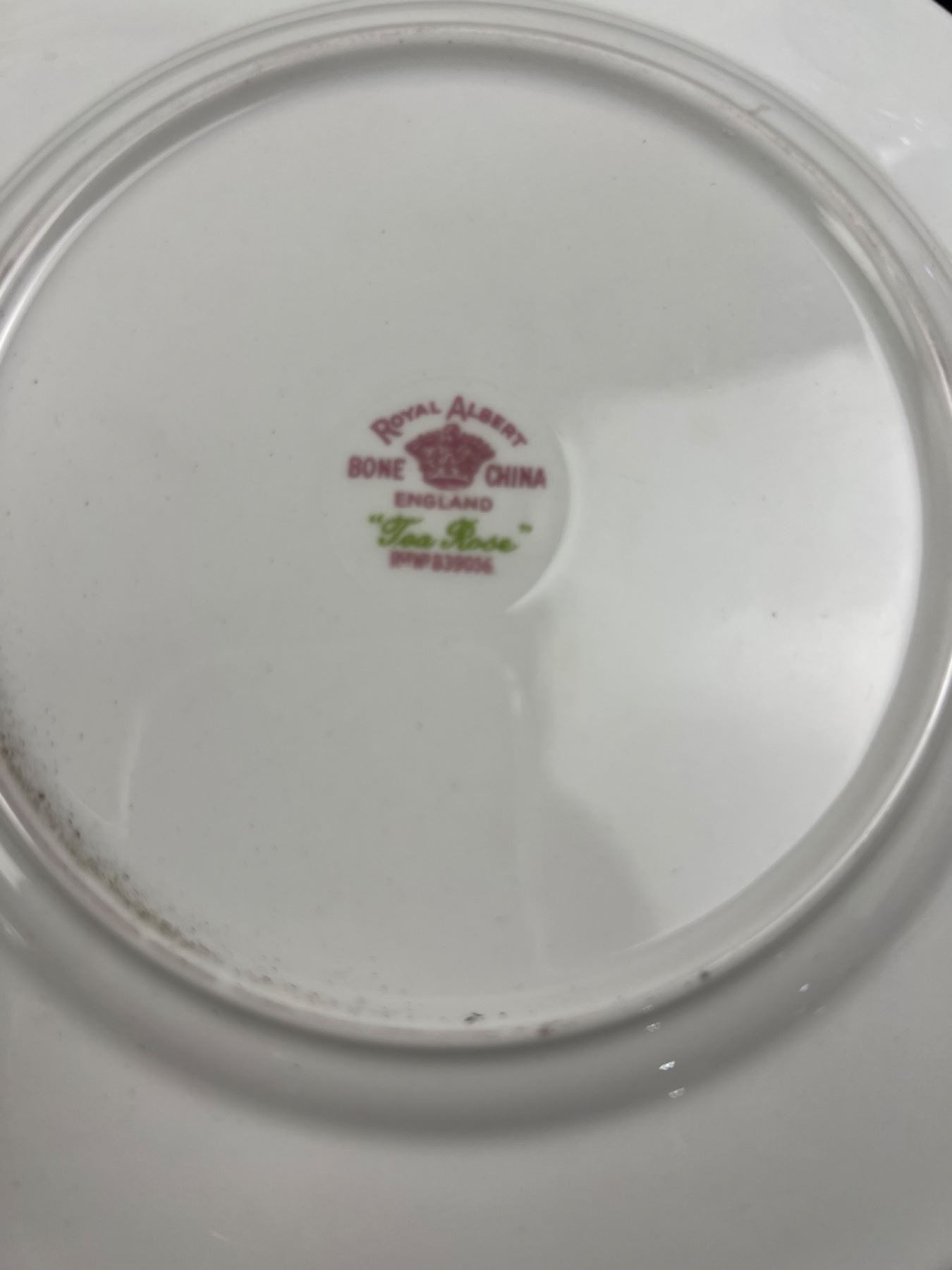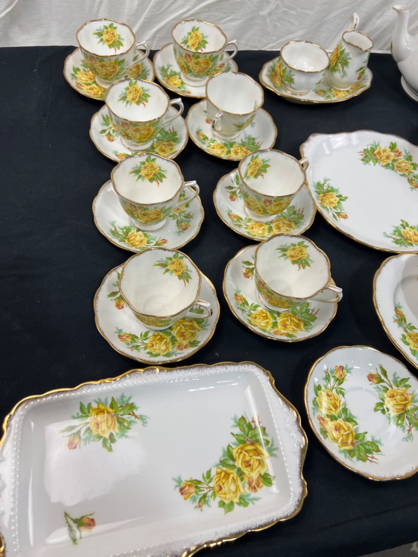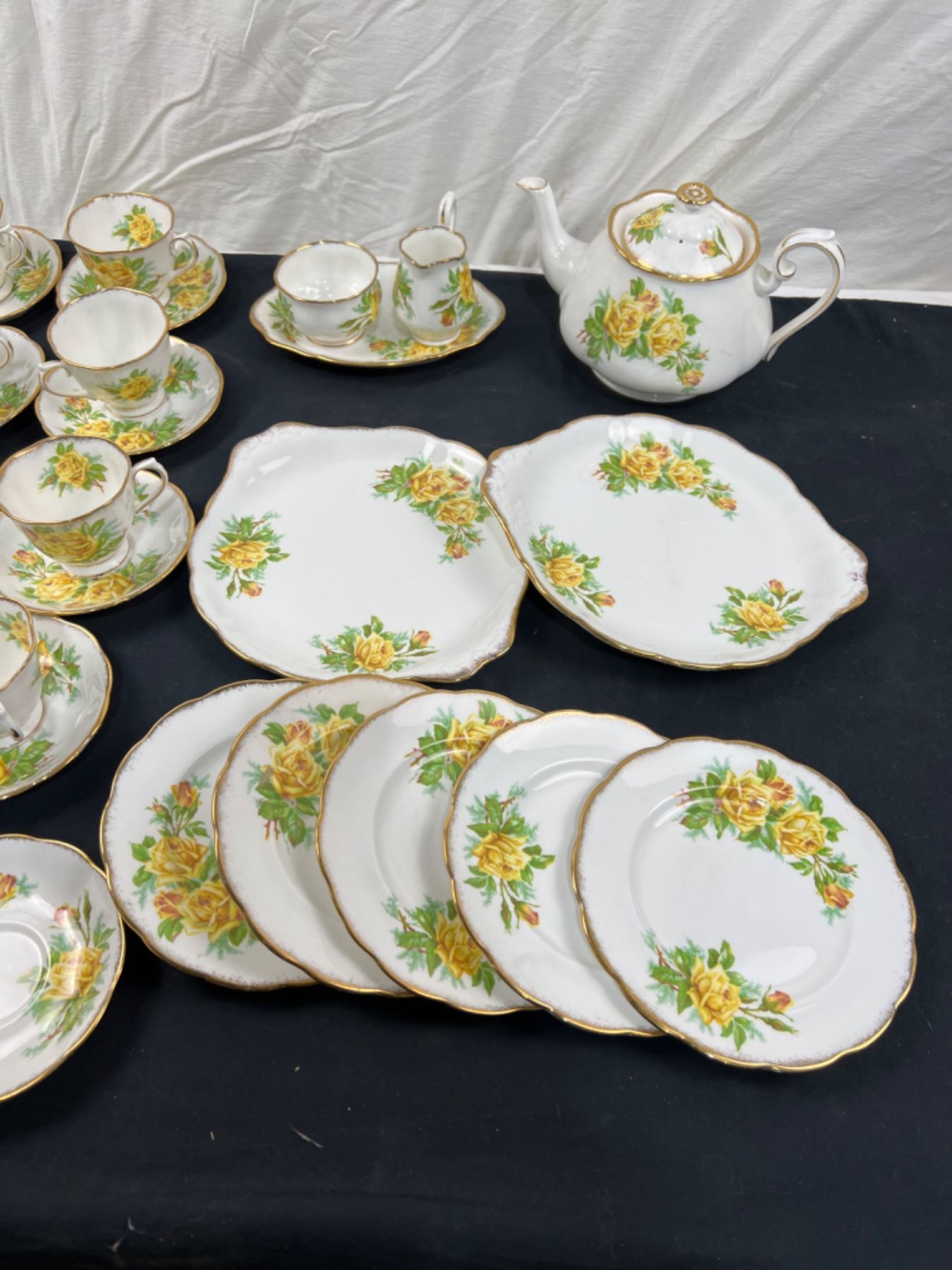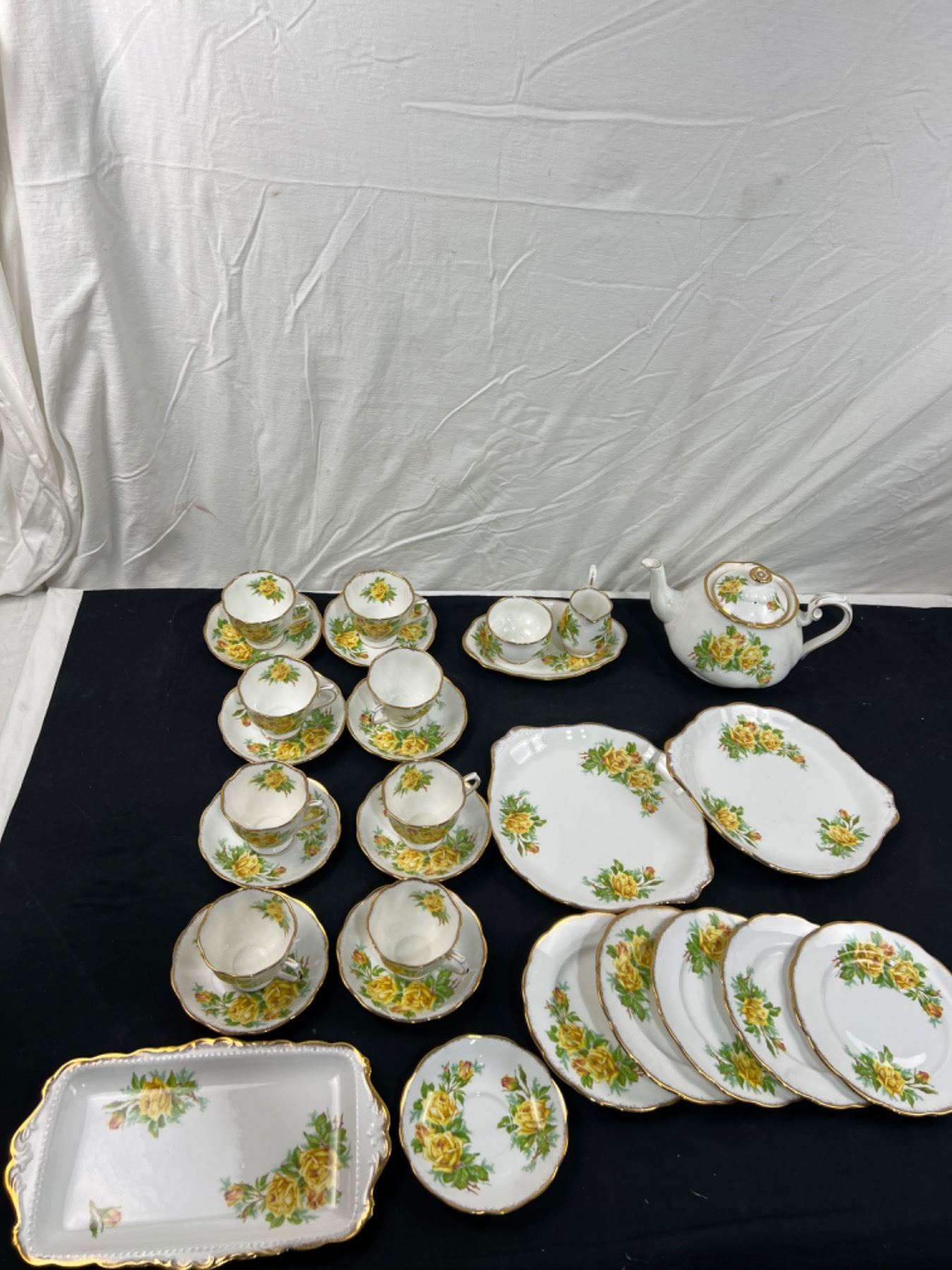 Includes 8 Tea Cups, 9 Saucers, Cream & Sugar Bowl with Tray, 5 Side Plates, 3 Serving Plates & Tea Pot