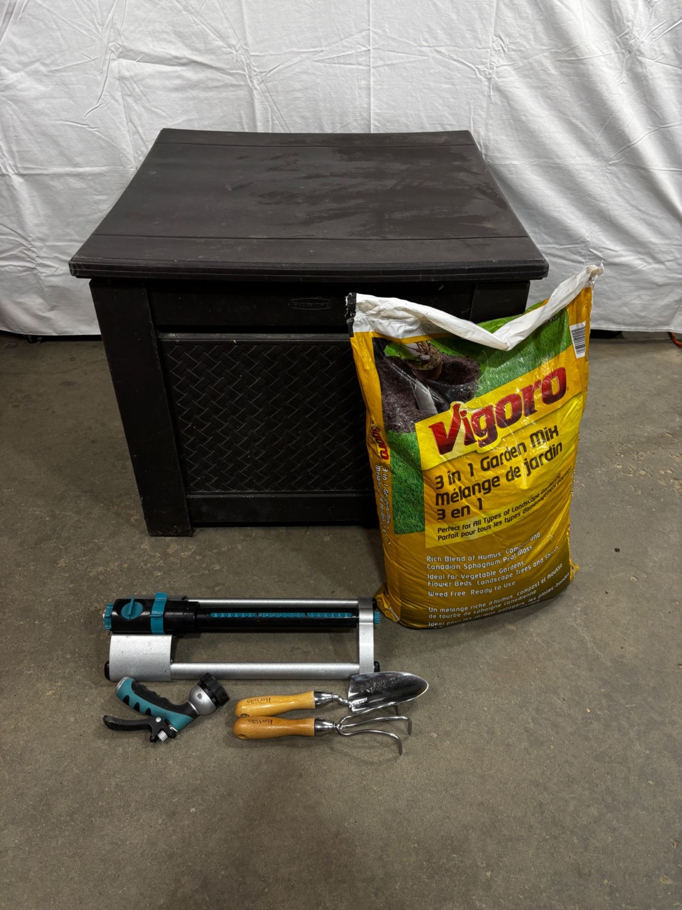 Includes, New bag of Vigoro 3 in 1 Garden Mix, hose attachments, Lee Valley garden tools,