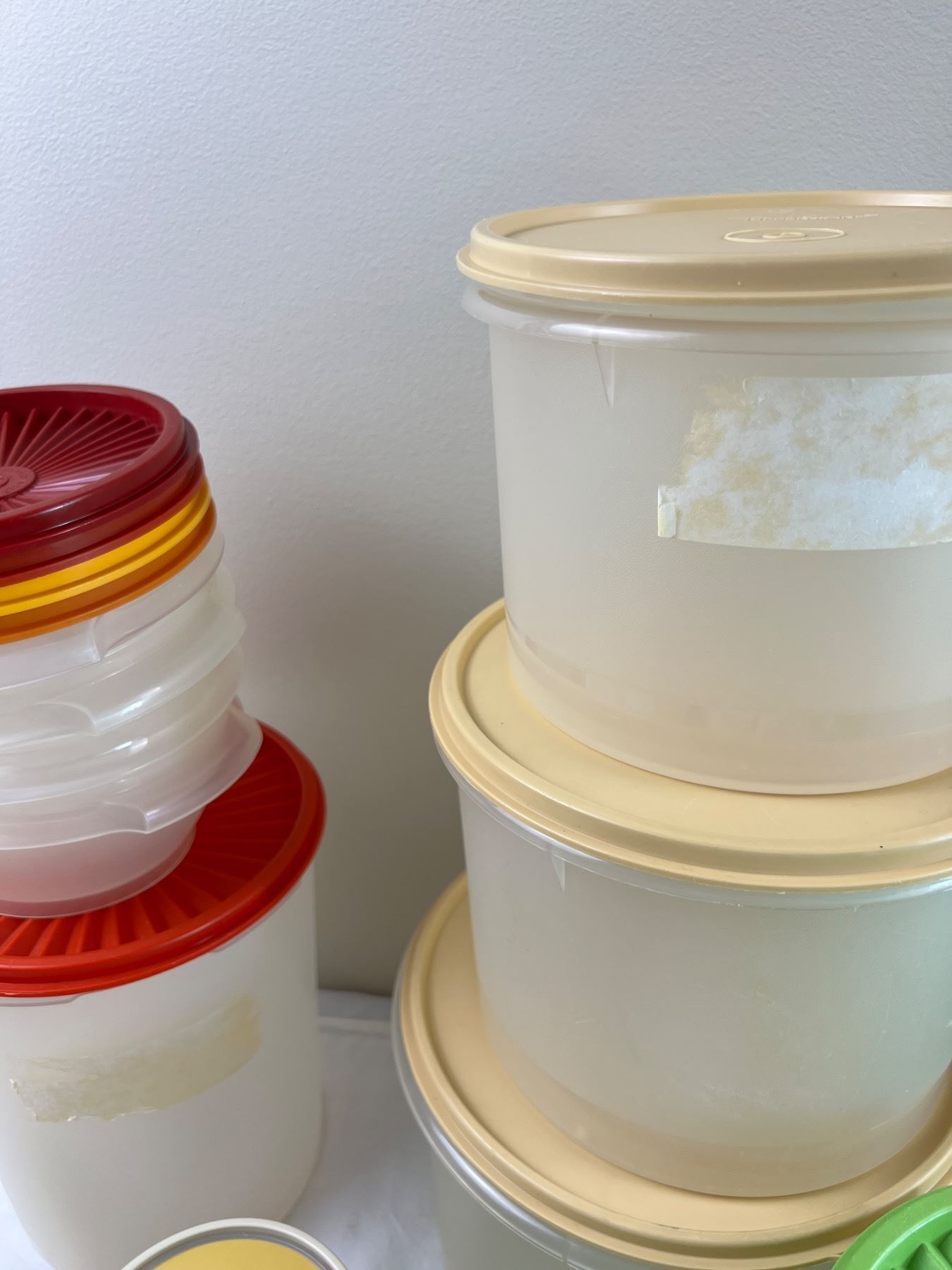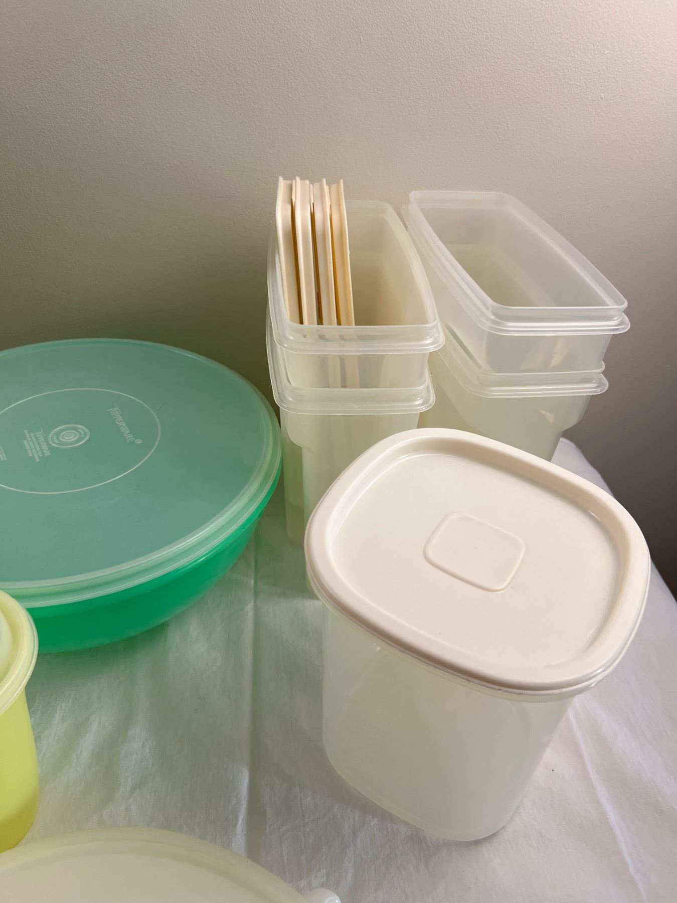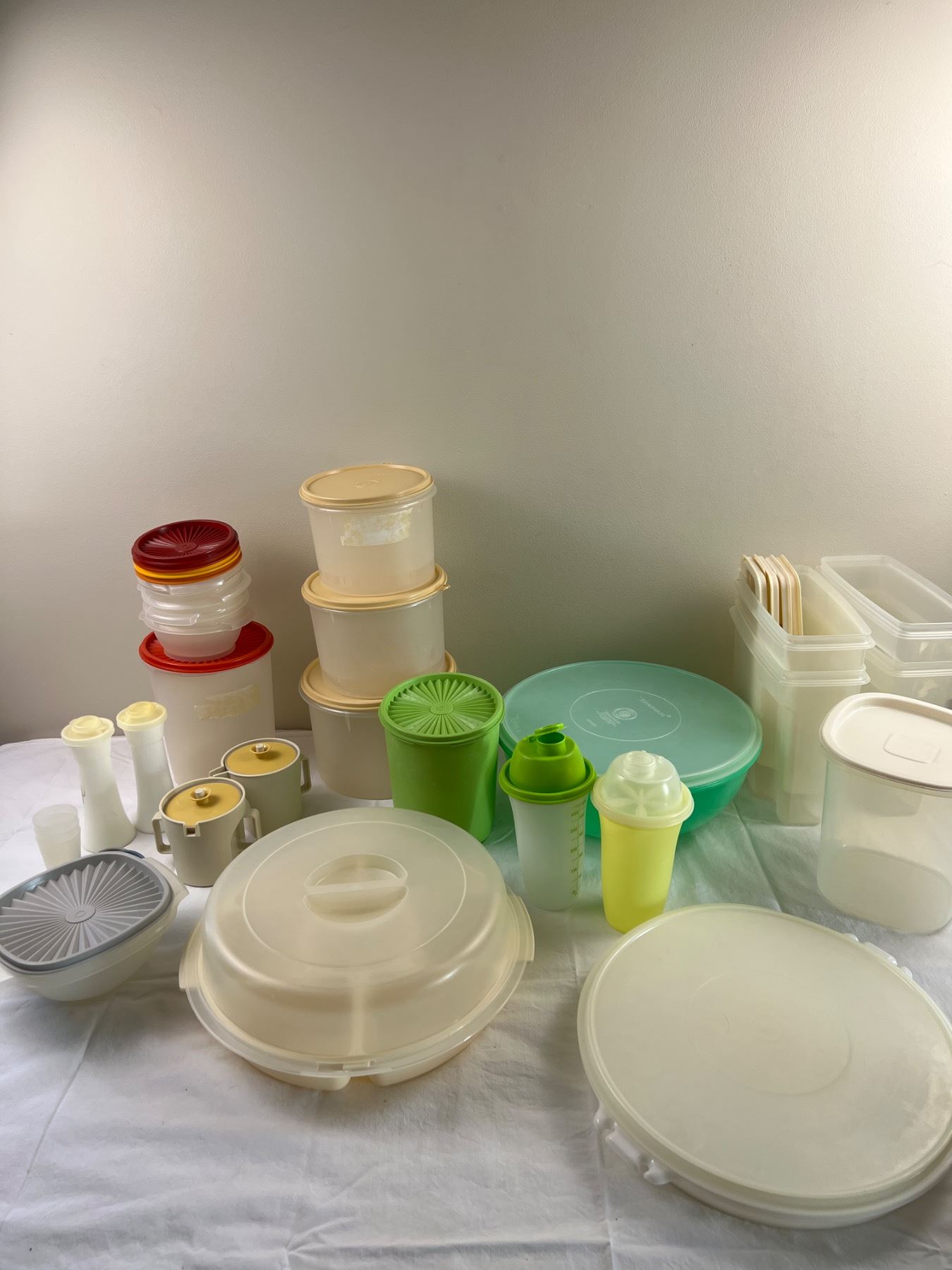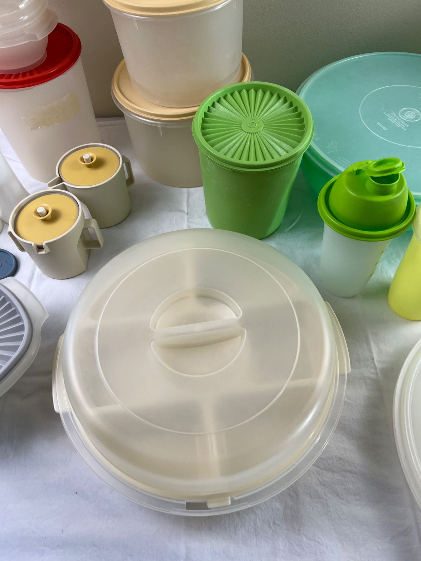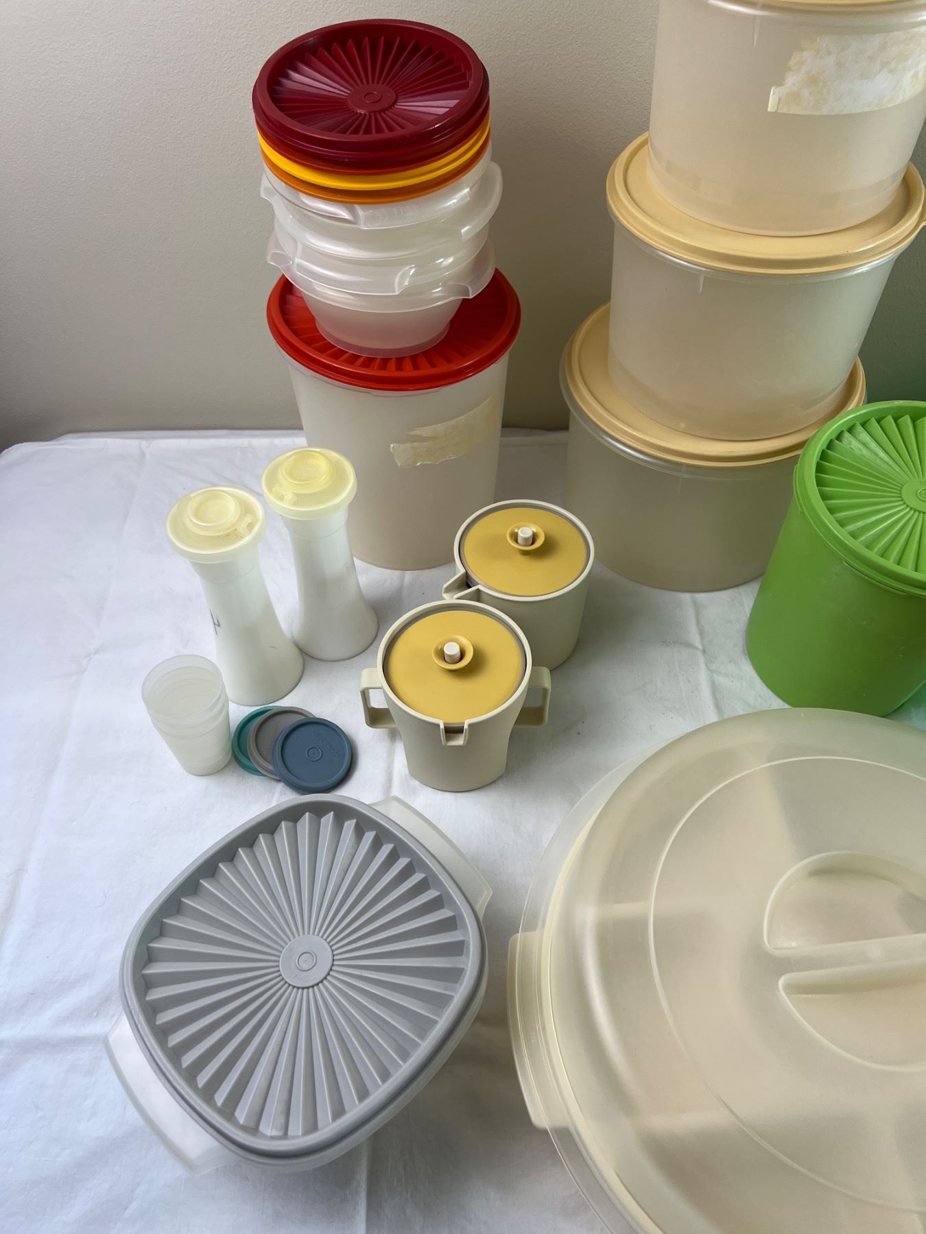 Some wear and tape residue on the containers, all pieces have corresponding lids, largest Tupperware bowl is 12.5"diameter