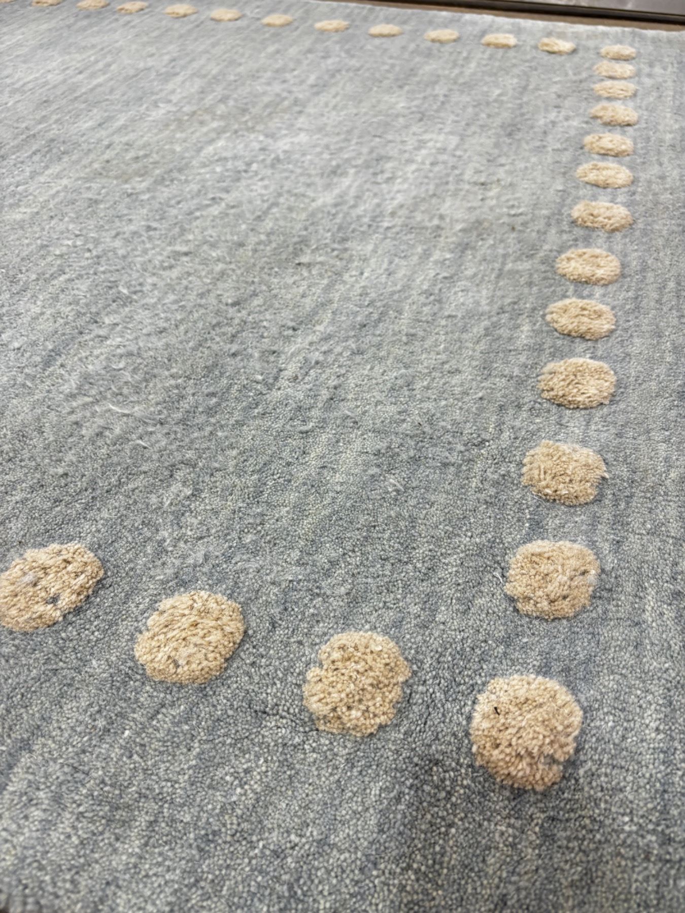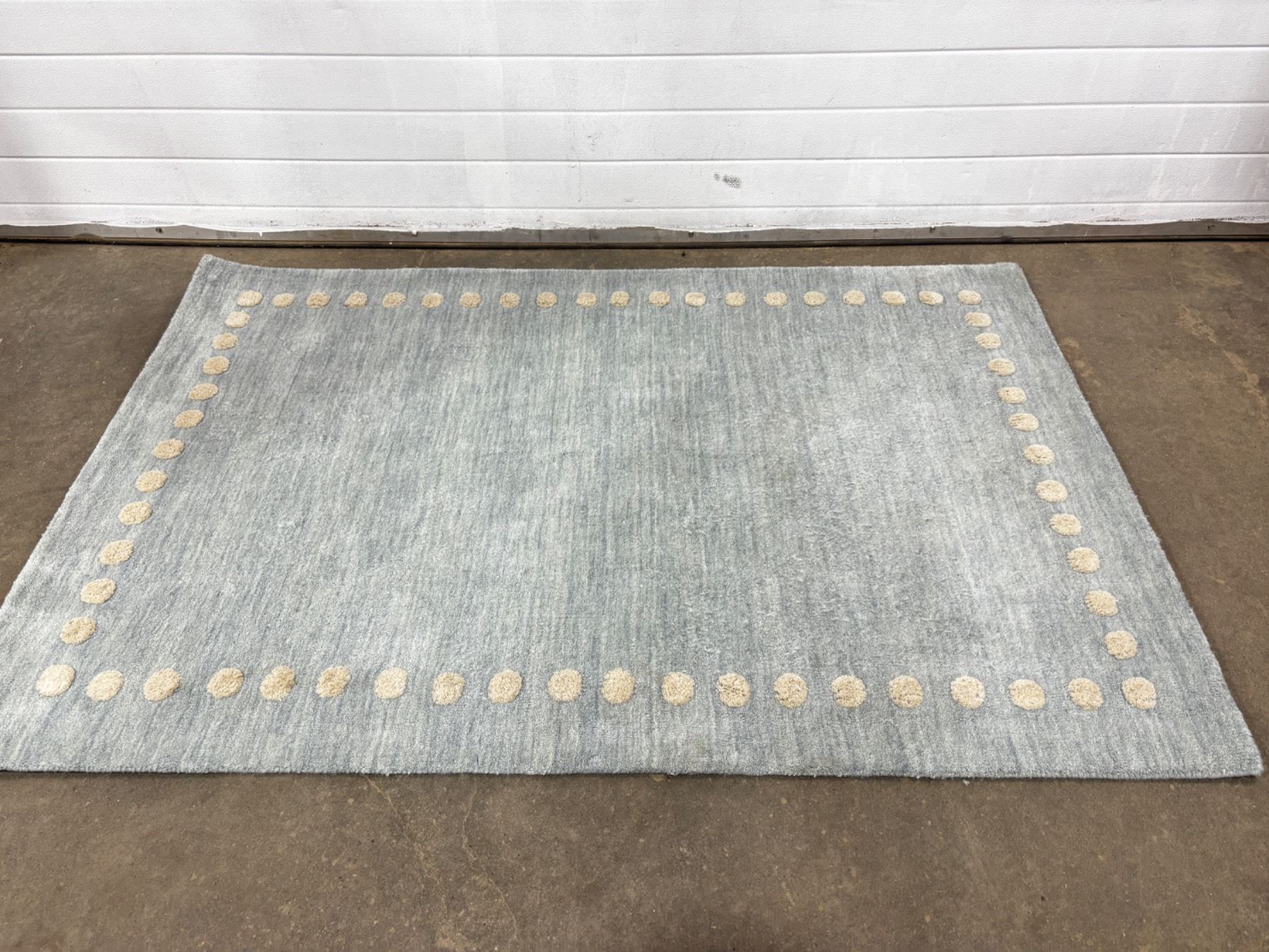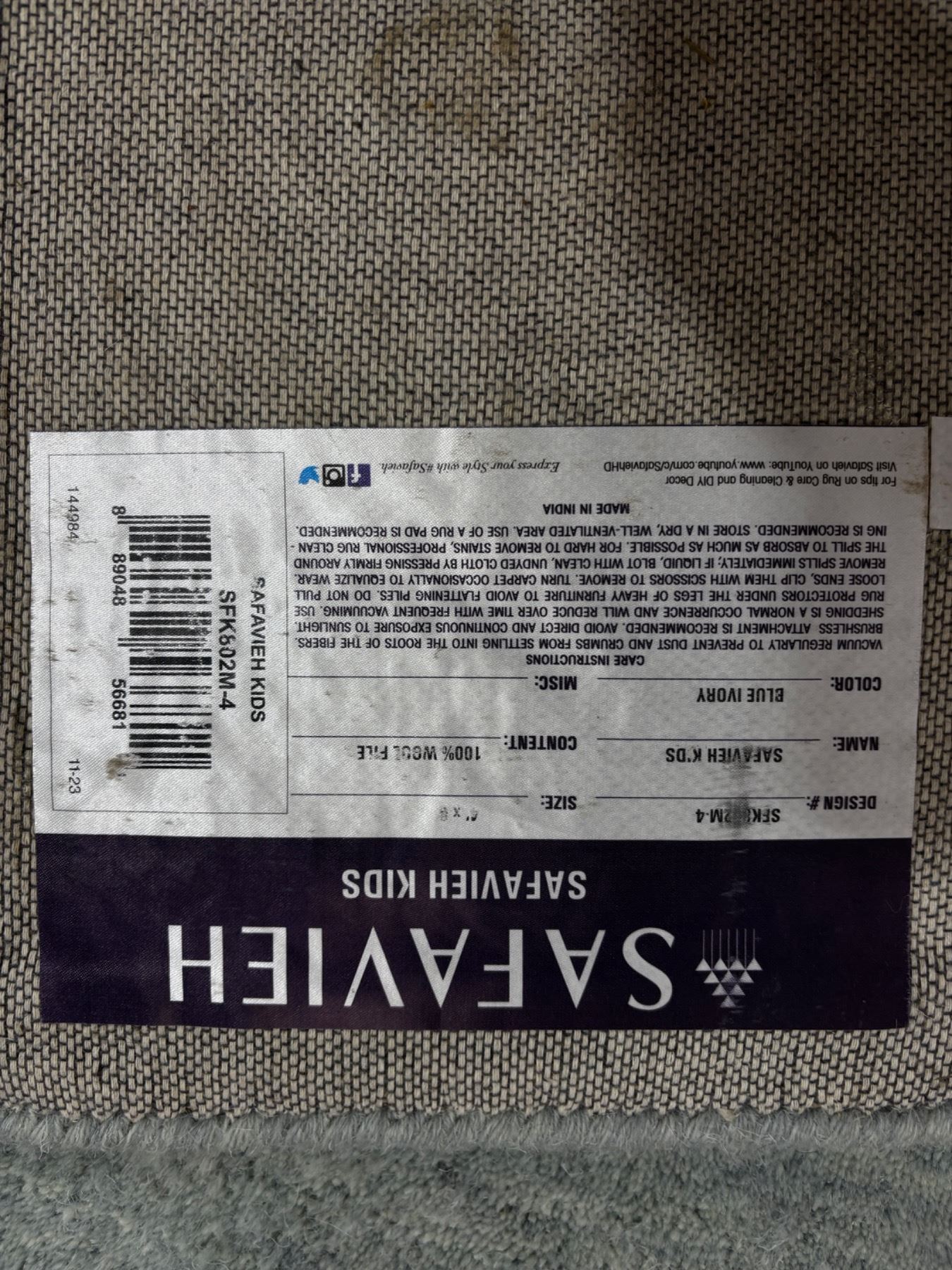 100% wool. 4' by 6' rug. Needs some spot leaning. Fraying to central surface. Some stains on back.