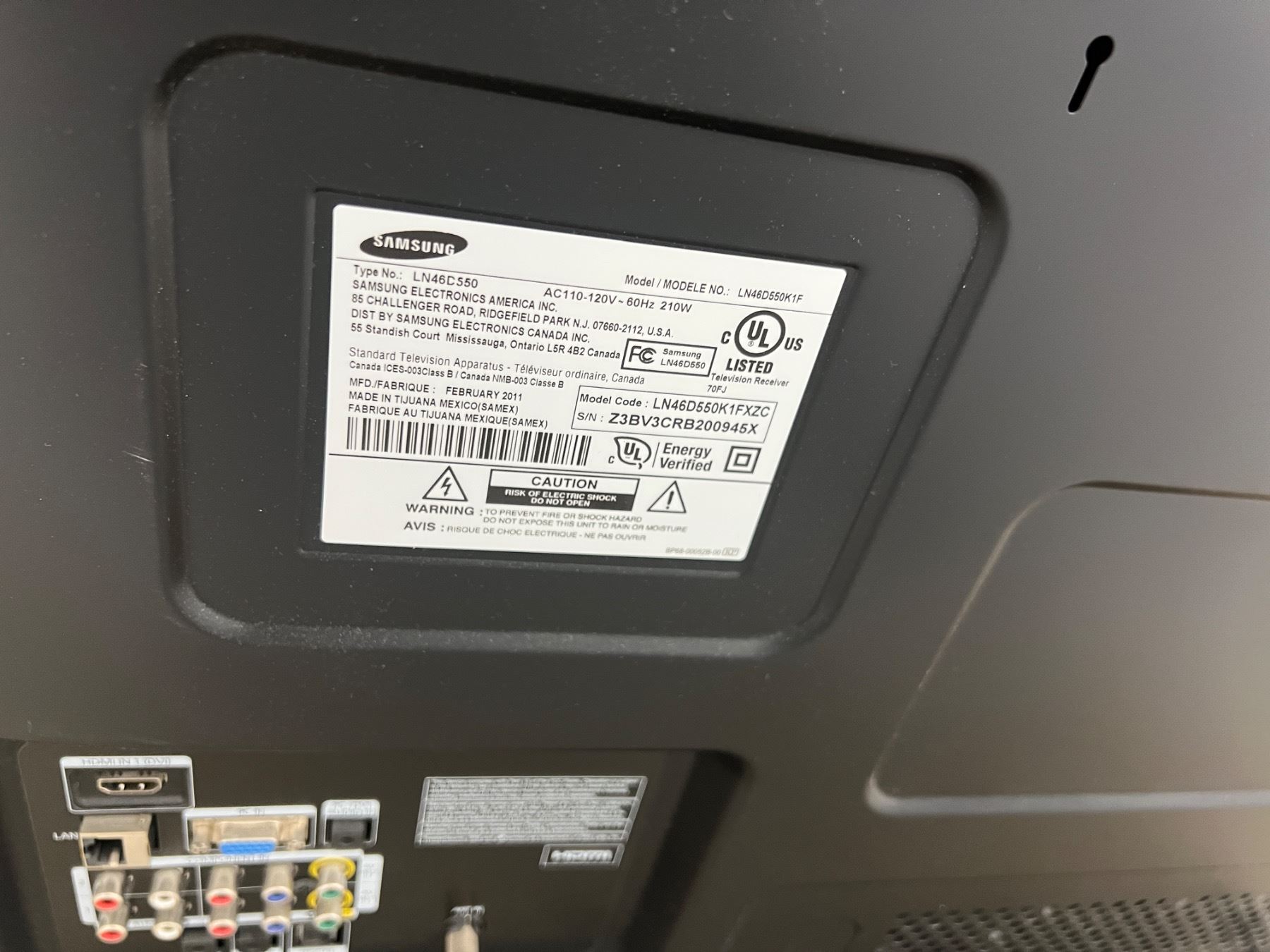 Powers on, no remote, Model No. LN46D550K1FXZC