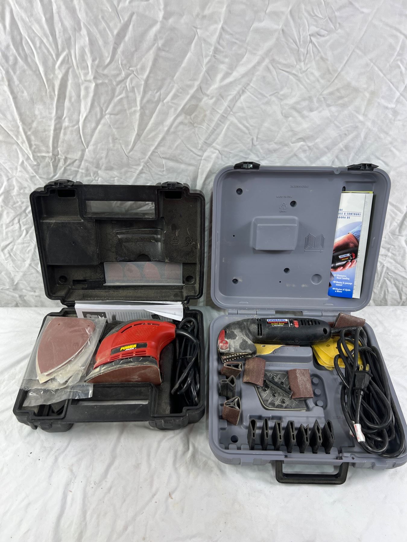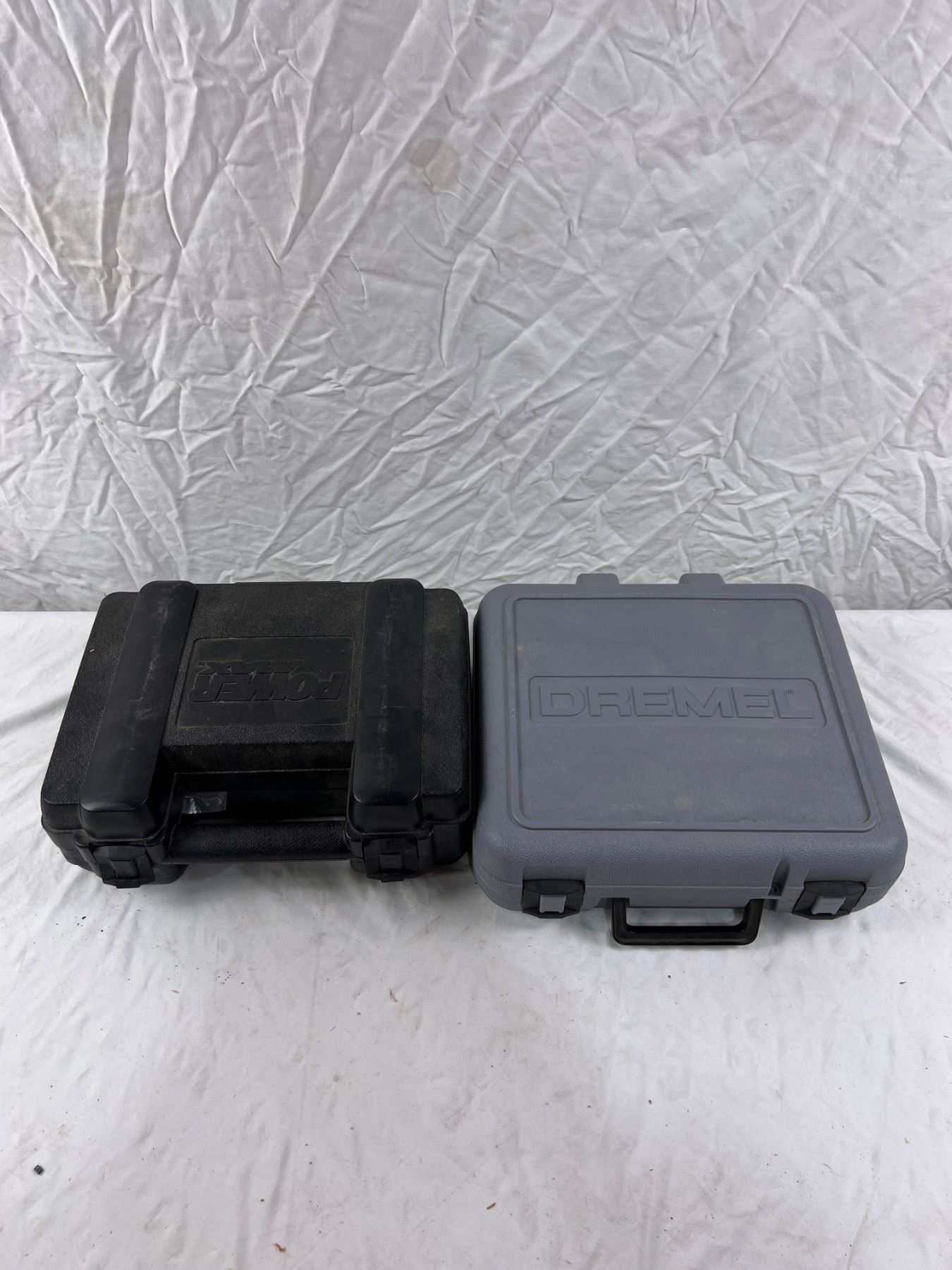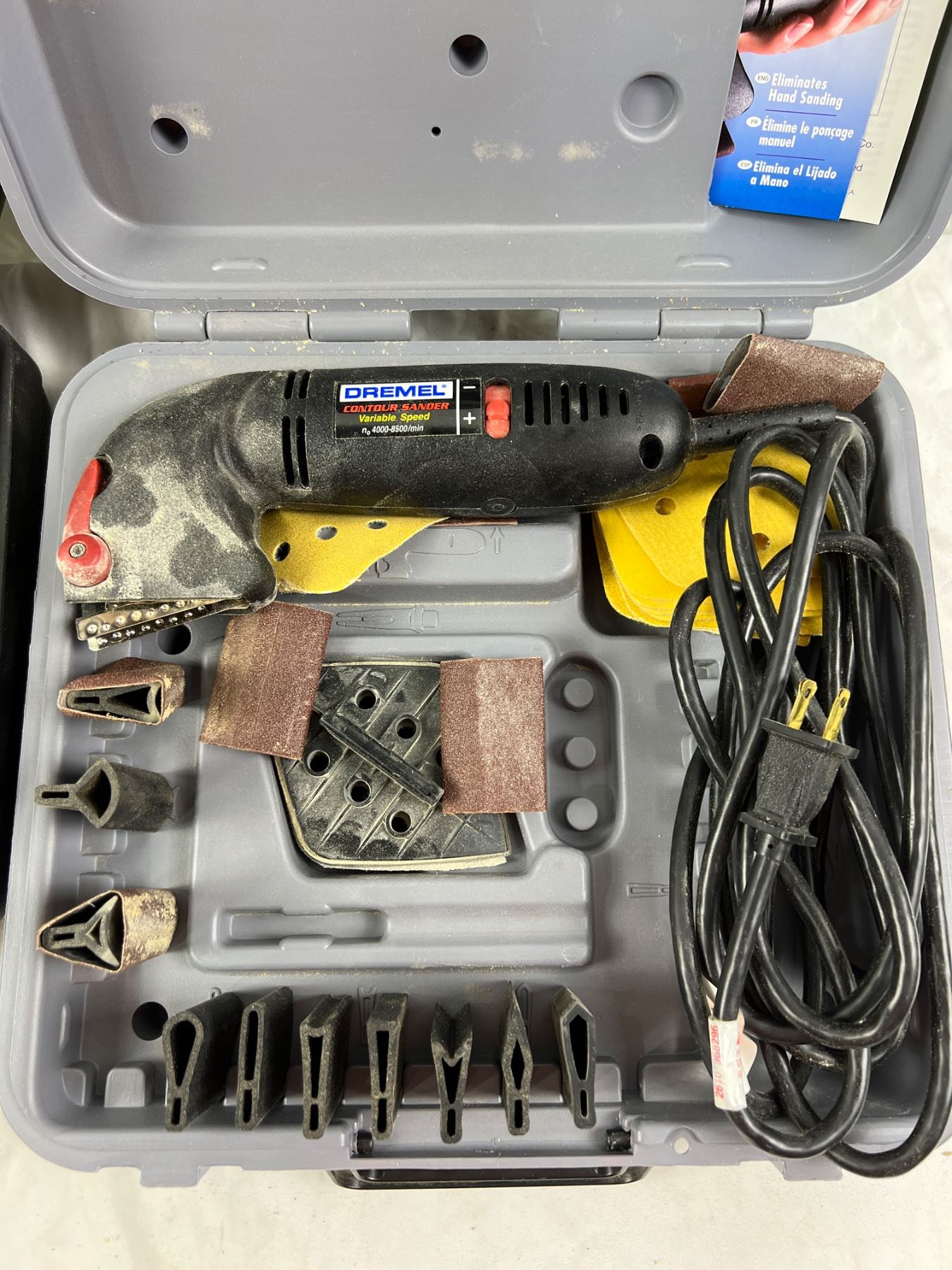 Both tools power on. Both have sawdust stains but Dremel piece also has white stains of some kind.