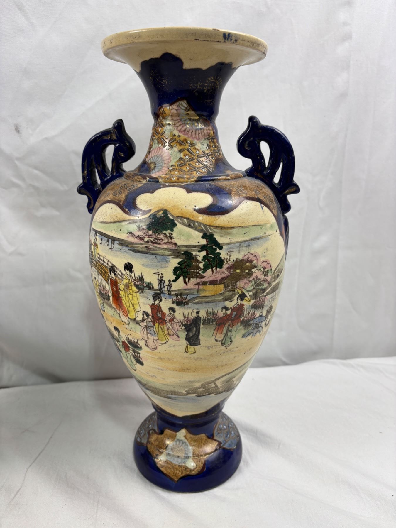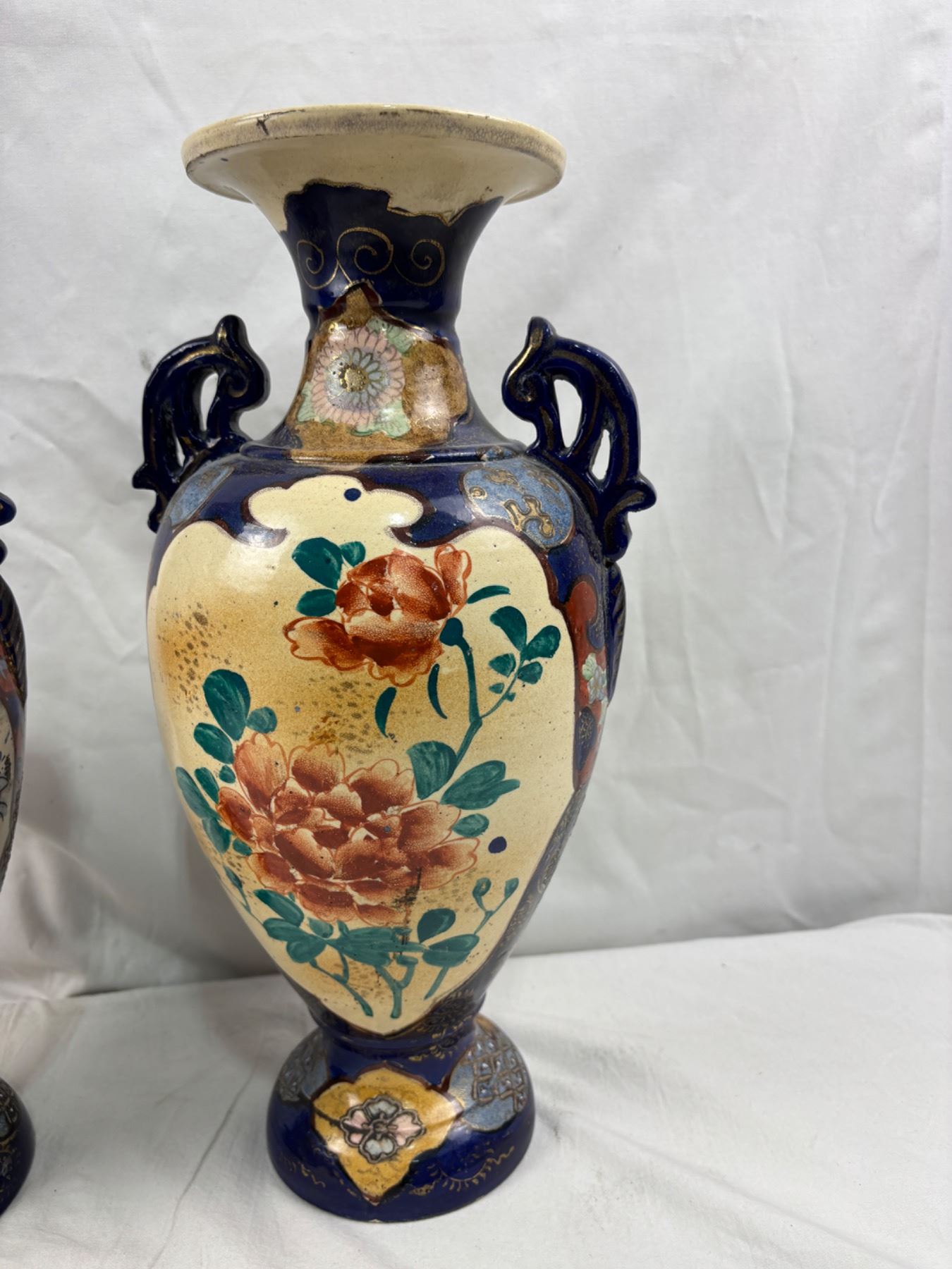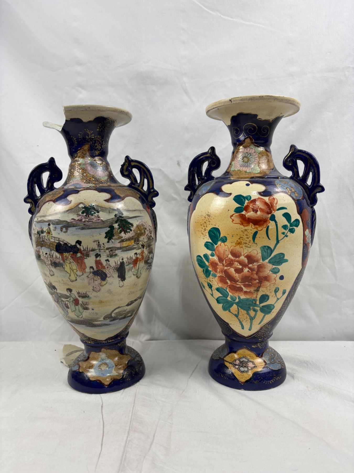 One of the rims has a piece chipped off (can be re-glued), each vase is 16"H