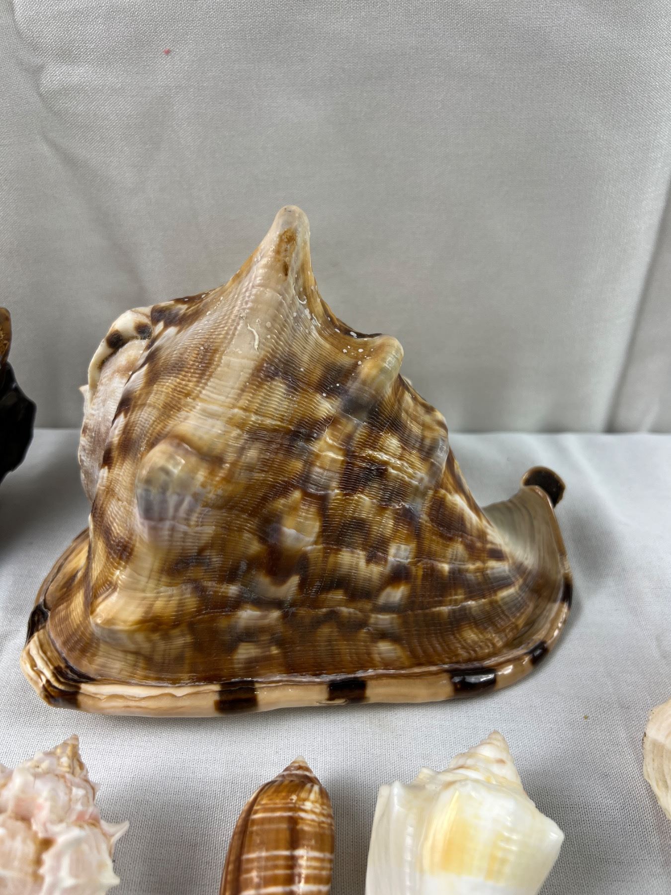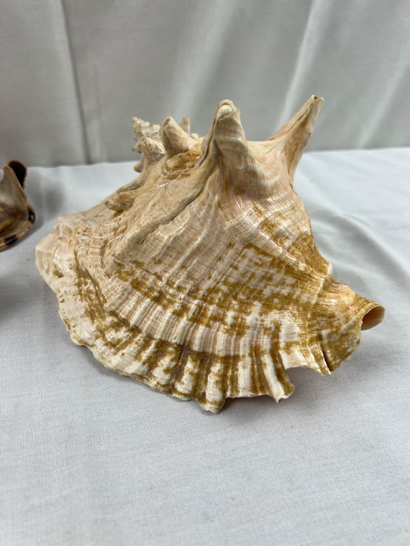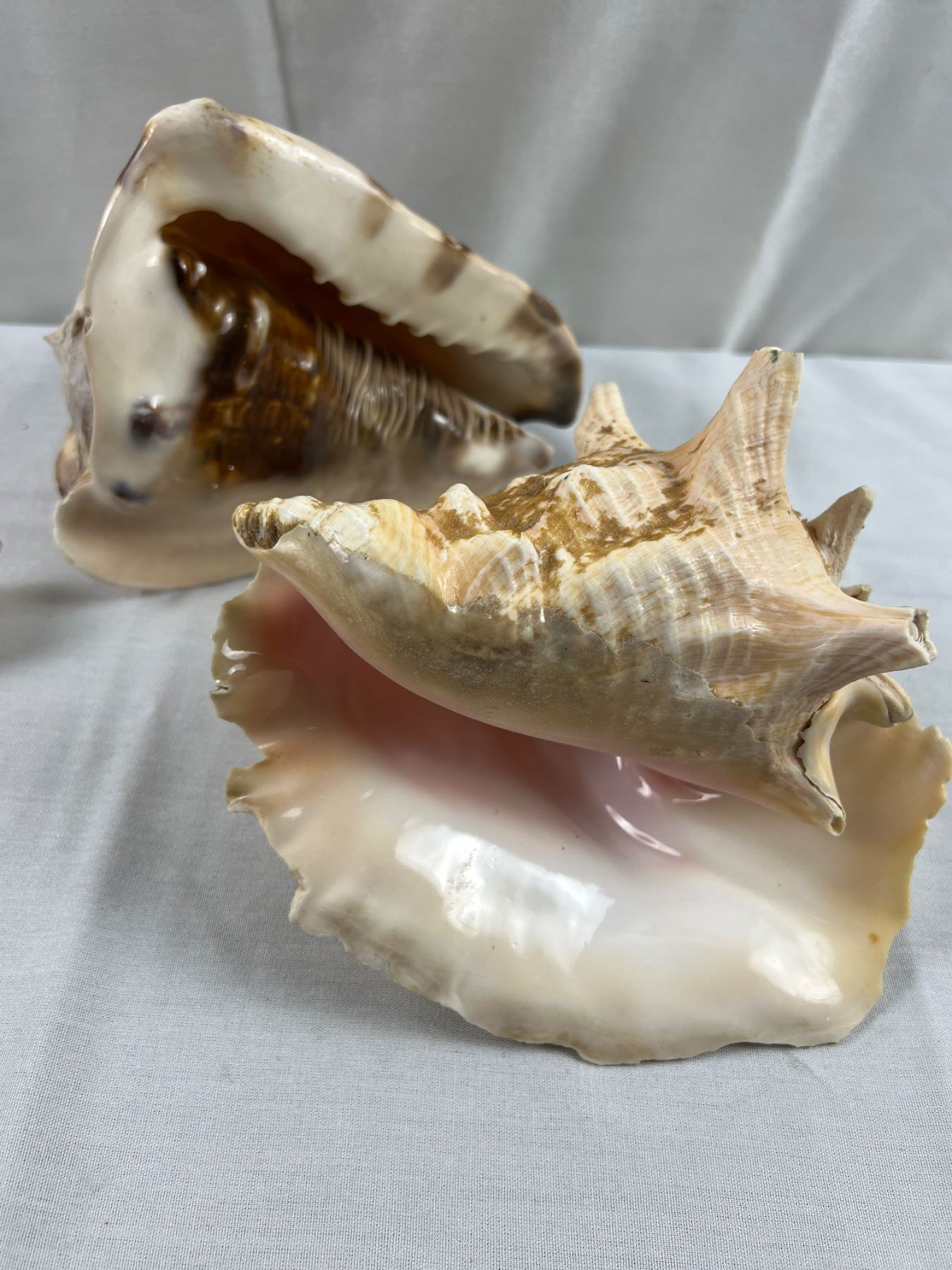 The two conch shells are aproximately 7"L x 7"W x 5"H, some chips on the shells