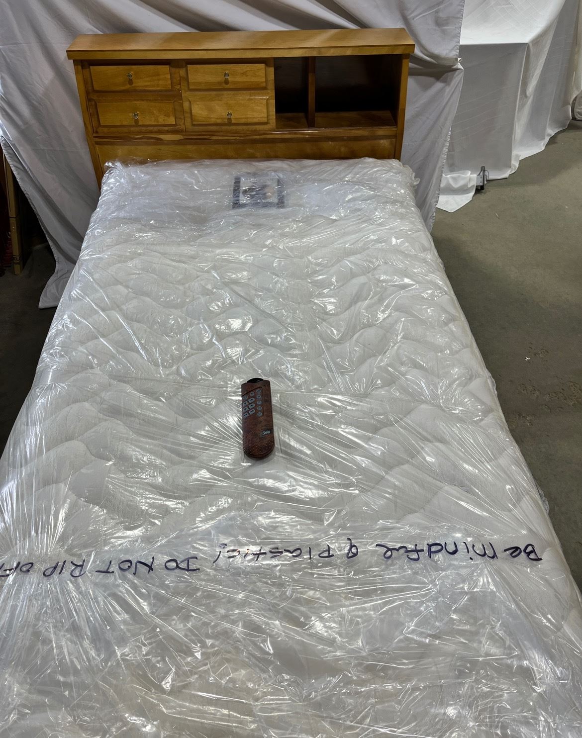 Functions include vibrate head and feet lift, etc. Not all functions have been tested, Bed Frame; Usine Rotec 80"L x 38"W, Mattress; Sealy Posturematic, Head Board; 41.5"L x 8.5"W x 36"H has scratches (includes glass top)