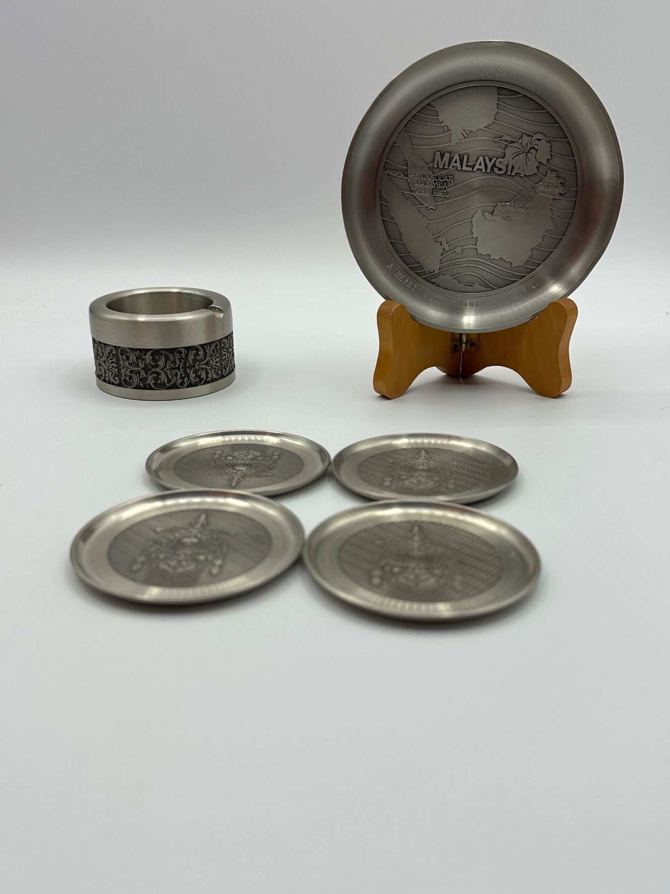 Including 4 coasters - ashtray - plate on wood stand