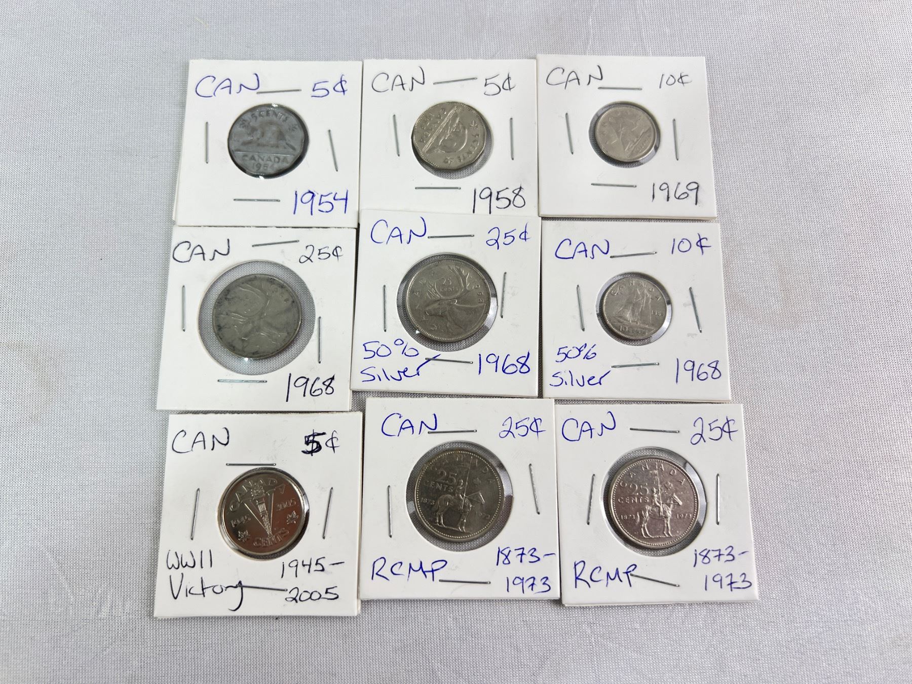 Set of 9 Canadian Collector Coins Including 2 RCMP 100th years, WWII Victory 50th Year, And 2 Coins from 1968