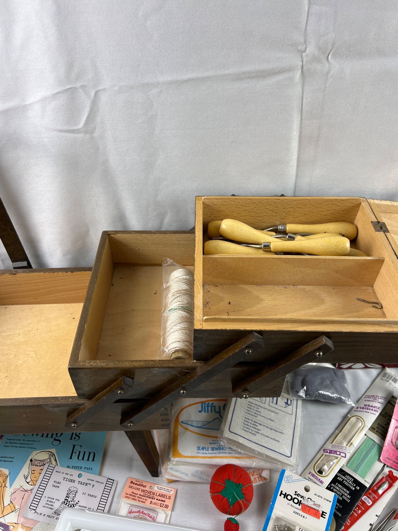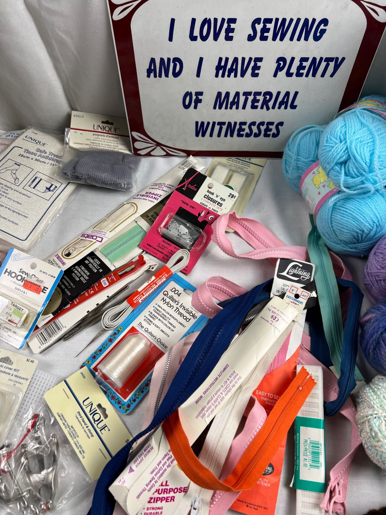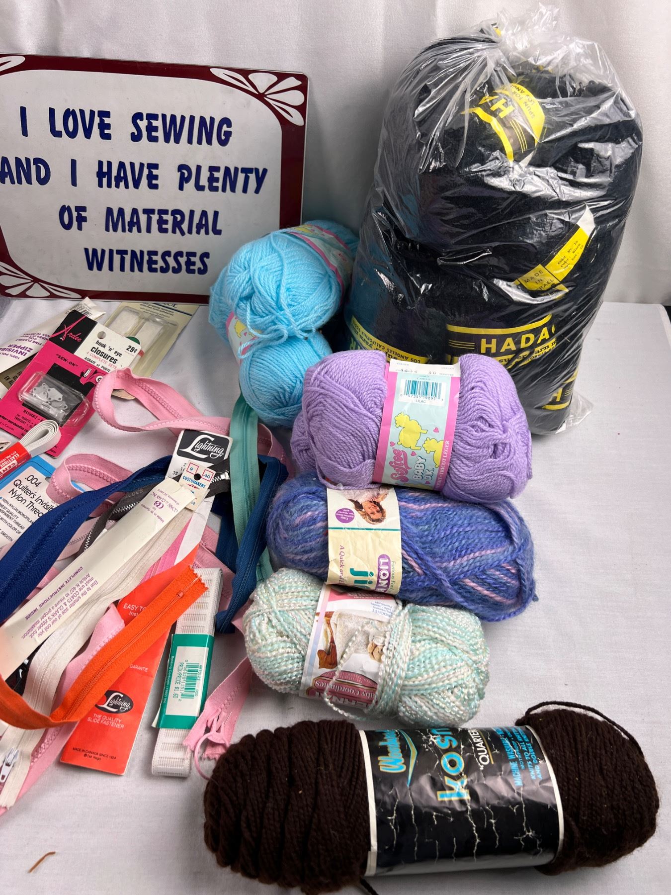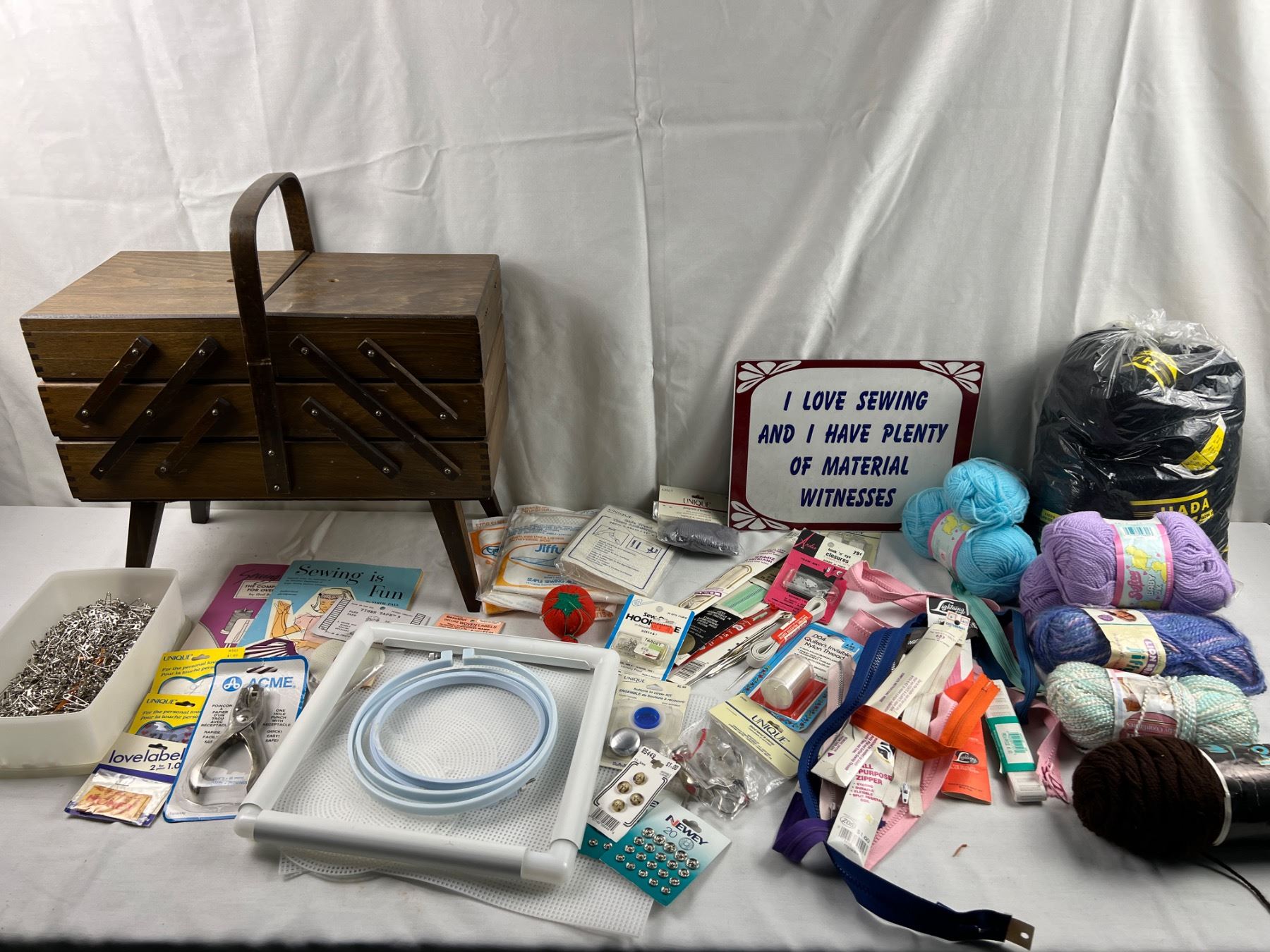 Includes a sewing box (missing the knobs) 17"L x 10"W x 18"H, variety of yarns, zippers, snap and hook closures, and more