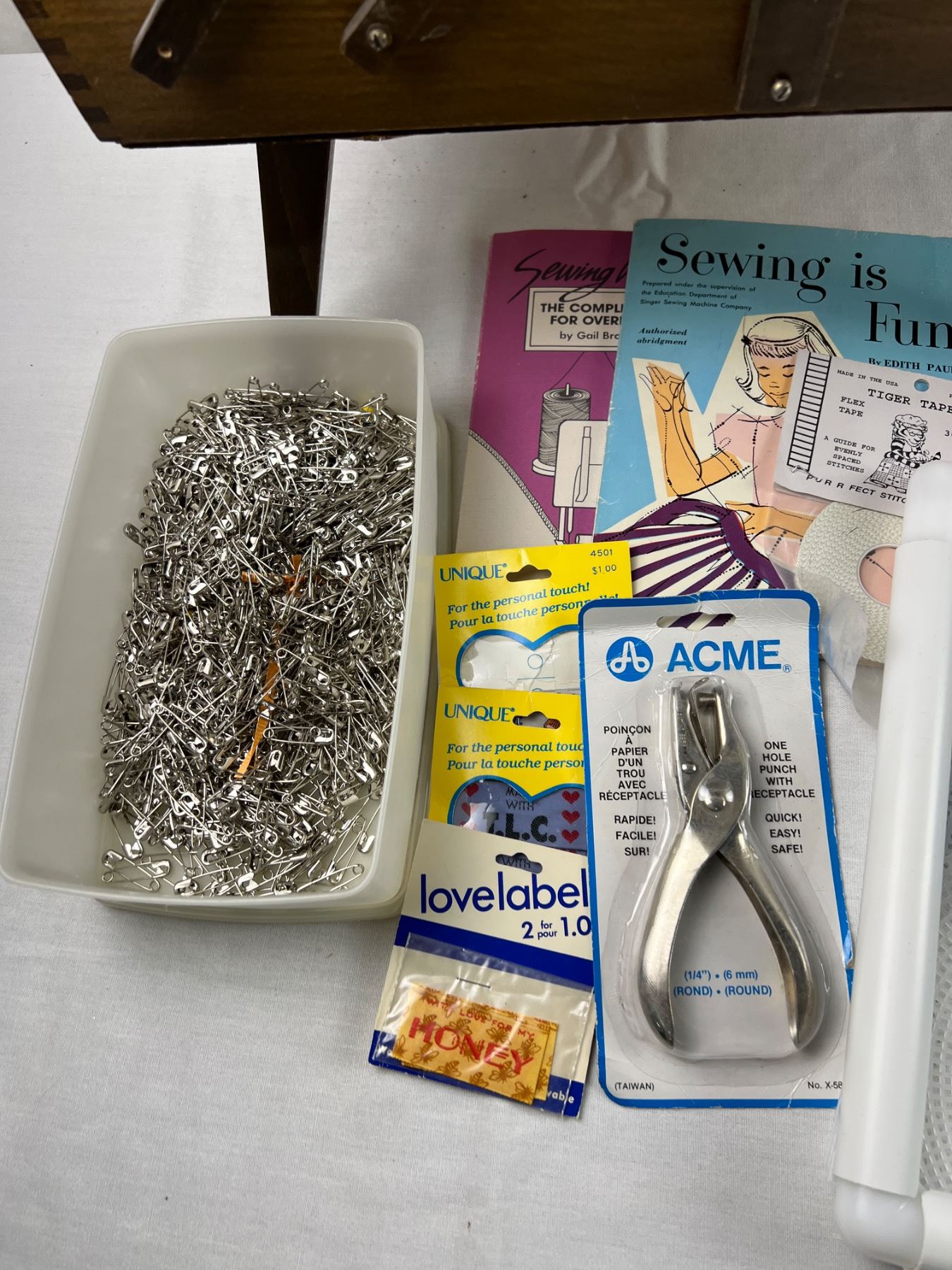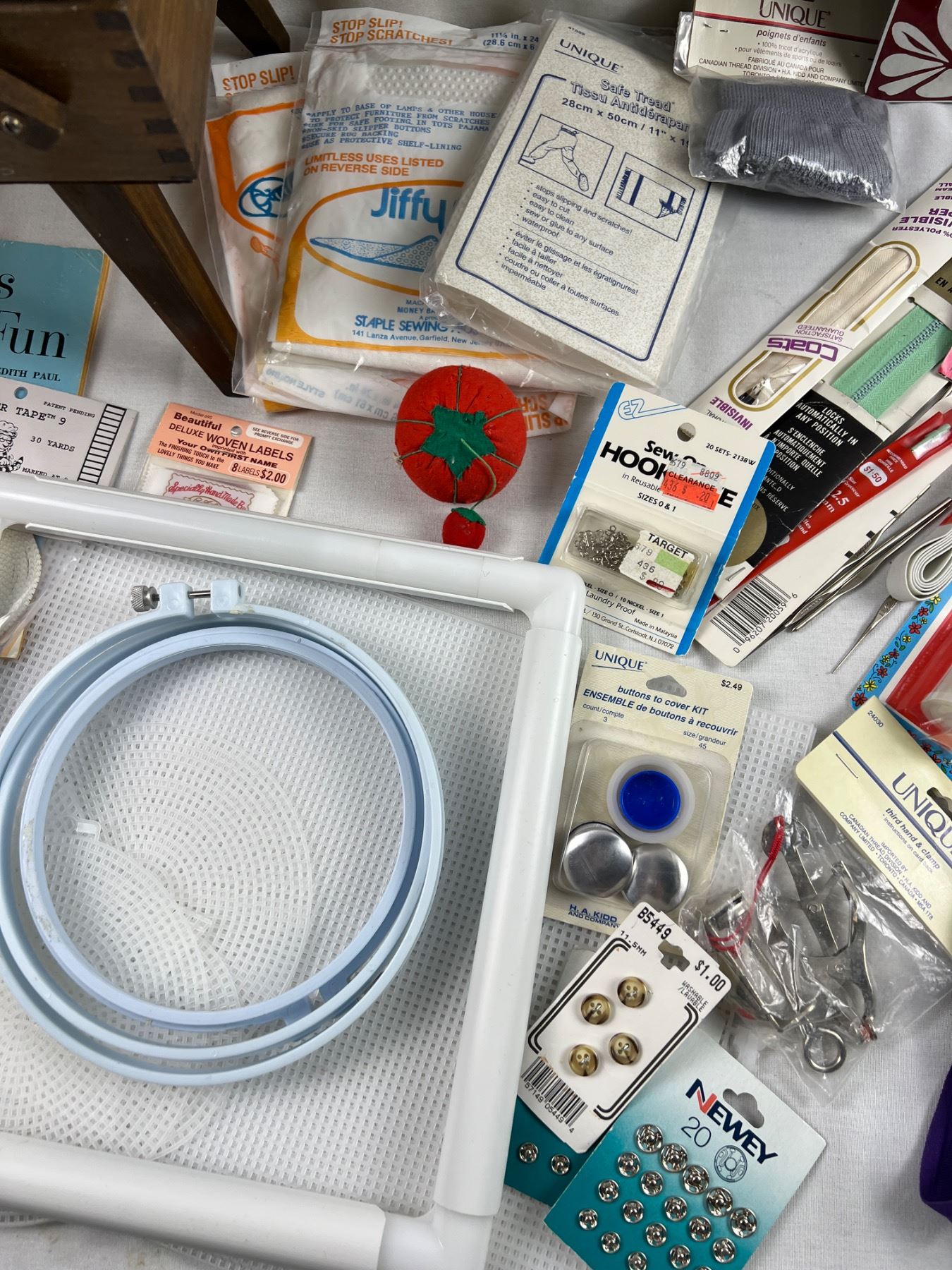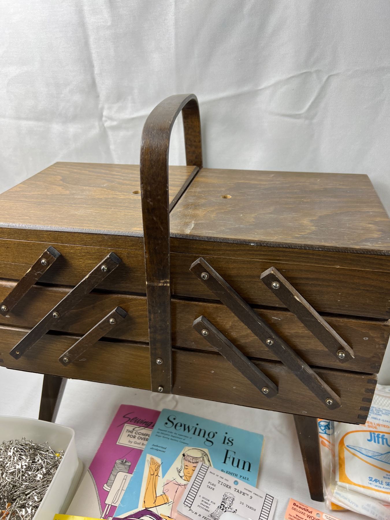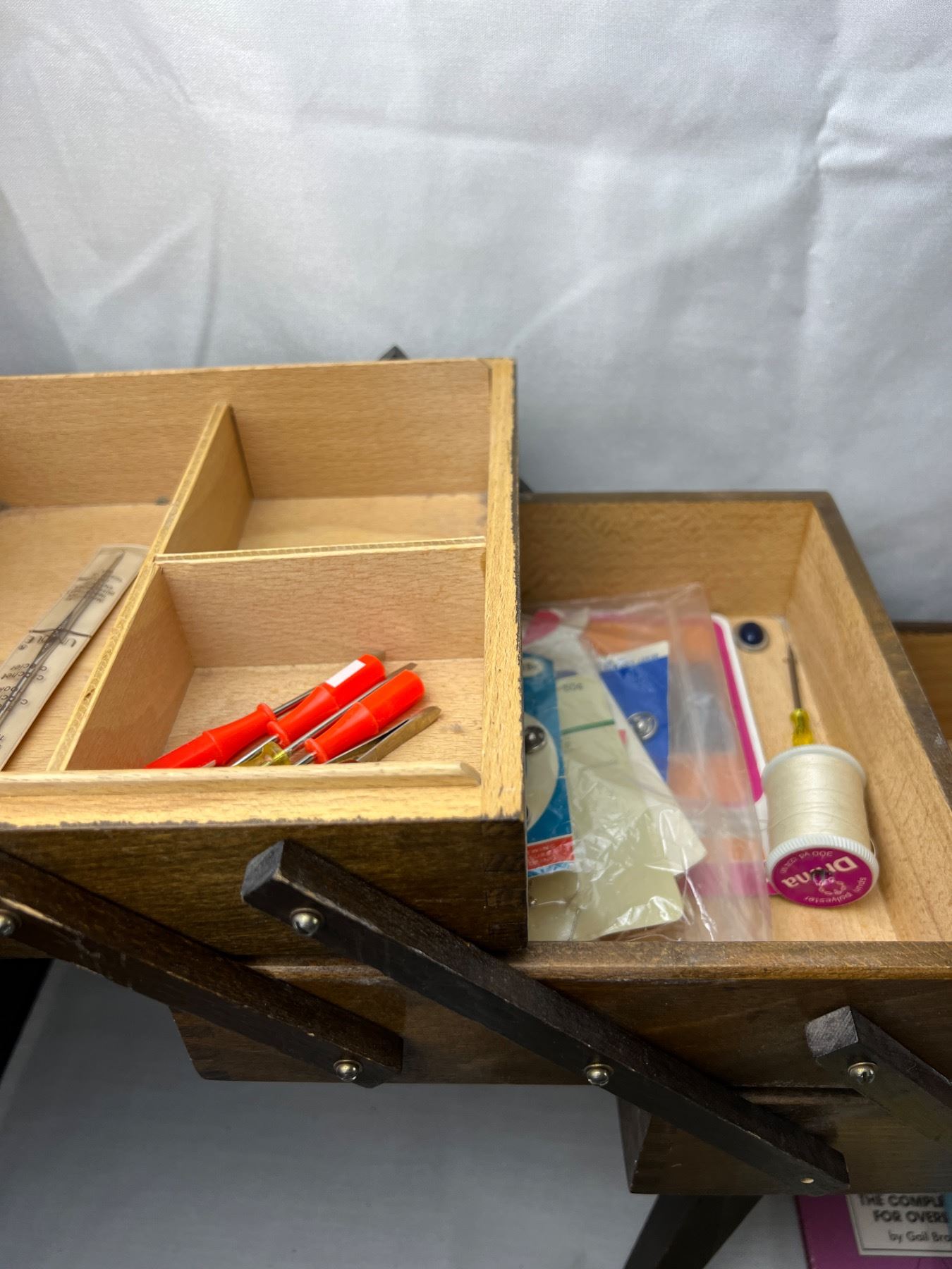 Includes a sewing box (missing the knobs) 17"L x 10"W x 18"H, variety of yarns, zippers, snap and hook closures, and more