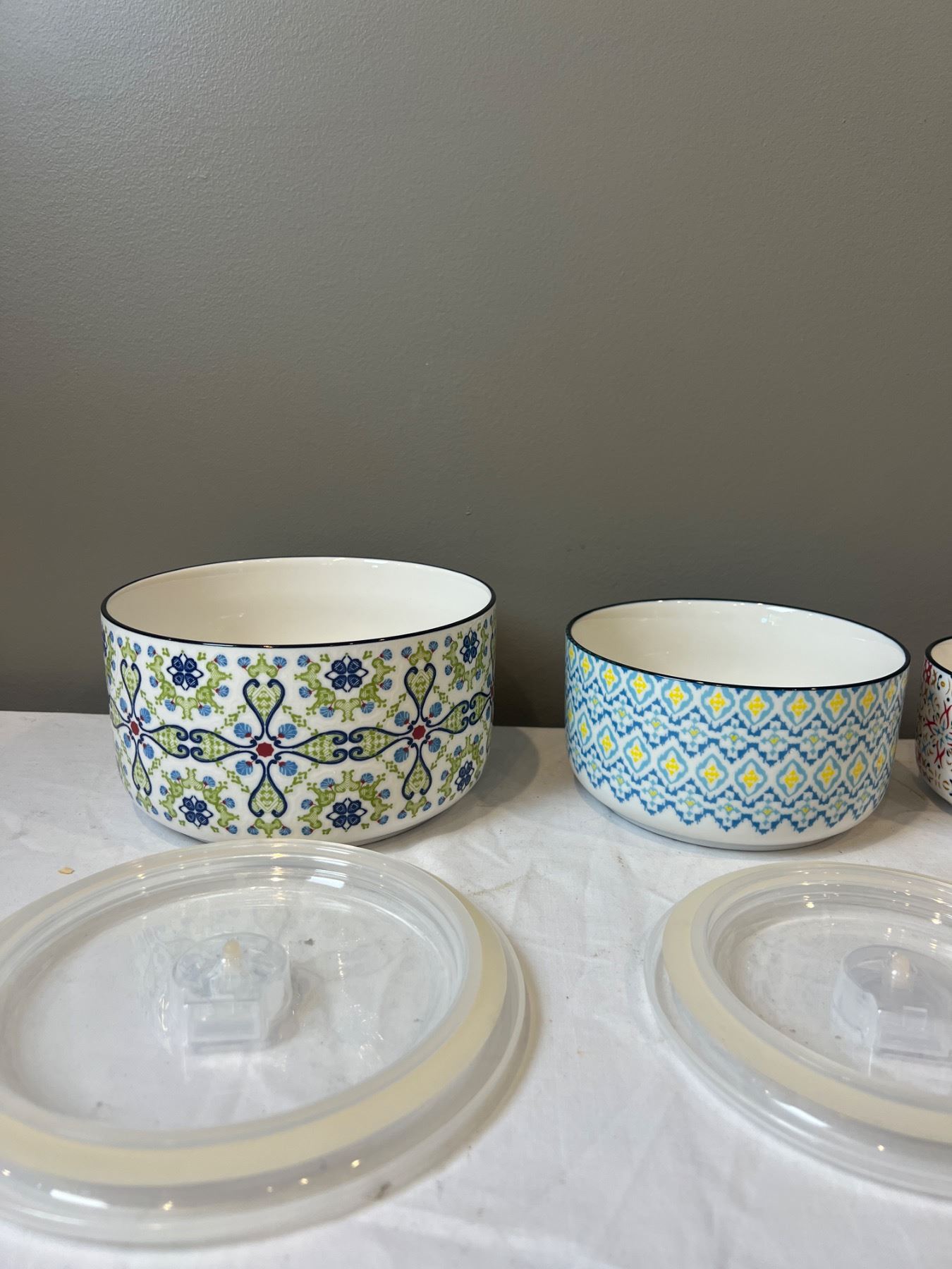 Largest bowl is 7.5" in diameter. Some wear marks to rubber seals.