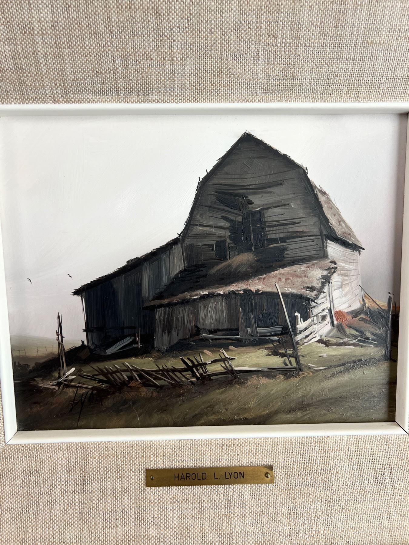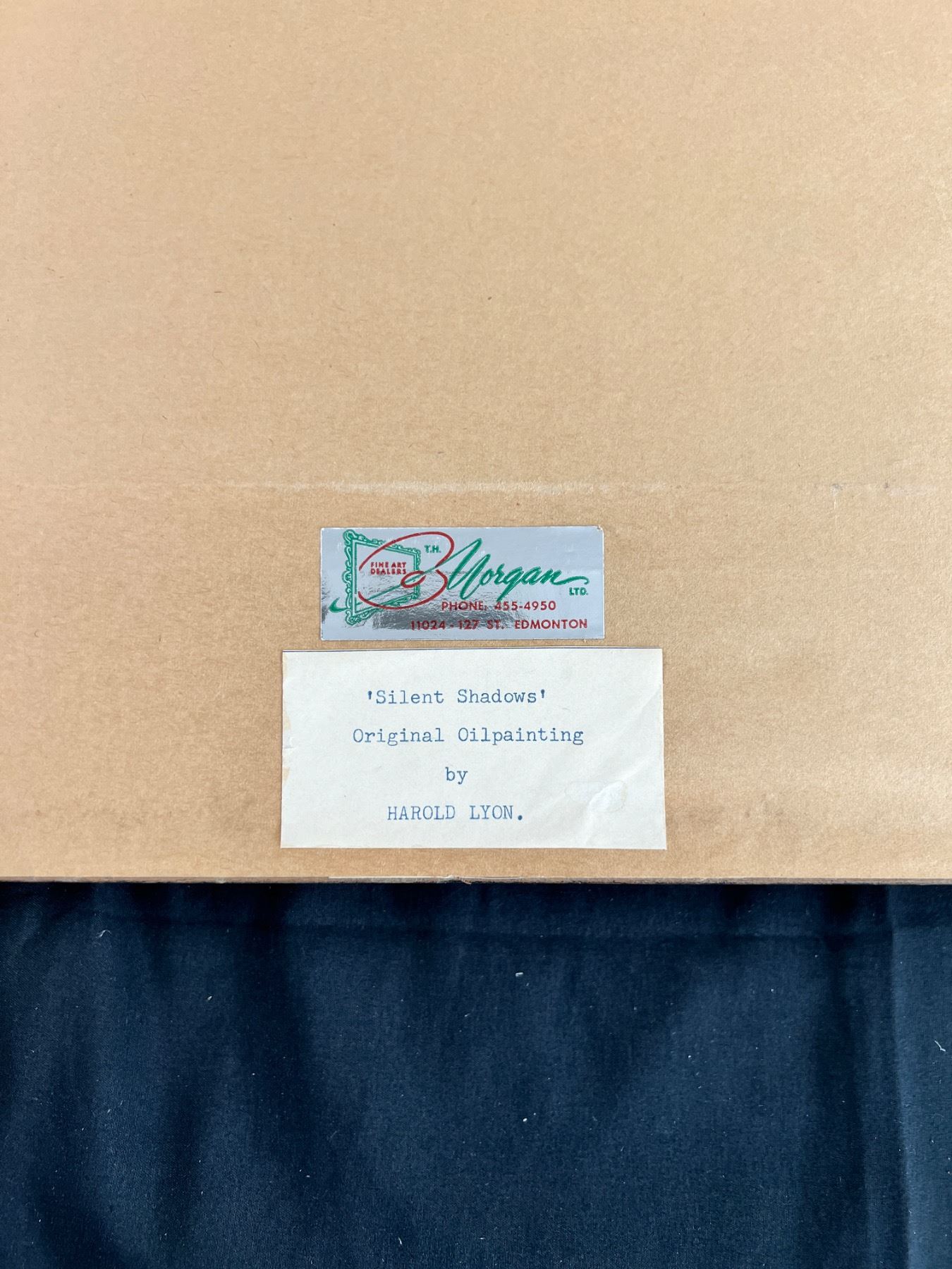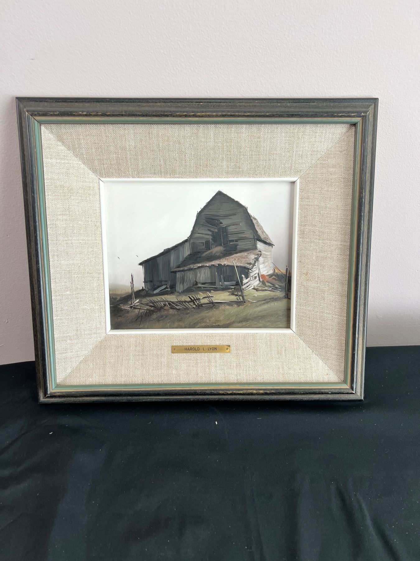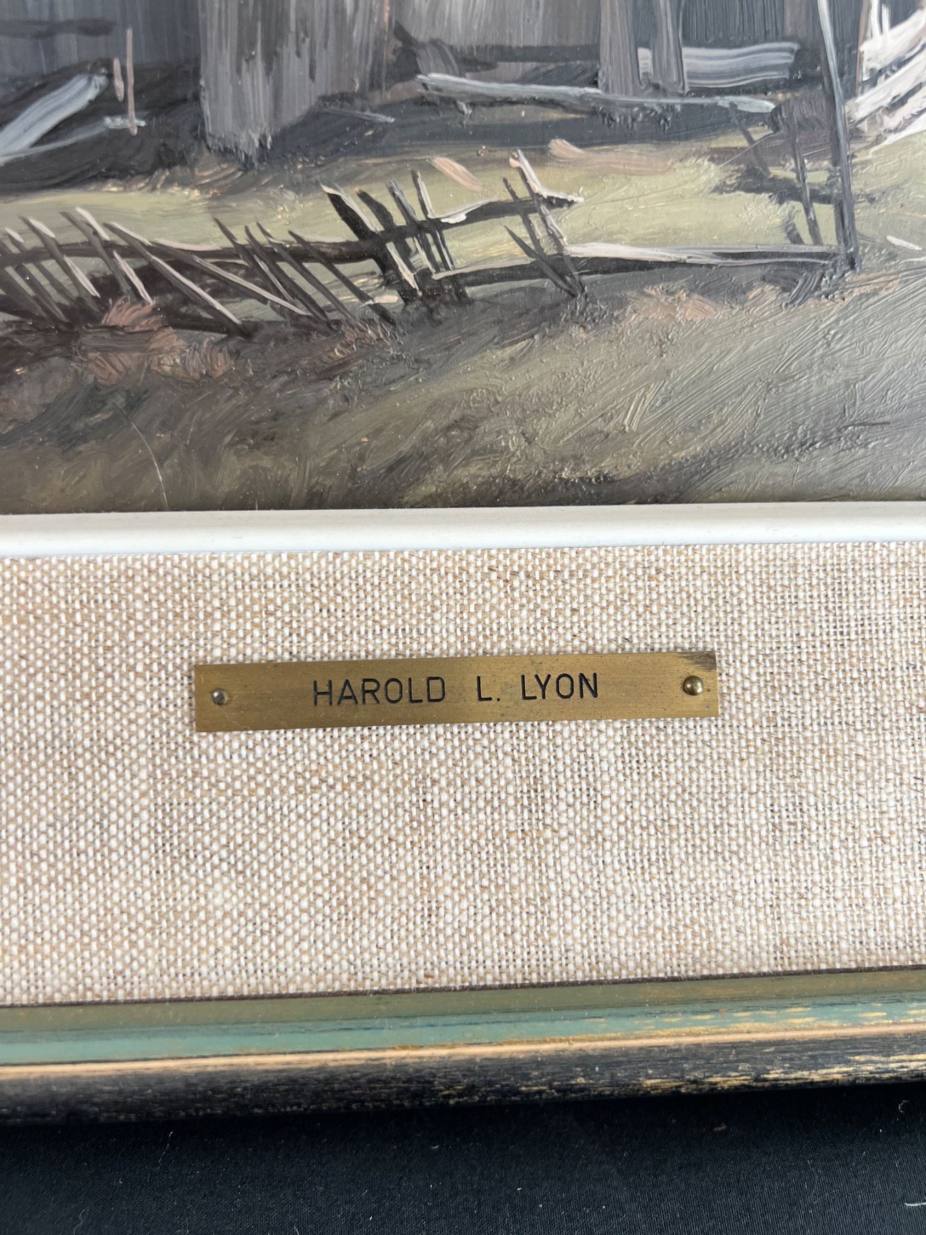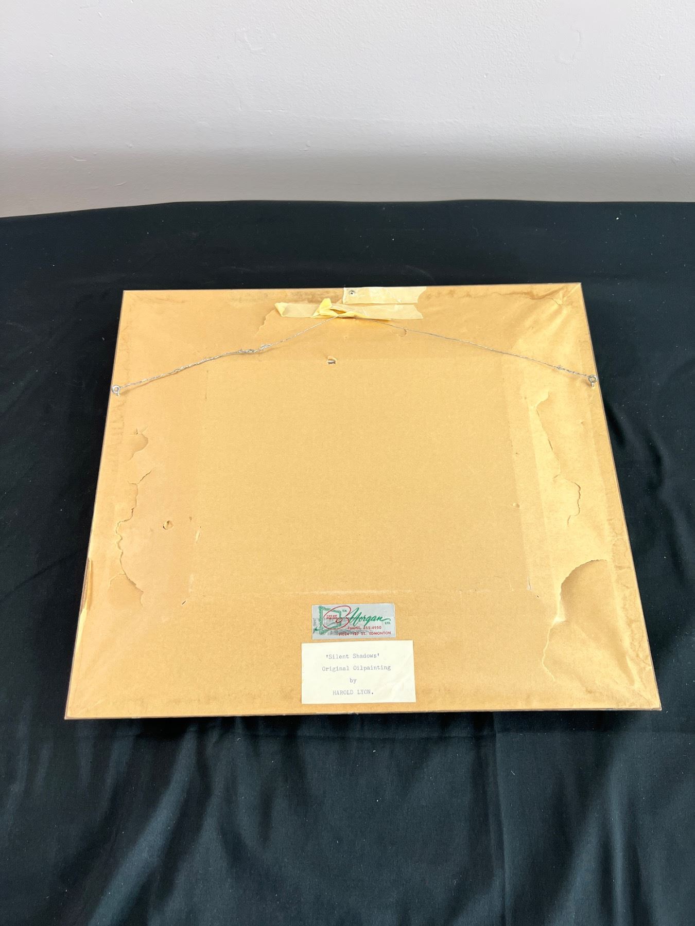 Artist of painting is Harold L. Lyon. Paper has ripped on back of frame. Approximately 17" wide and 15" high.
