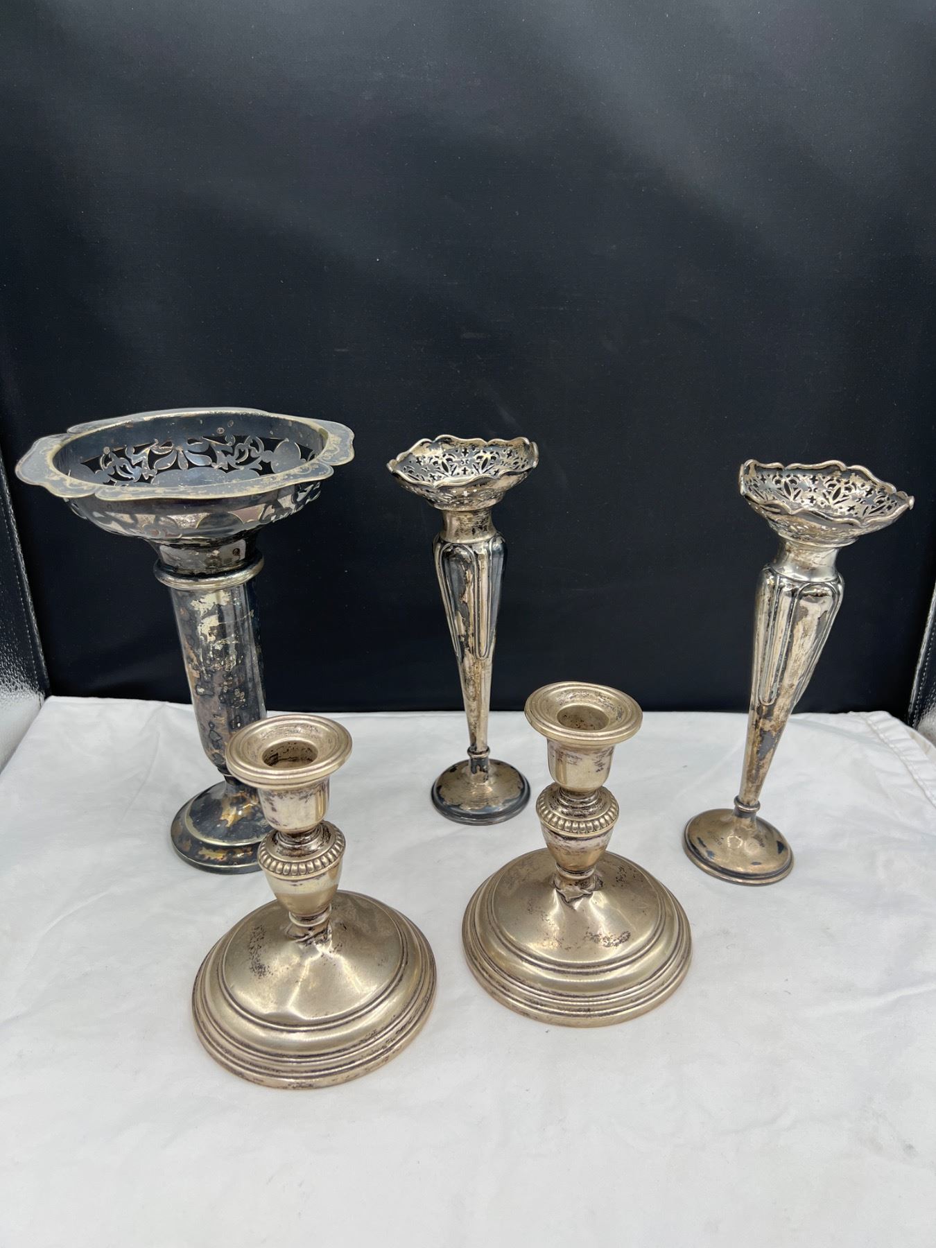 Not all pieces have silver plate markings. Largest piece measures 9.5" tall. Also includes decorative candles and extinguisher.