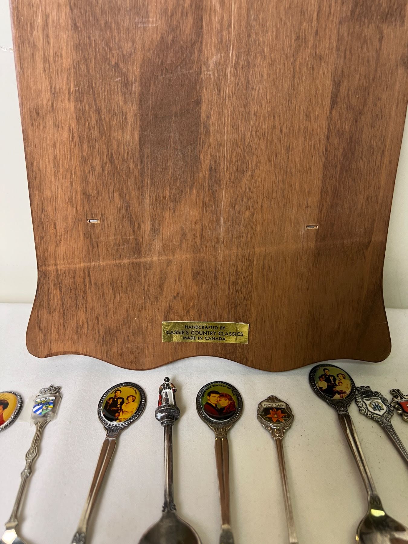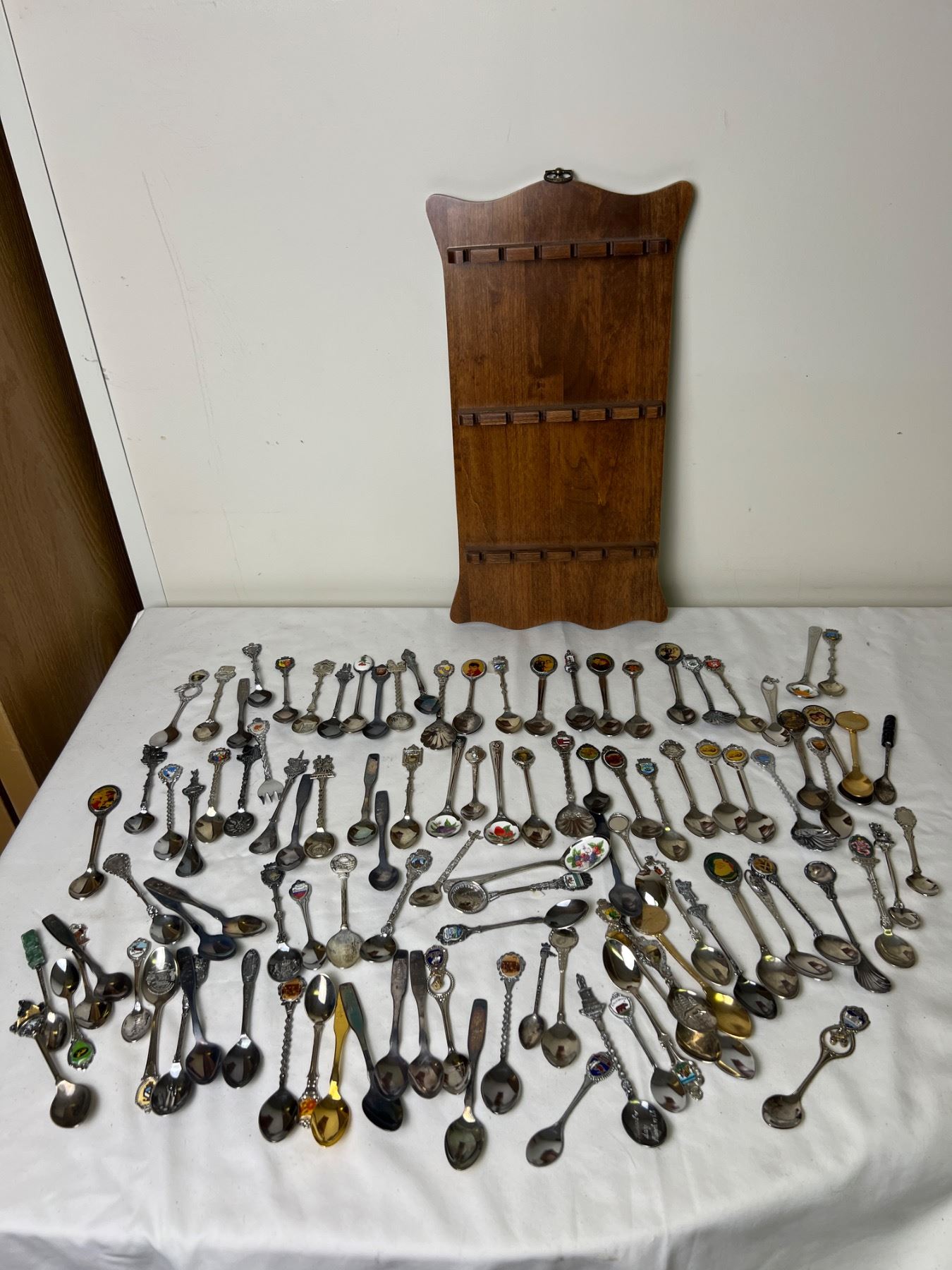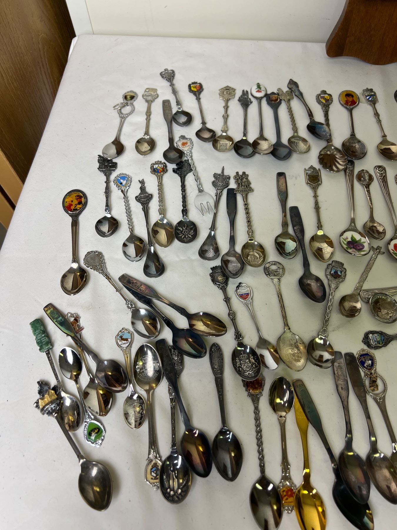 Wide variety of designs on spoons. Most are silver plated pieces.
