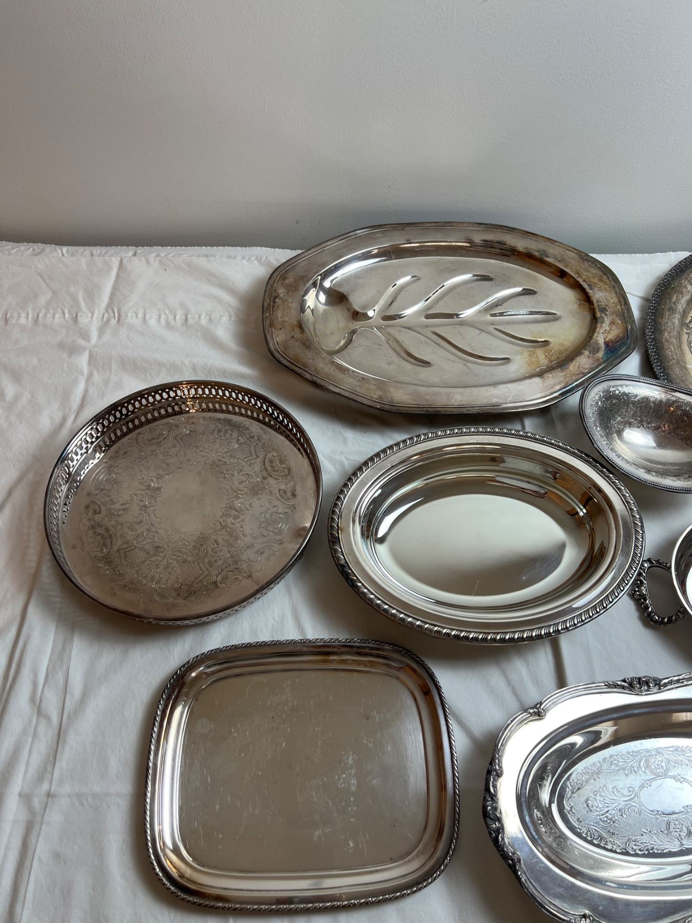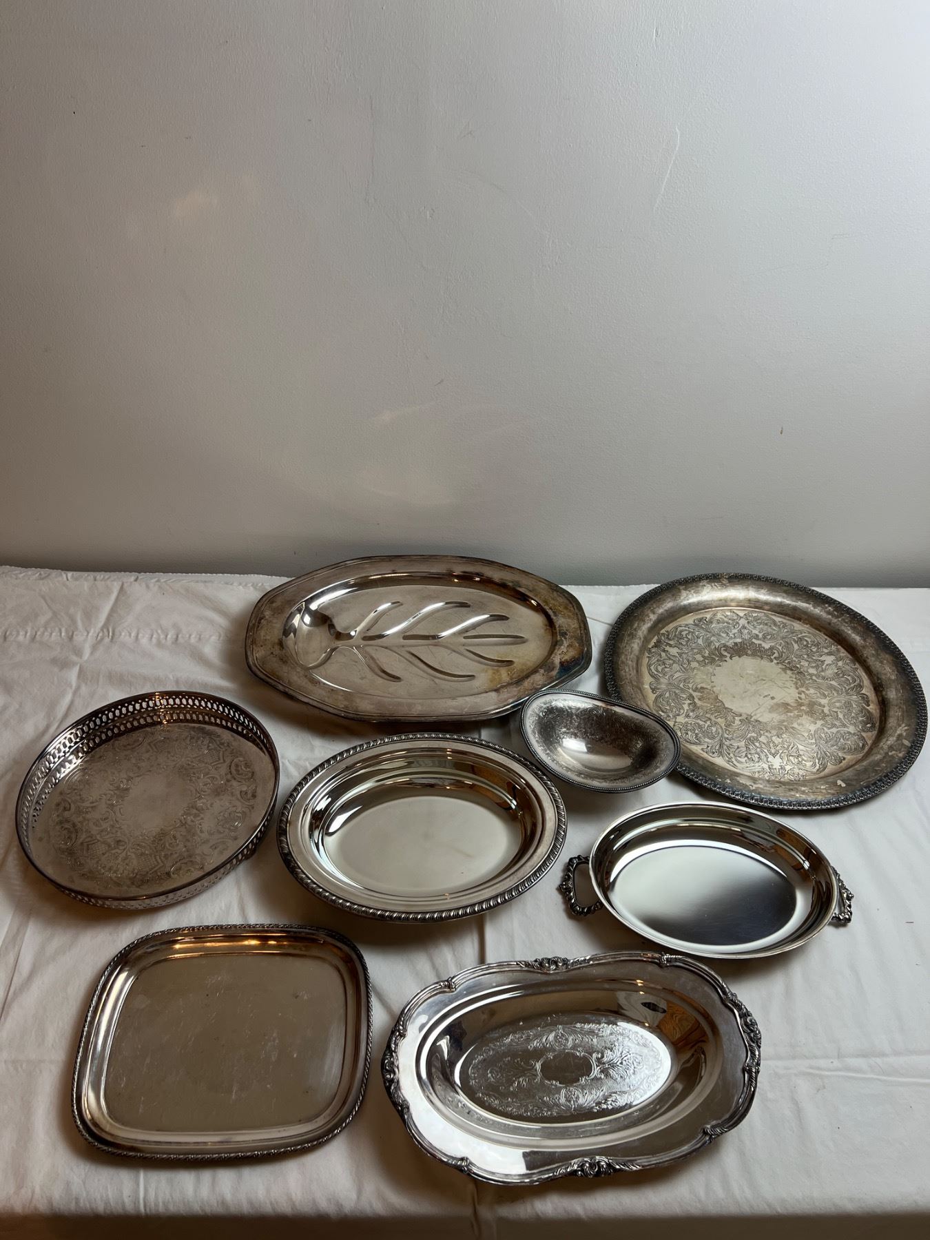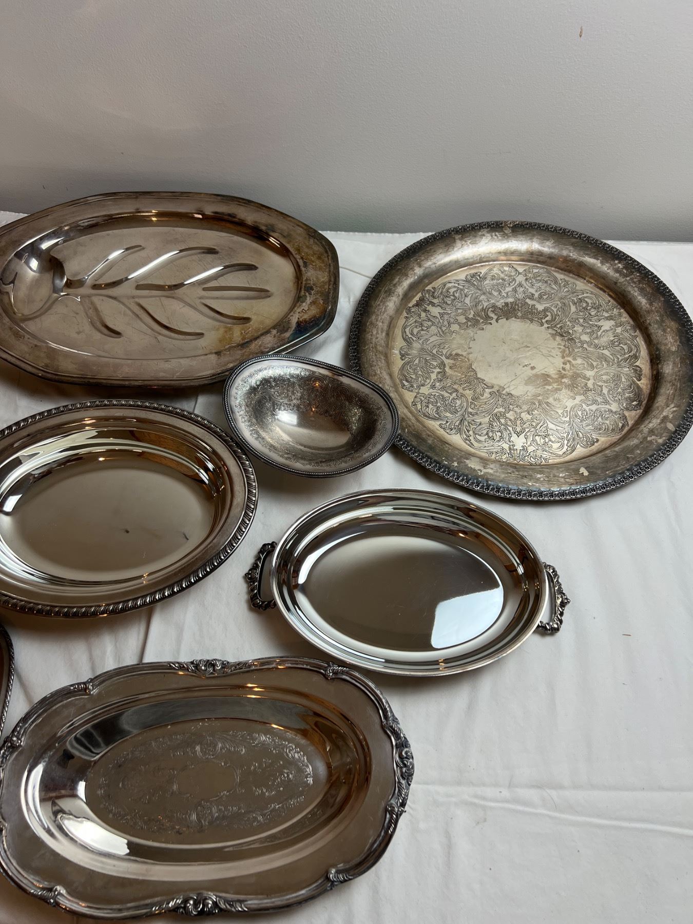 Various levels of tarnish and branding. Largest platter is 17" by 12"