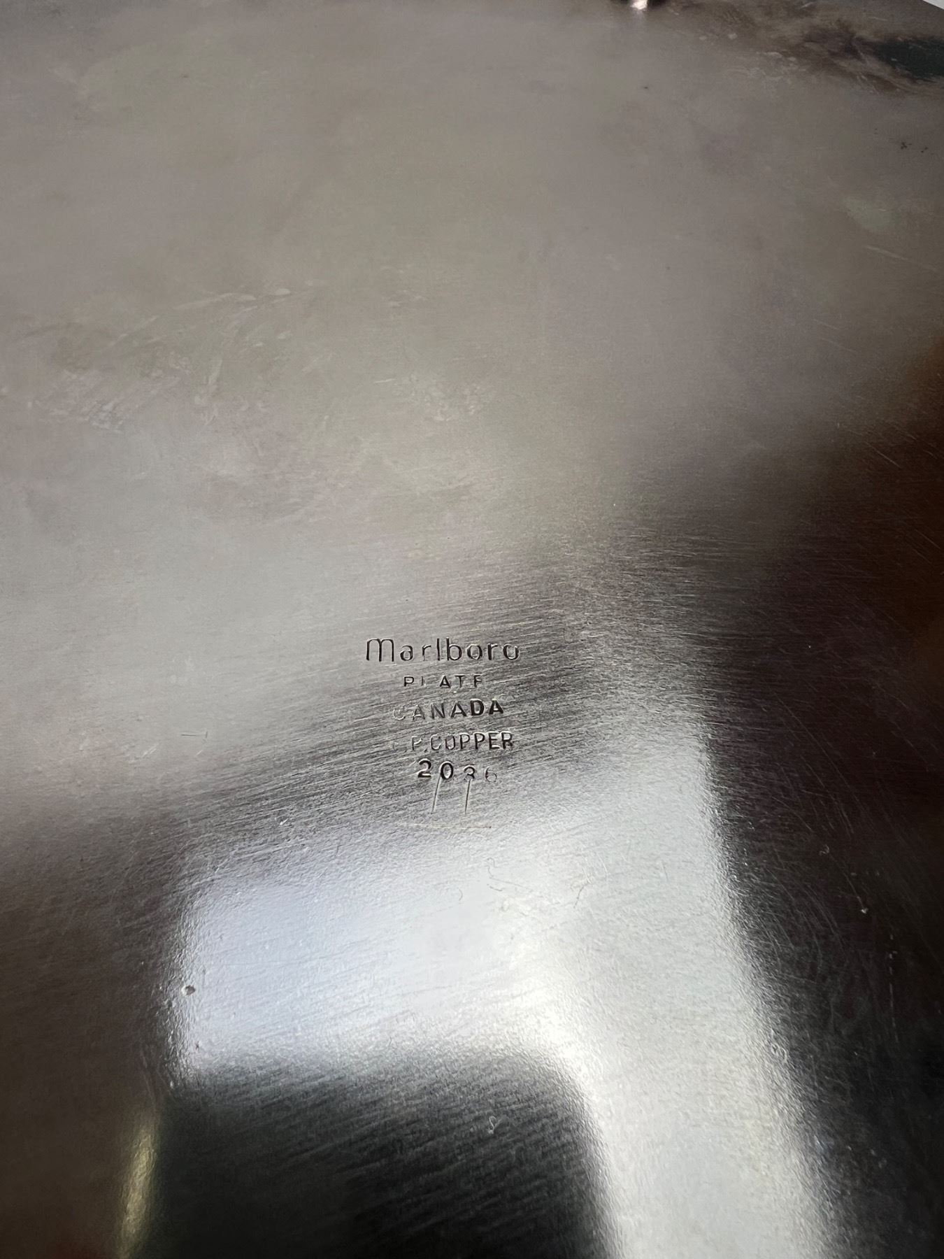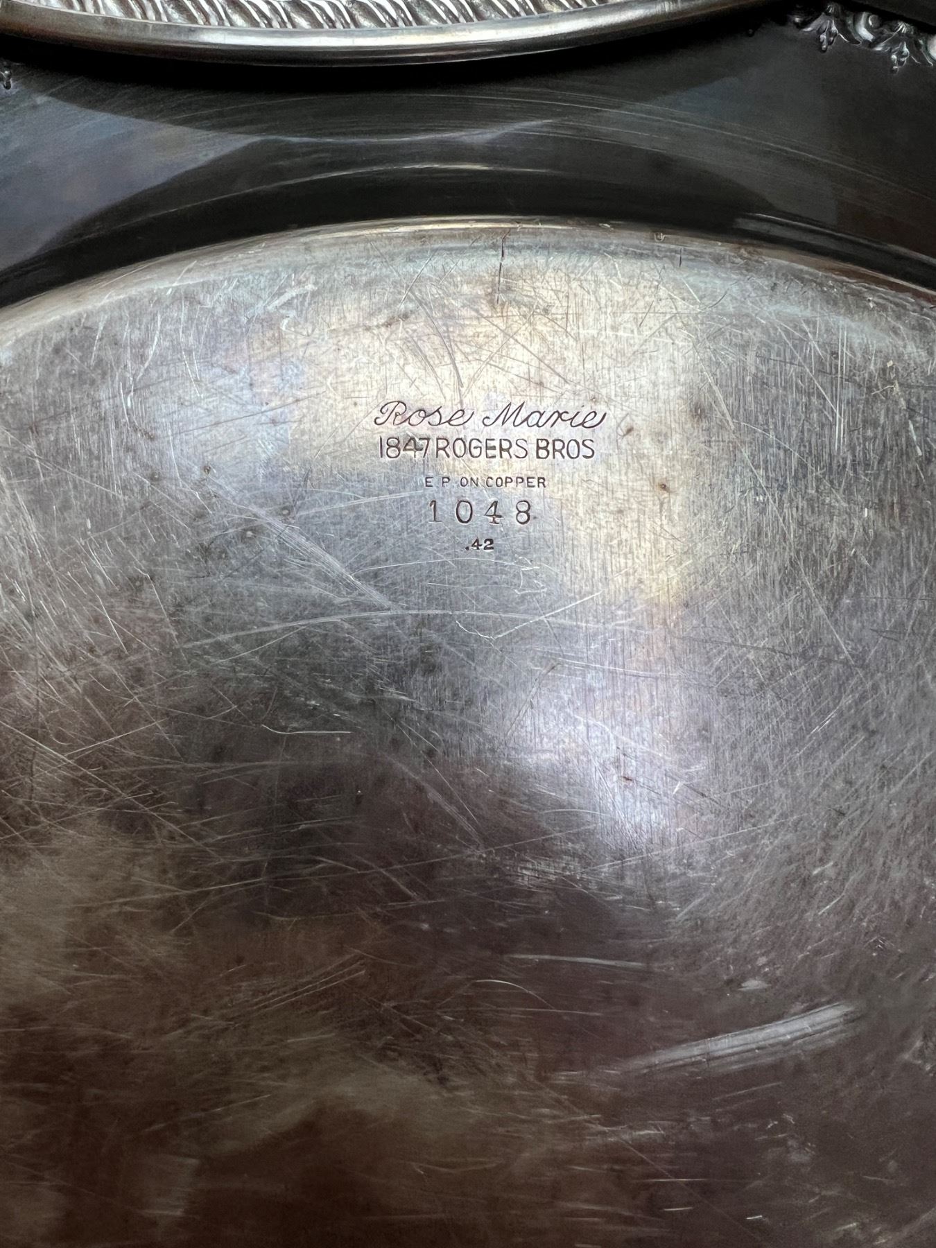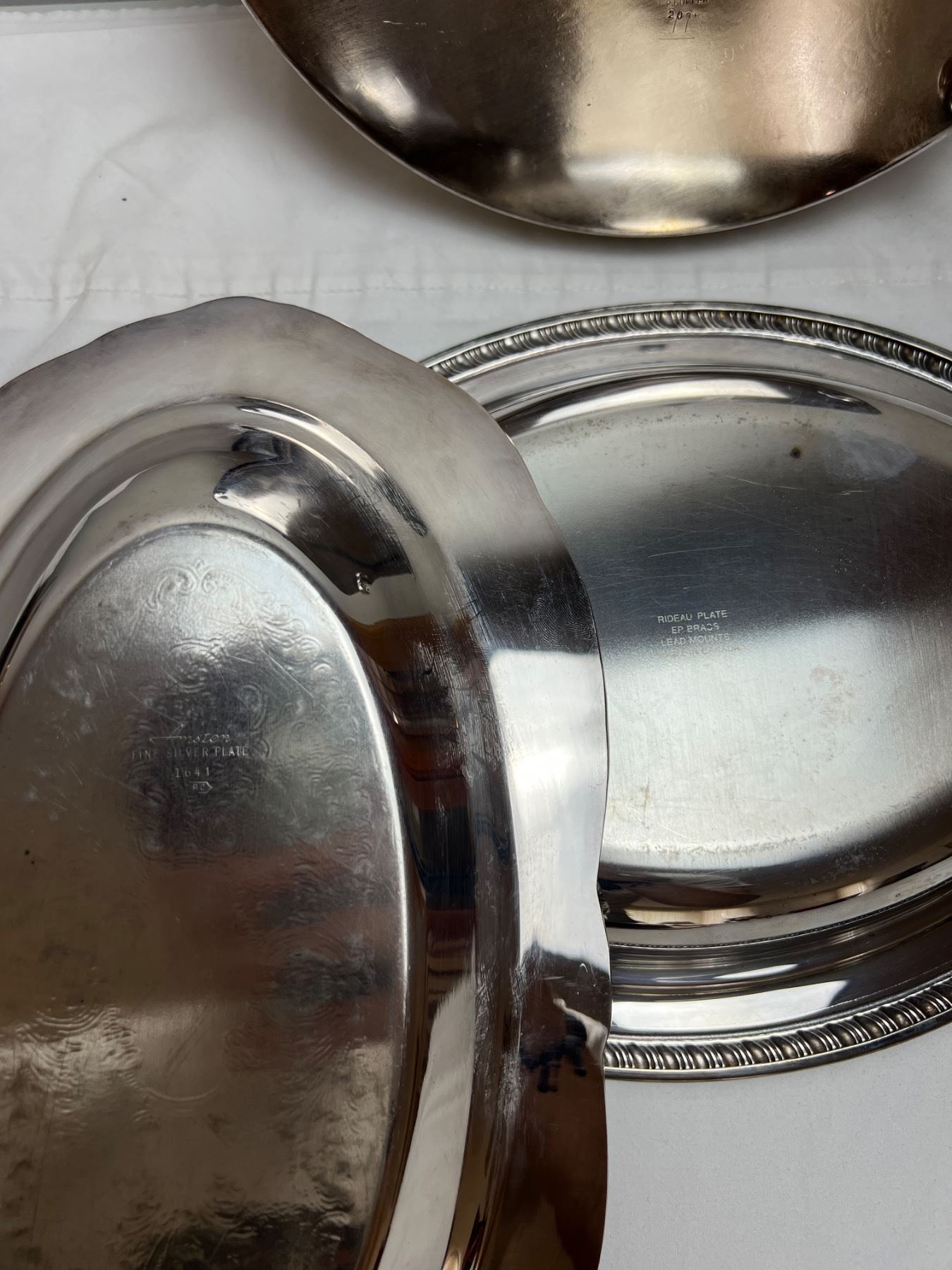 Various levels of tarnish and branding. Largest platter is 17" by 12"