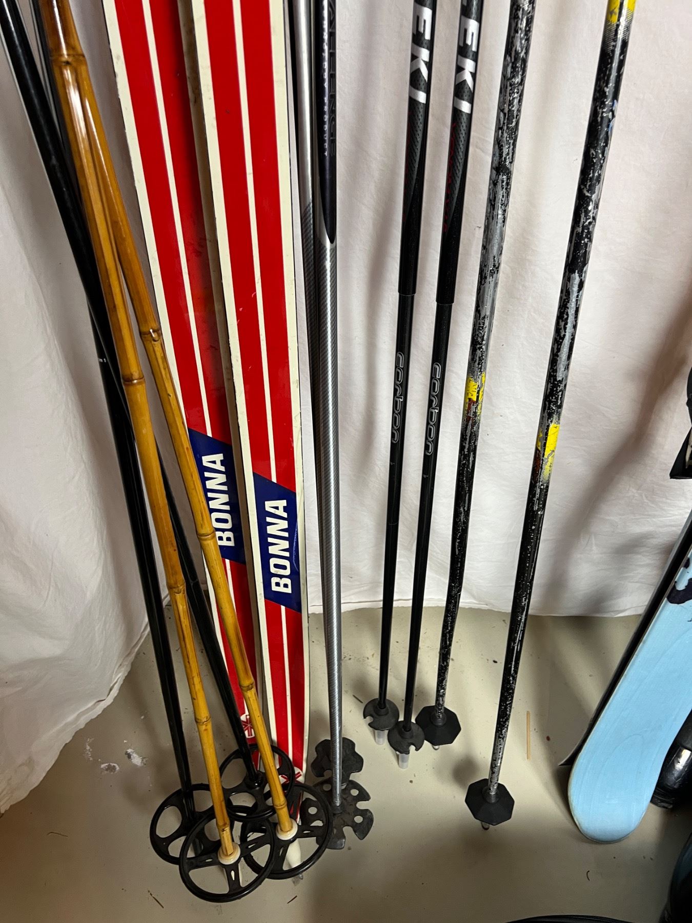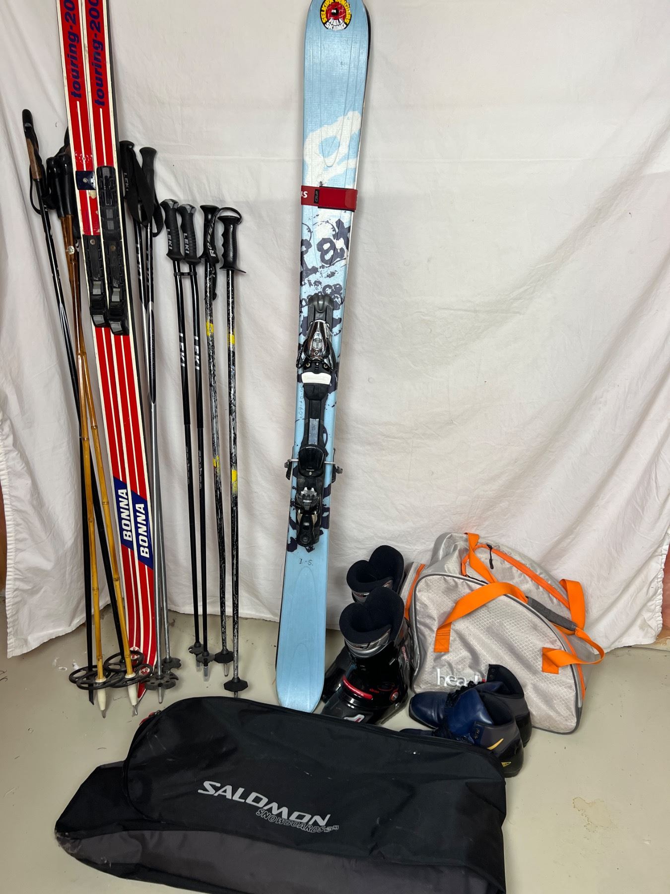 Includes, Touring 2000 Cross Country Skis (76"L), Salomon Skiis (63.5"L), Skii Boots, Various poles, and more