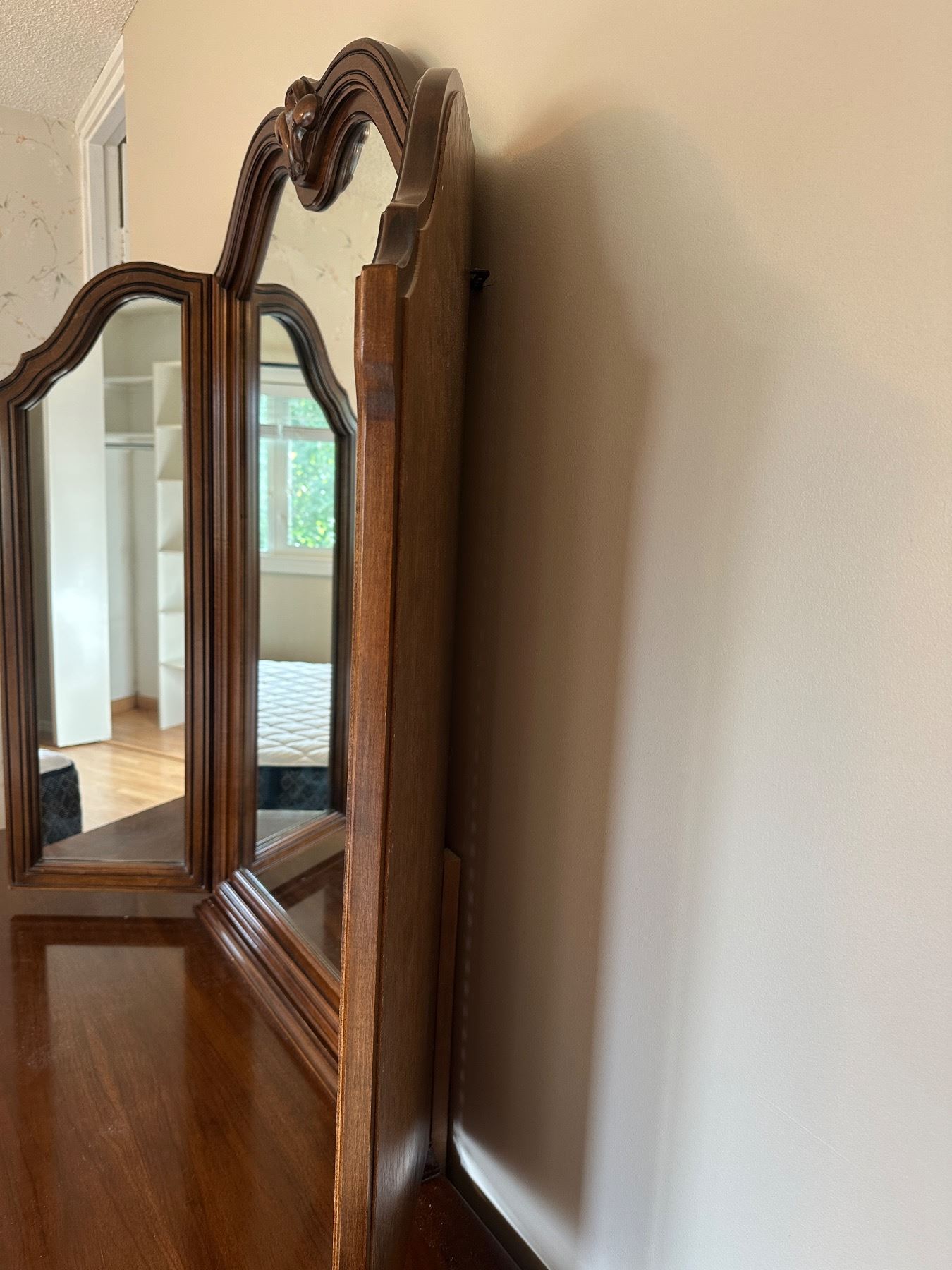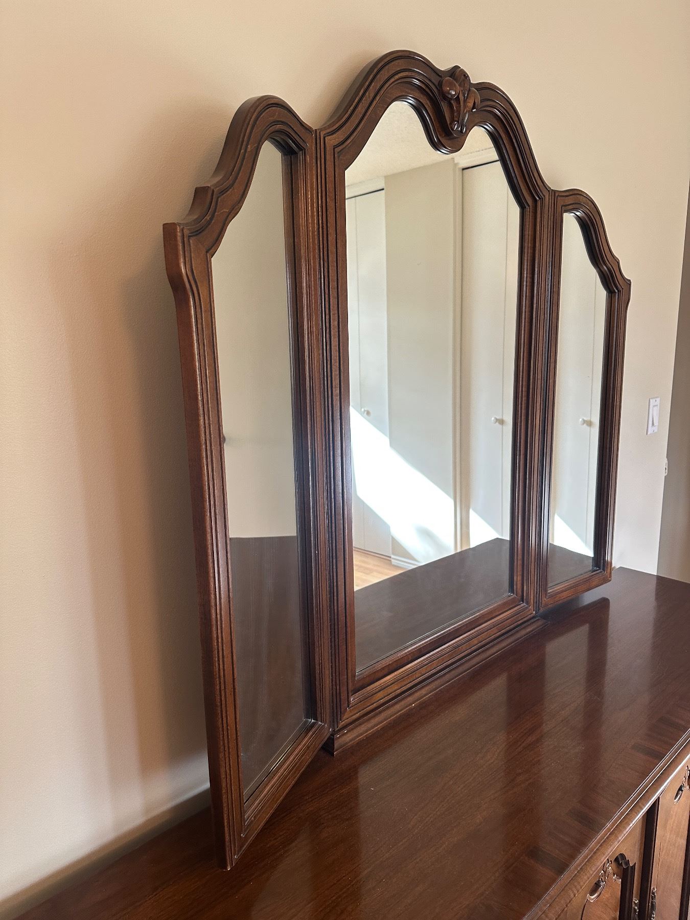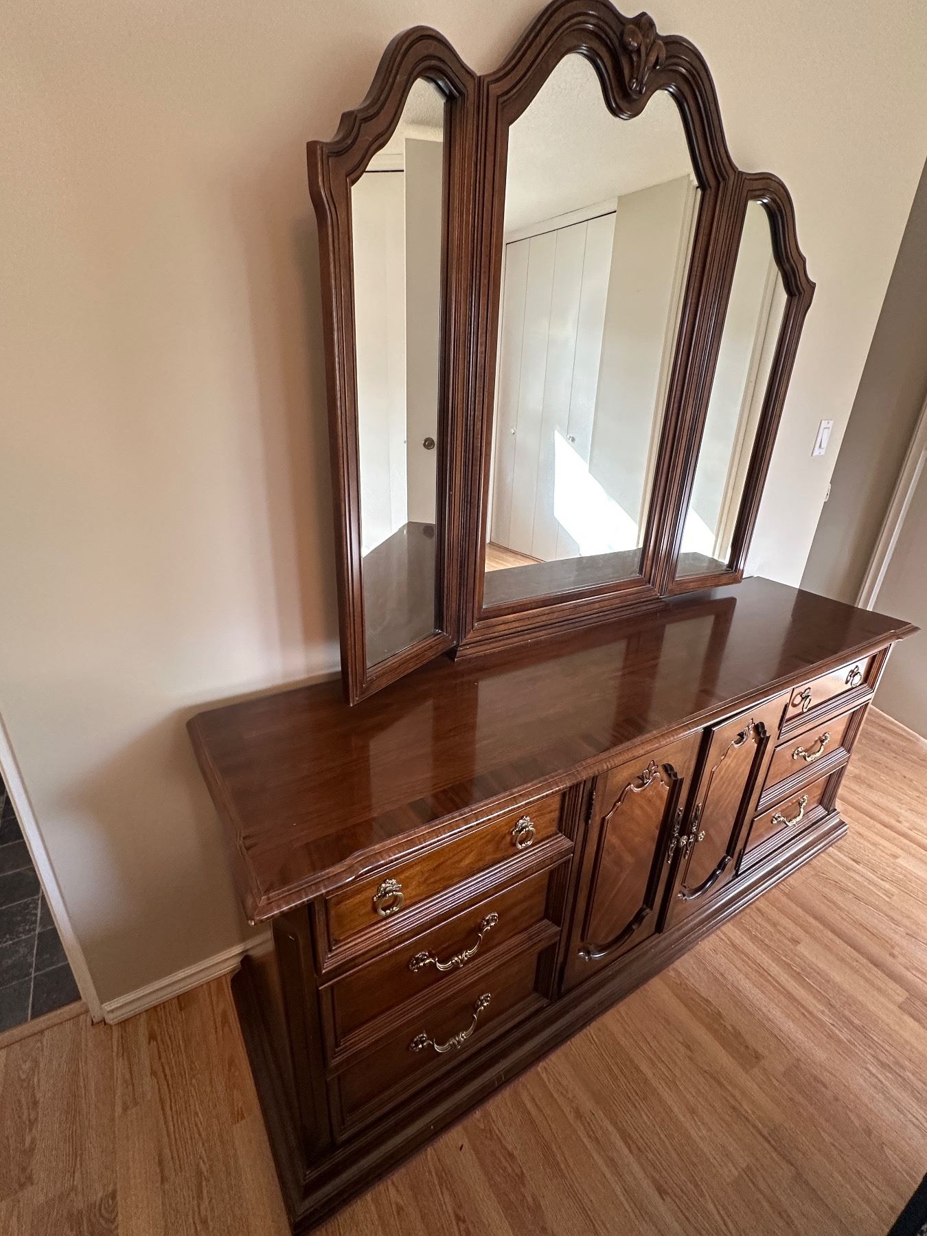 Made in Canada wooden dresser 71" wide x 19" deep x 30.5" tall. Tri-fold mirror when fully extended 53.5" wide x 1" Depp x 46.5" tall