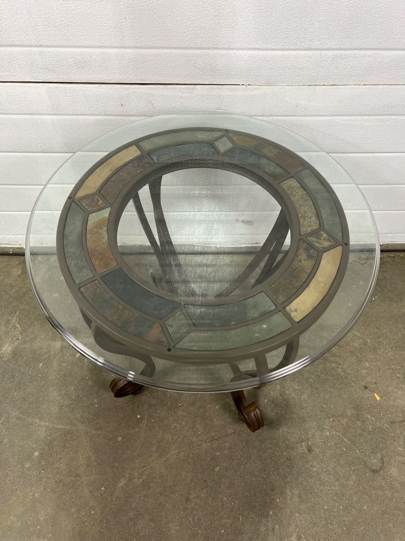 Glass is 24" in diameter, table stands 24" tall and has diameter of 20"