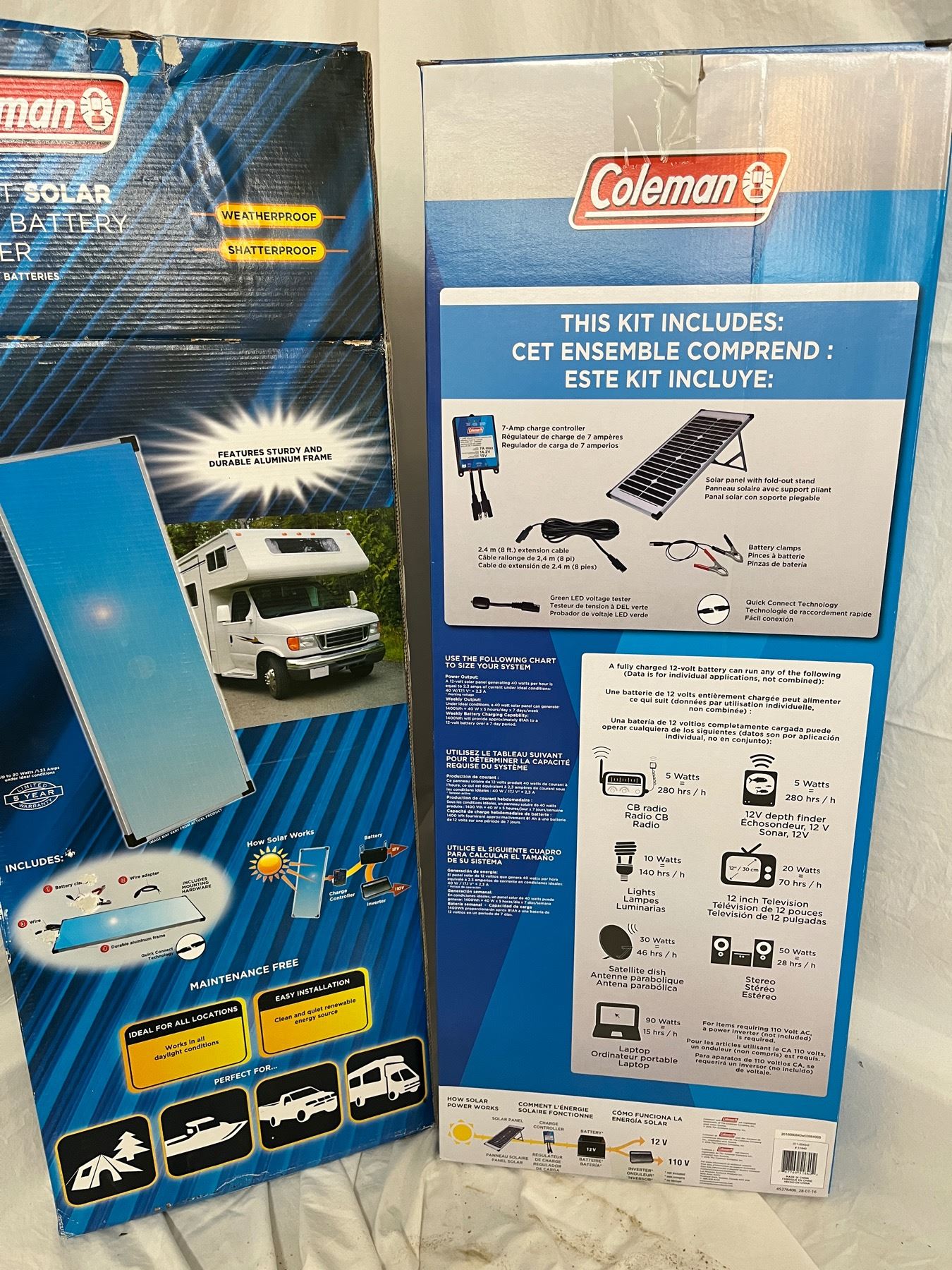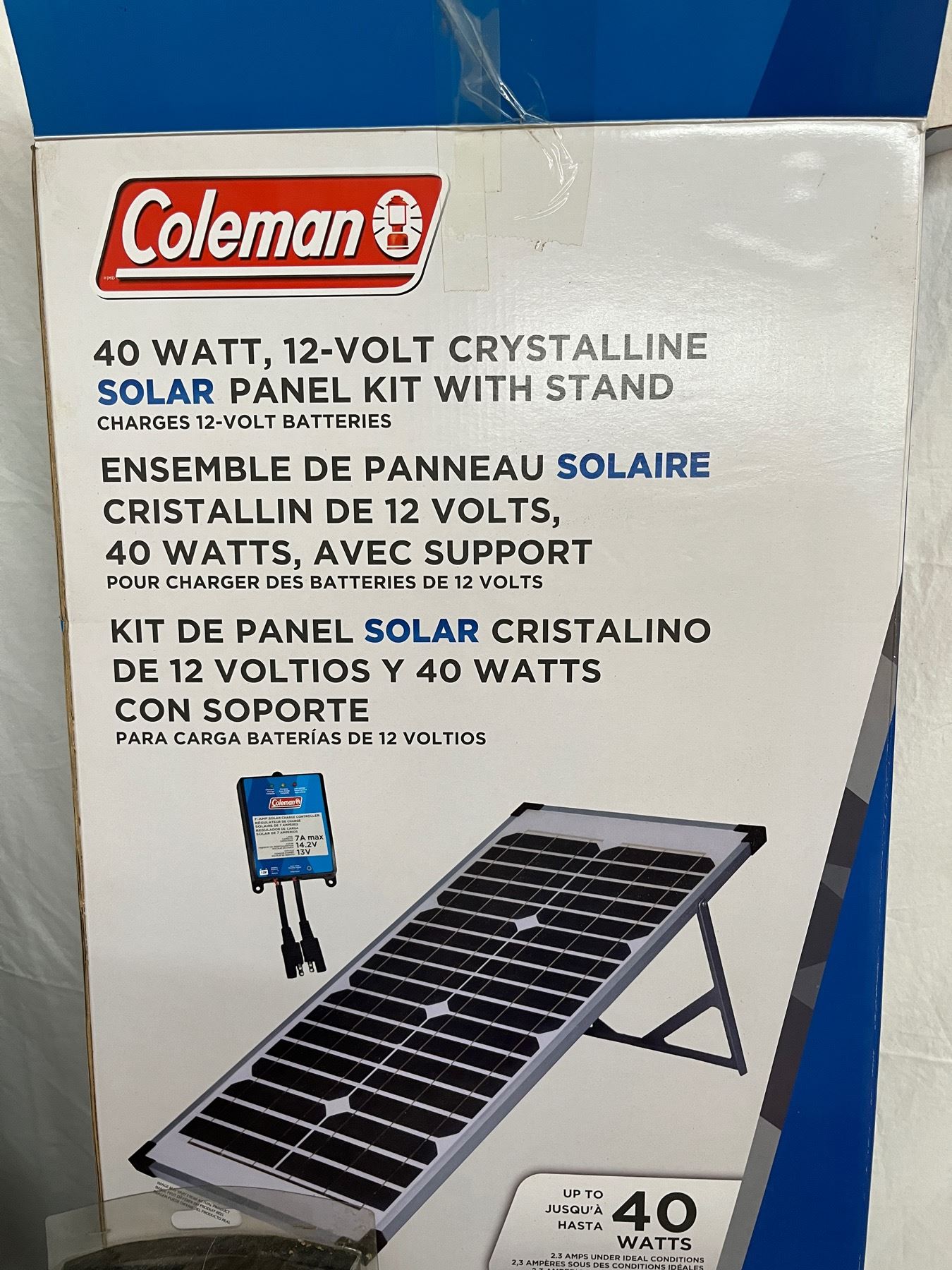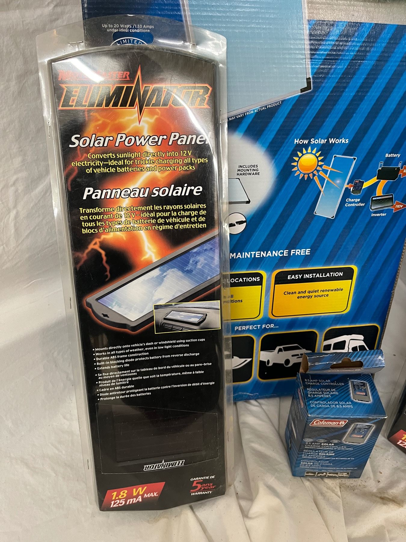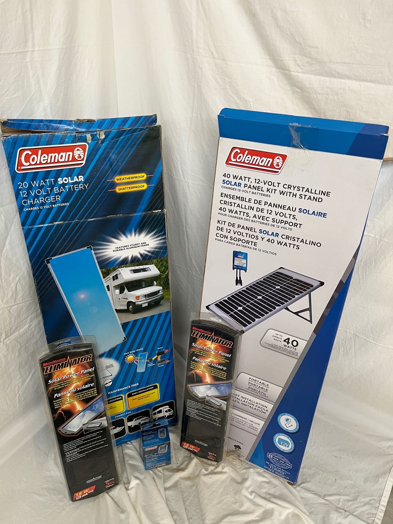 Includes Coleman 20 watt Solar 12 Volt Battery Charger - Coleman 40 watt 12 volt Solar Panel Kit with Stand - 2 MotoMaster Eleminator Solar Power Panels & Coleman 8.5 Amp Solar Charge Controller