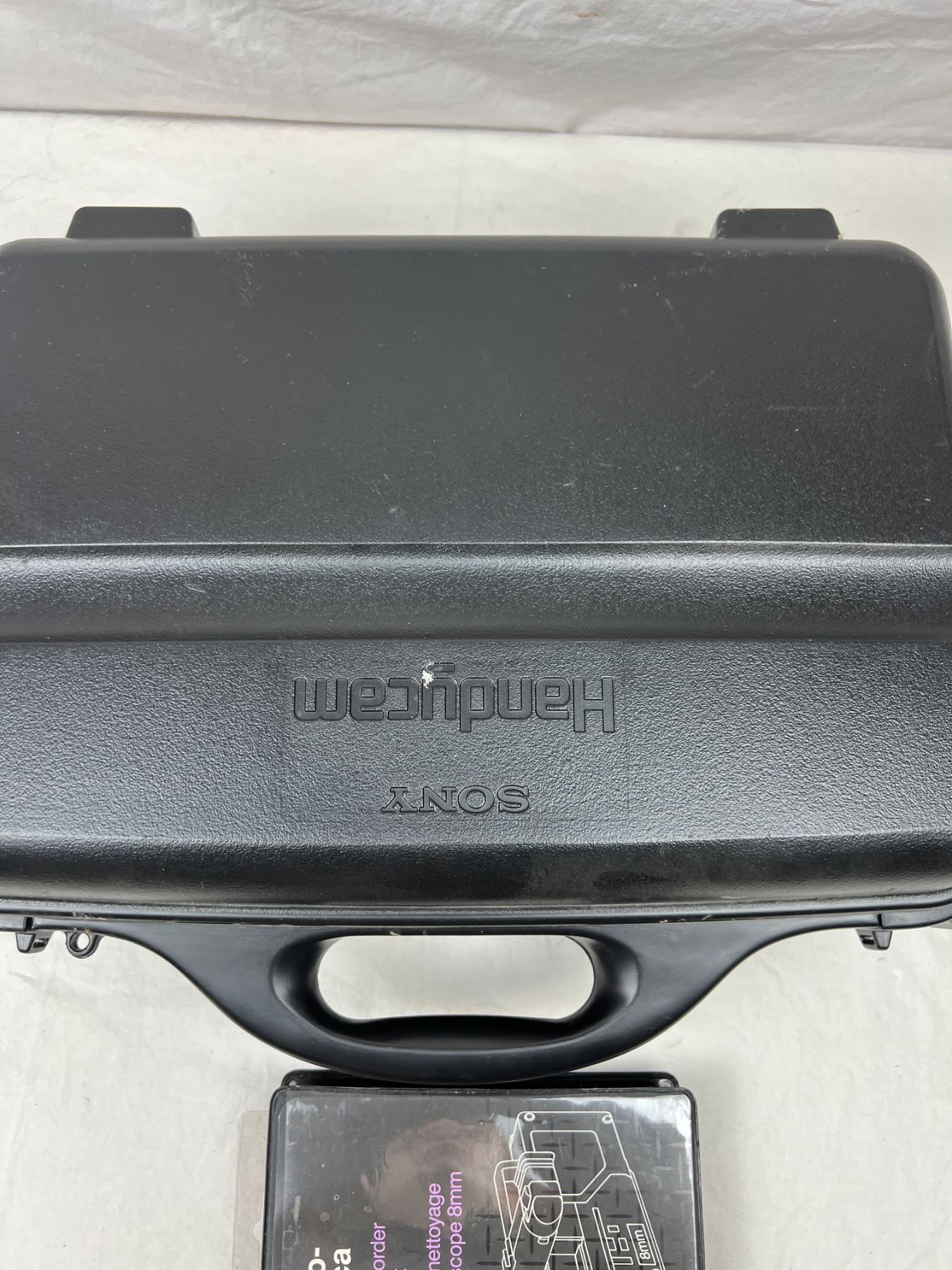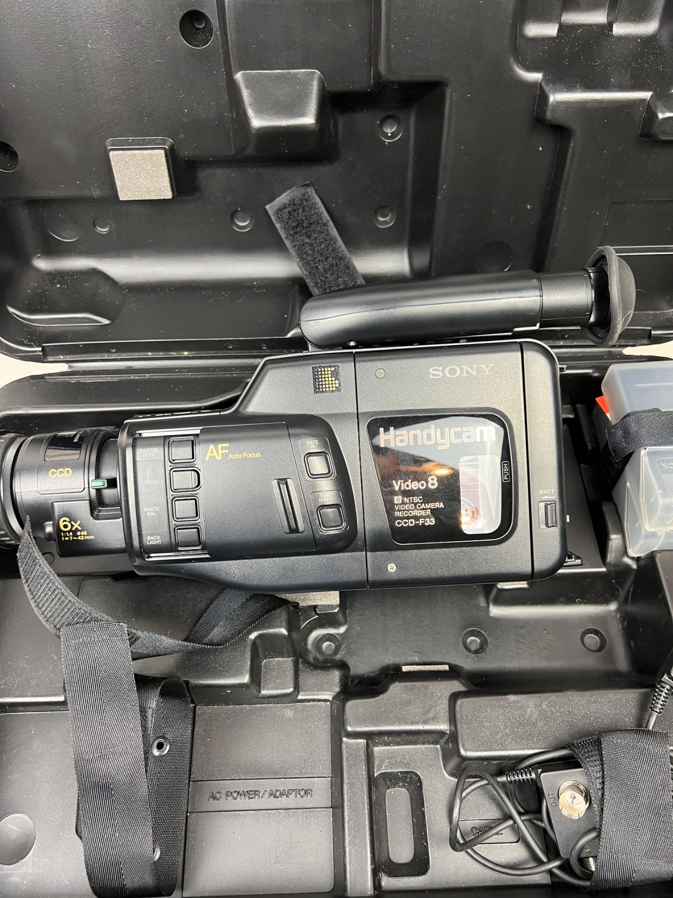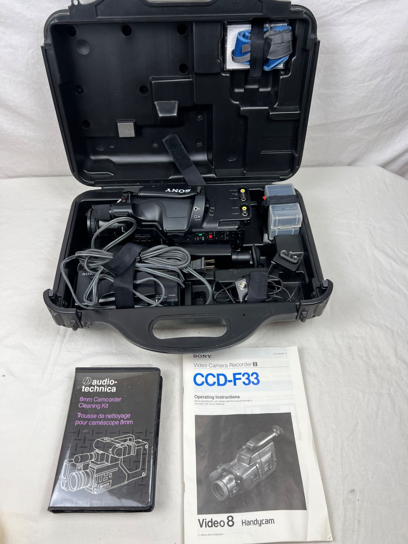 CCD-F33 Video 8 Handycam, includes two batteries and one charger (not tested), user manual, carrying case, and more