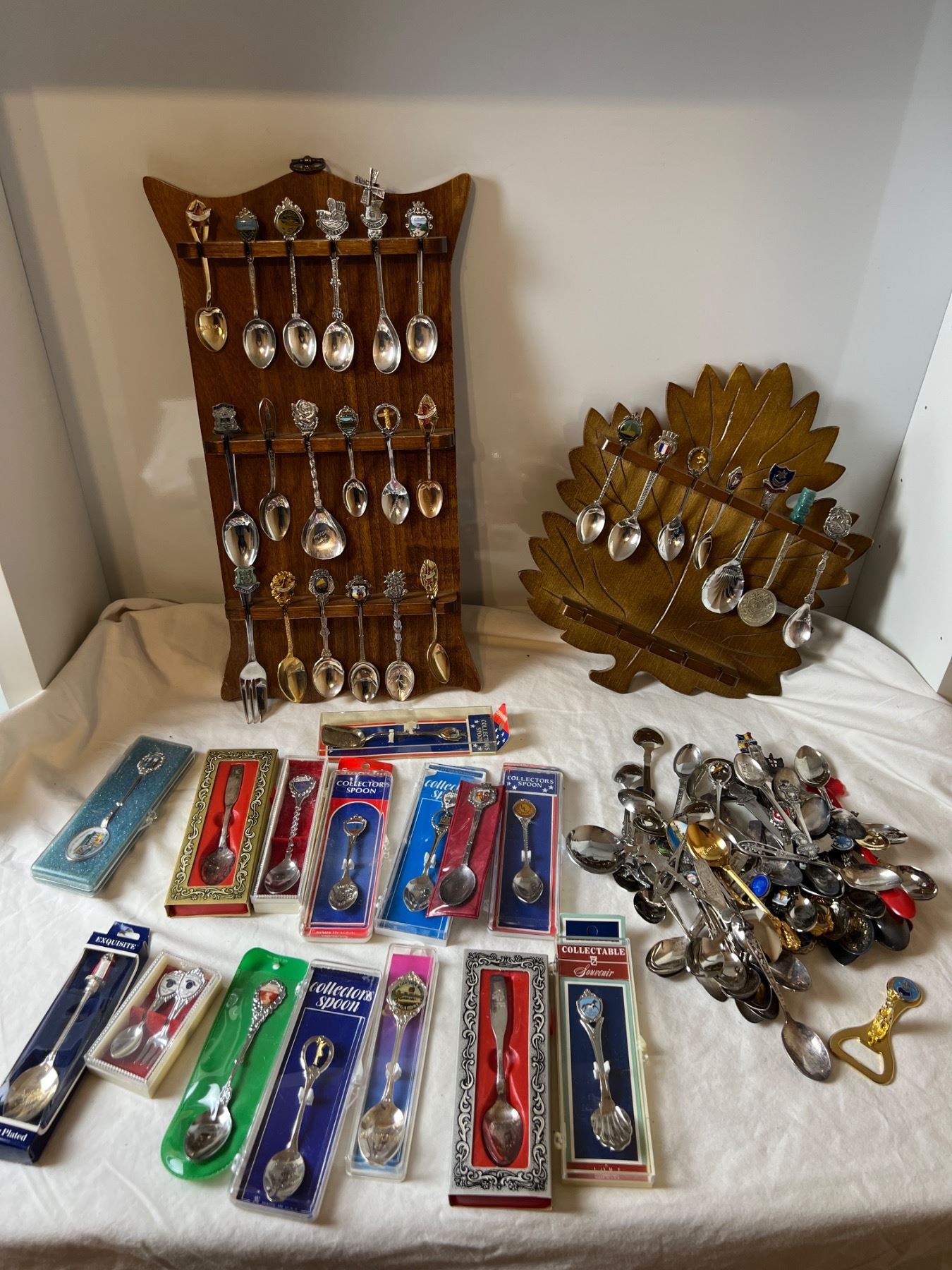 Two different styles of hangers one being handcrafted and a wide variety of souvenir and collectible spoons.