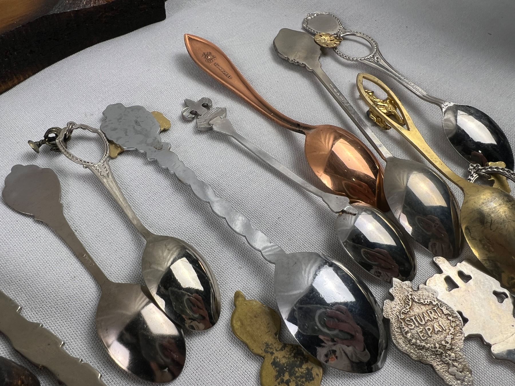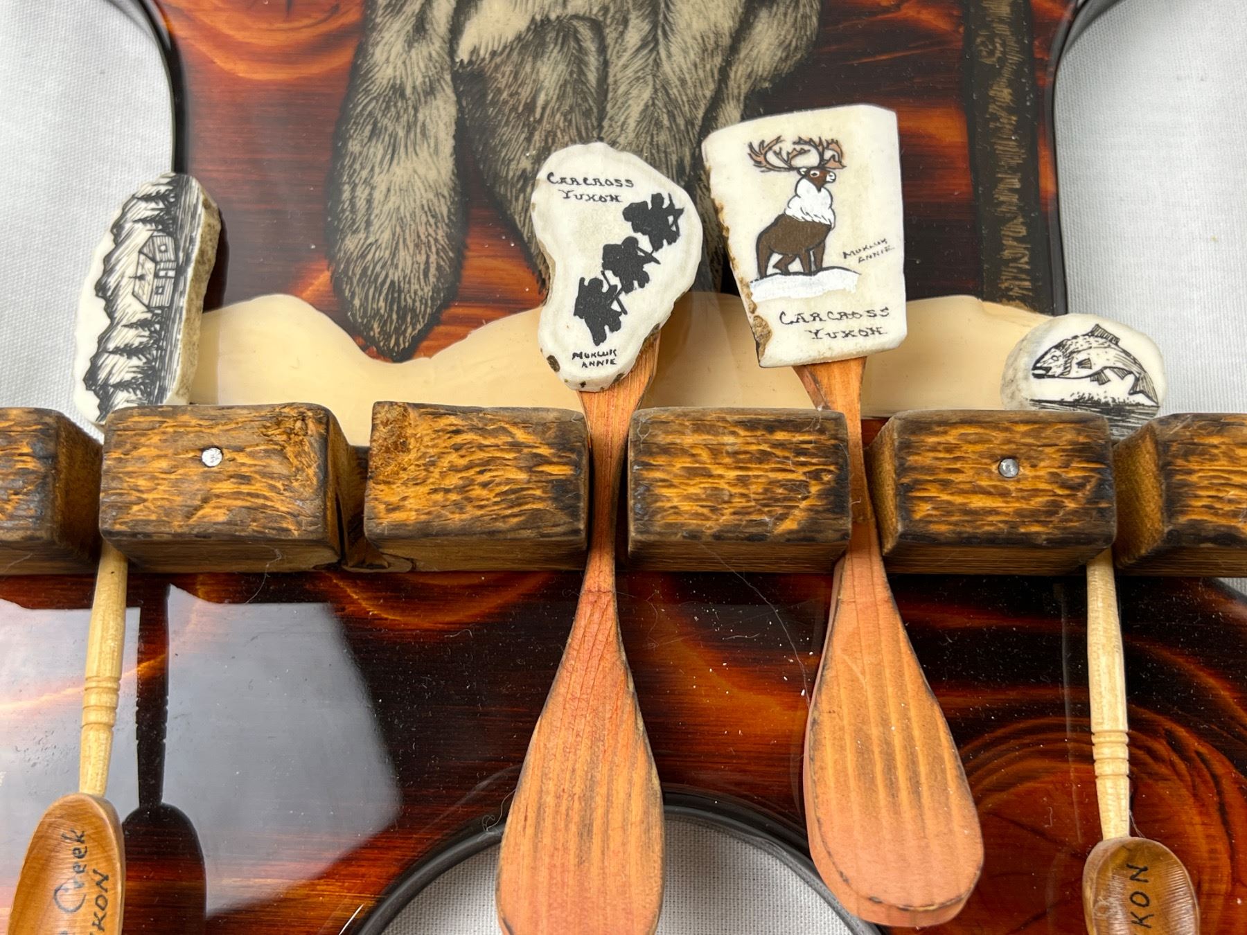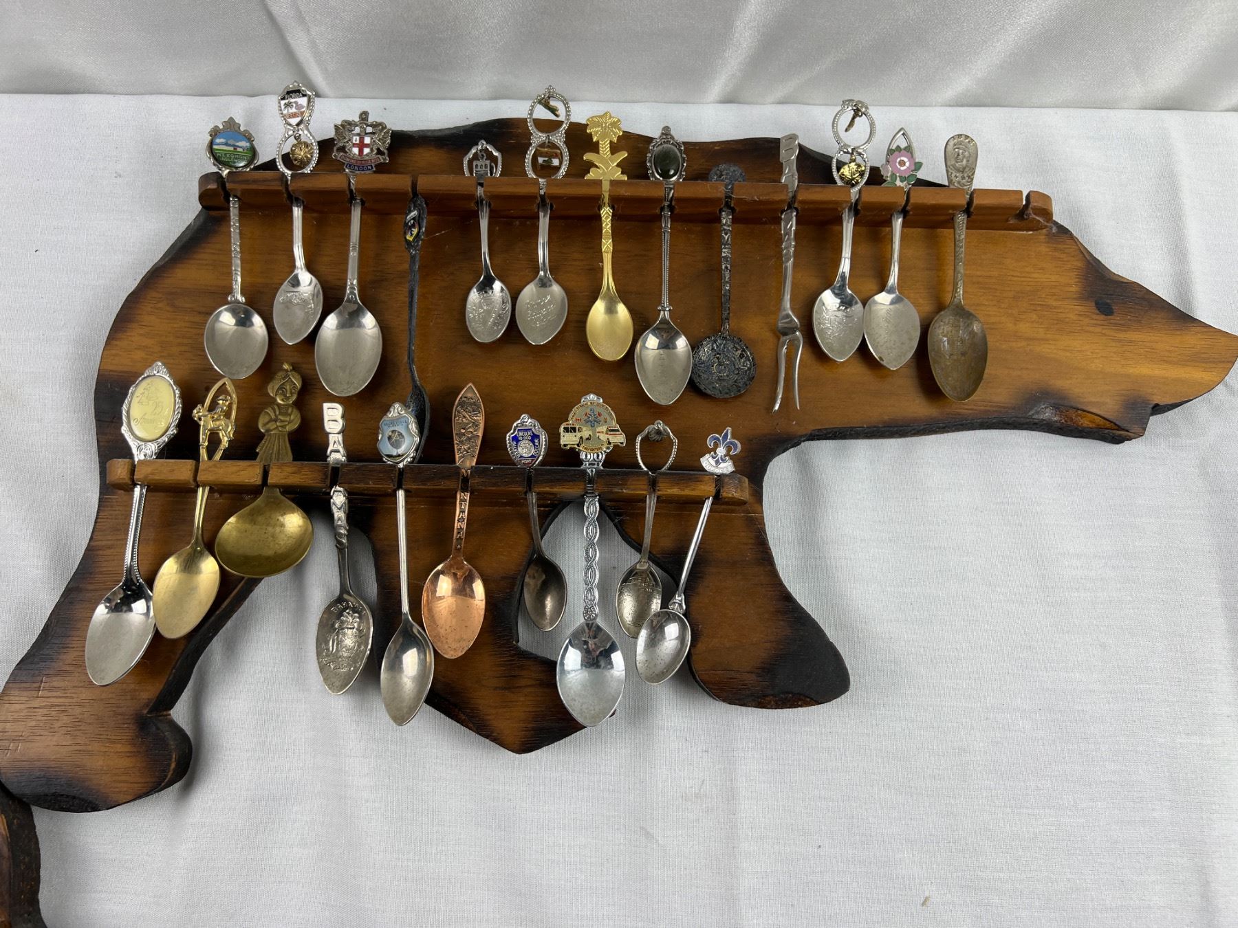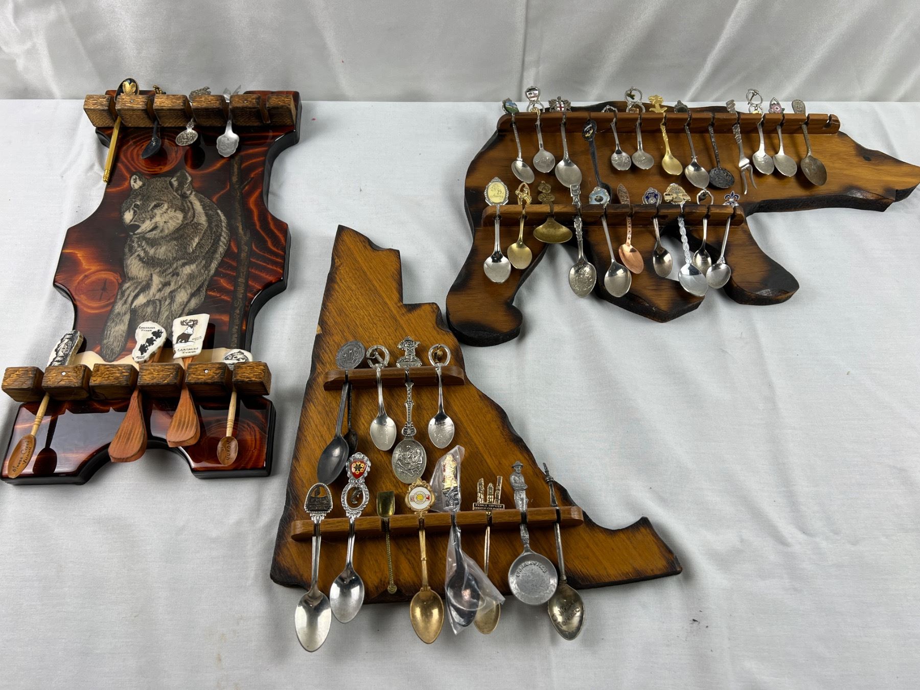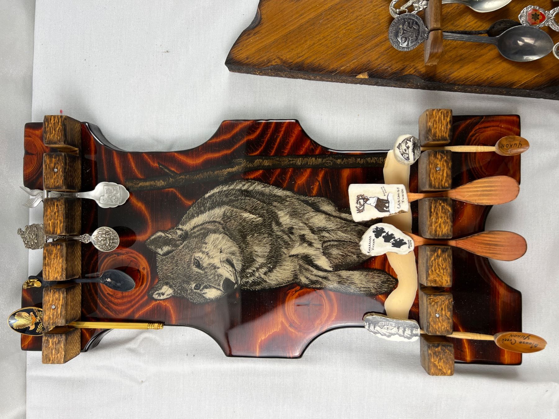 Includes a variety of spoons like E.P.N.S, Sunburst Copper, Irwin, E.P.C.M, and more, The wolf hanger is 16x8"