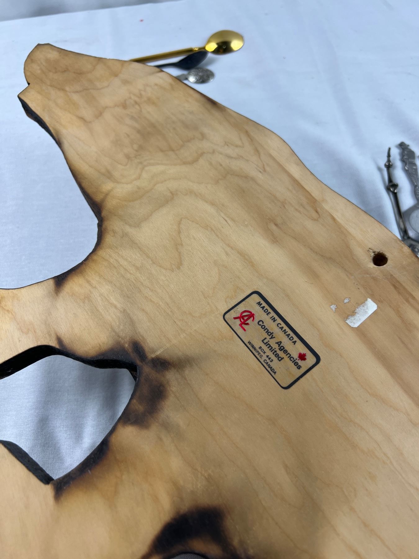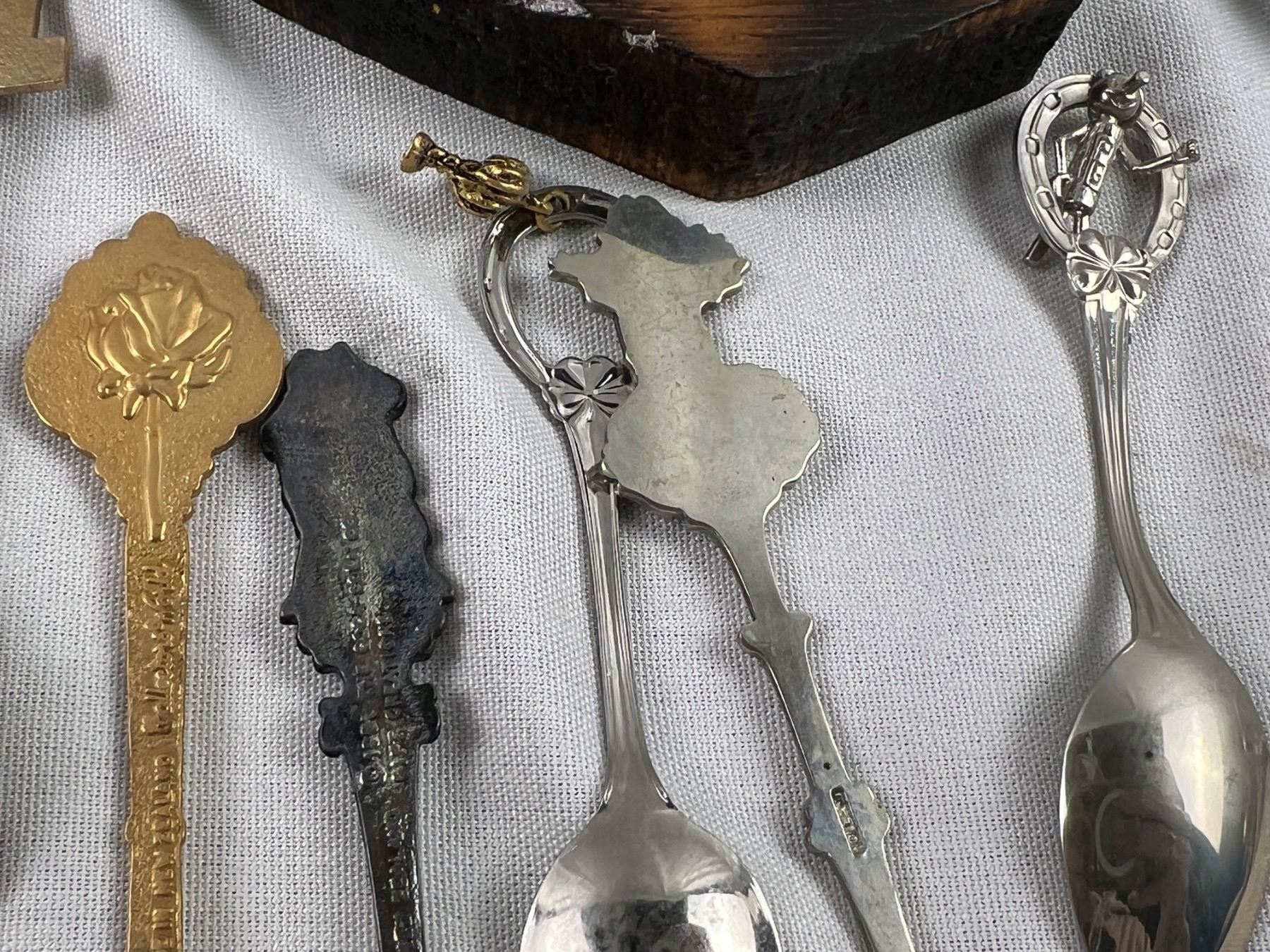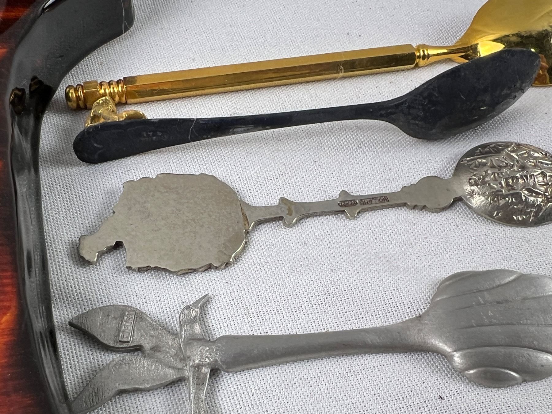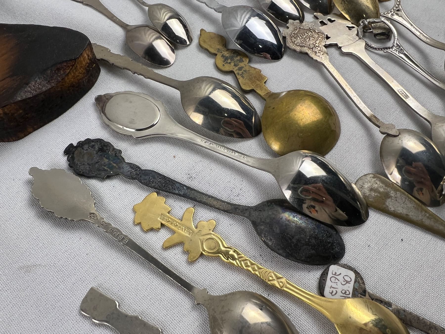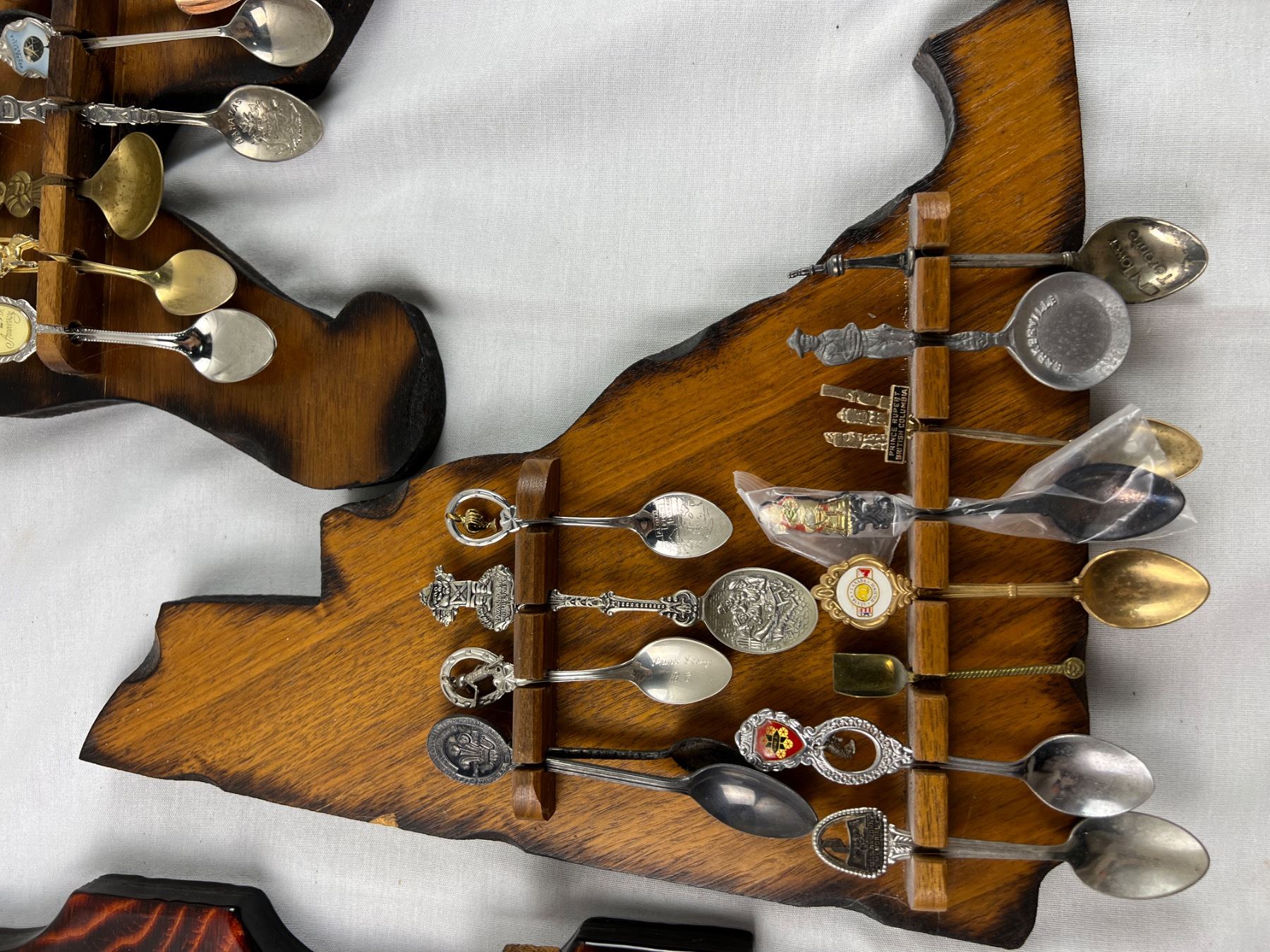 Includes a variety of spoons like E.P.N.S, Sunburst Copper, Irwin, E.P.C.M, and more, The wolf hanger is 16x8"