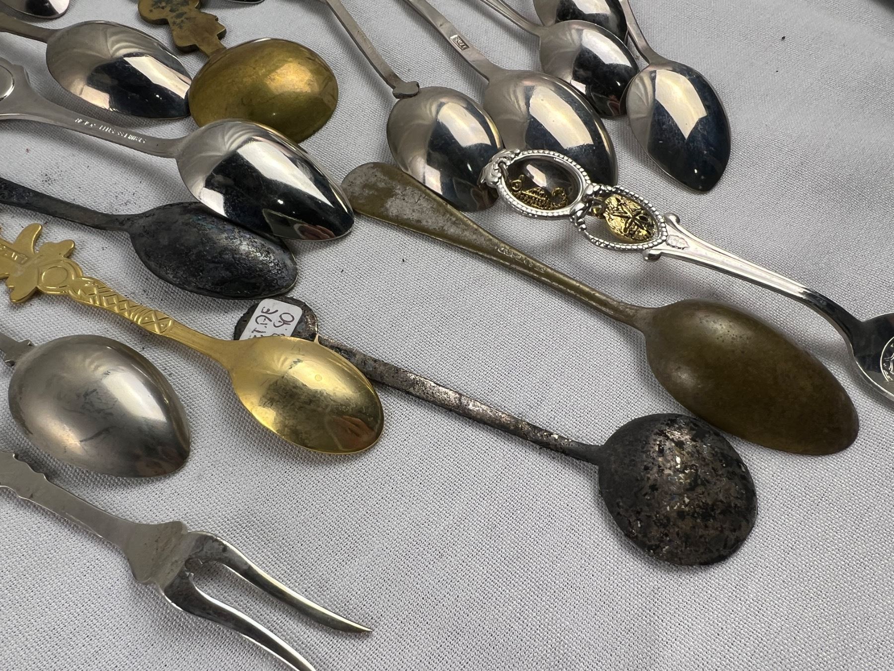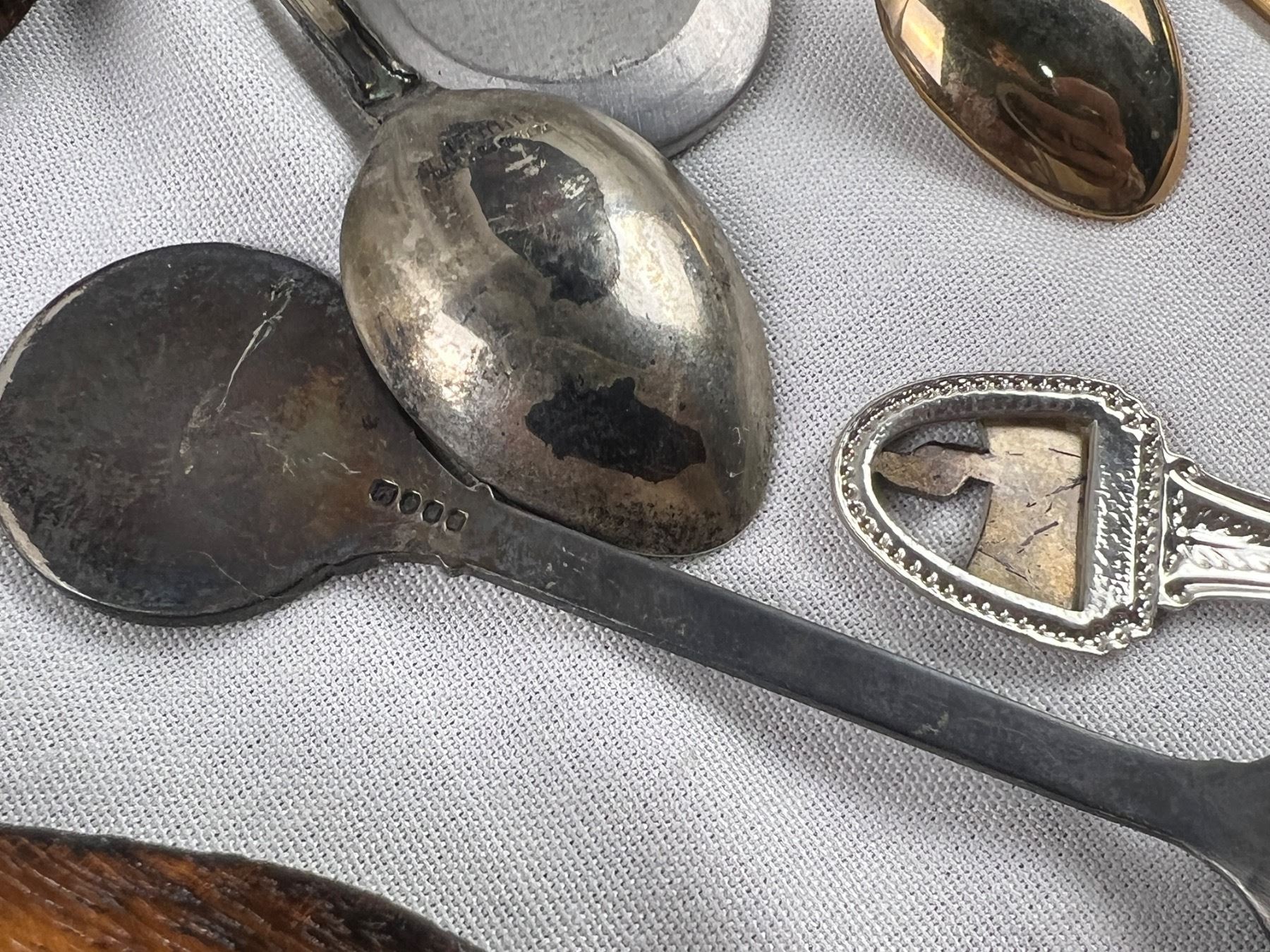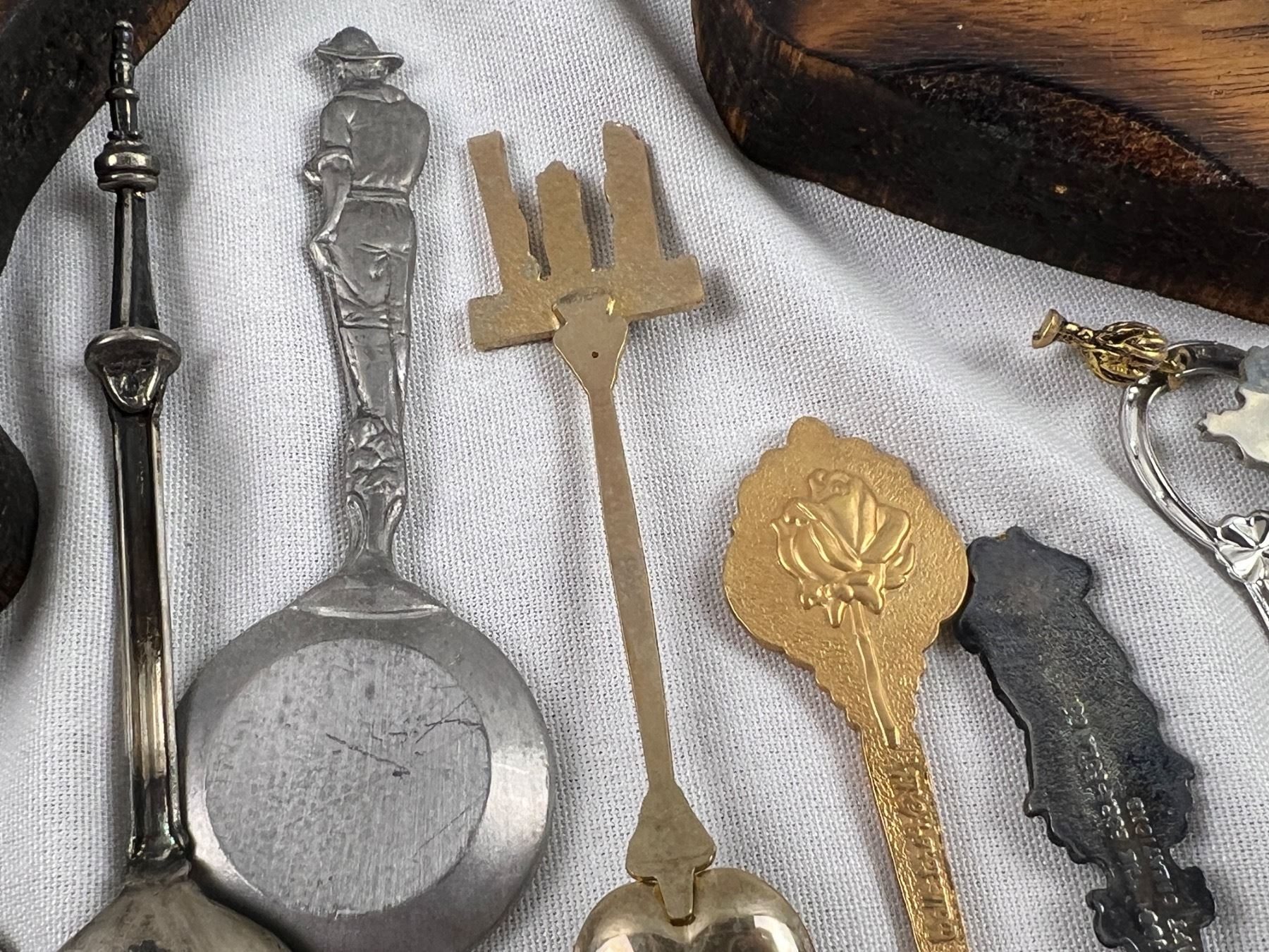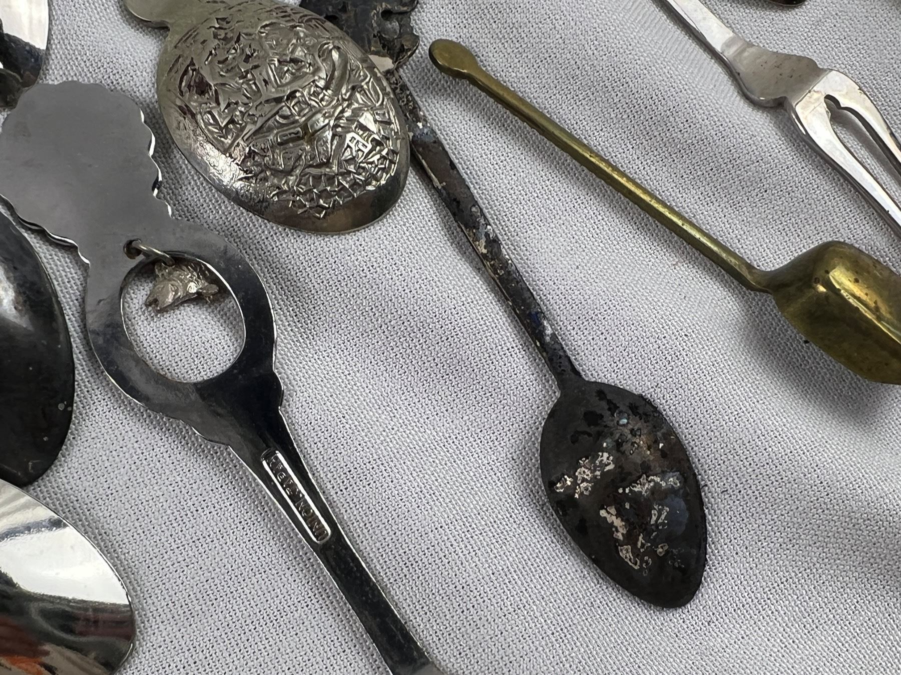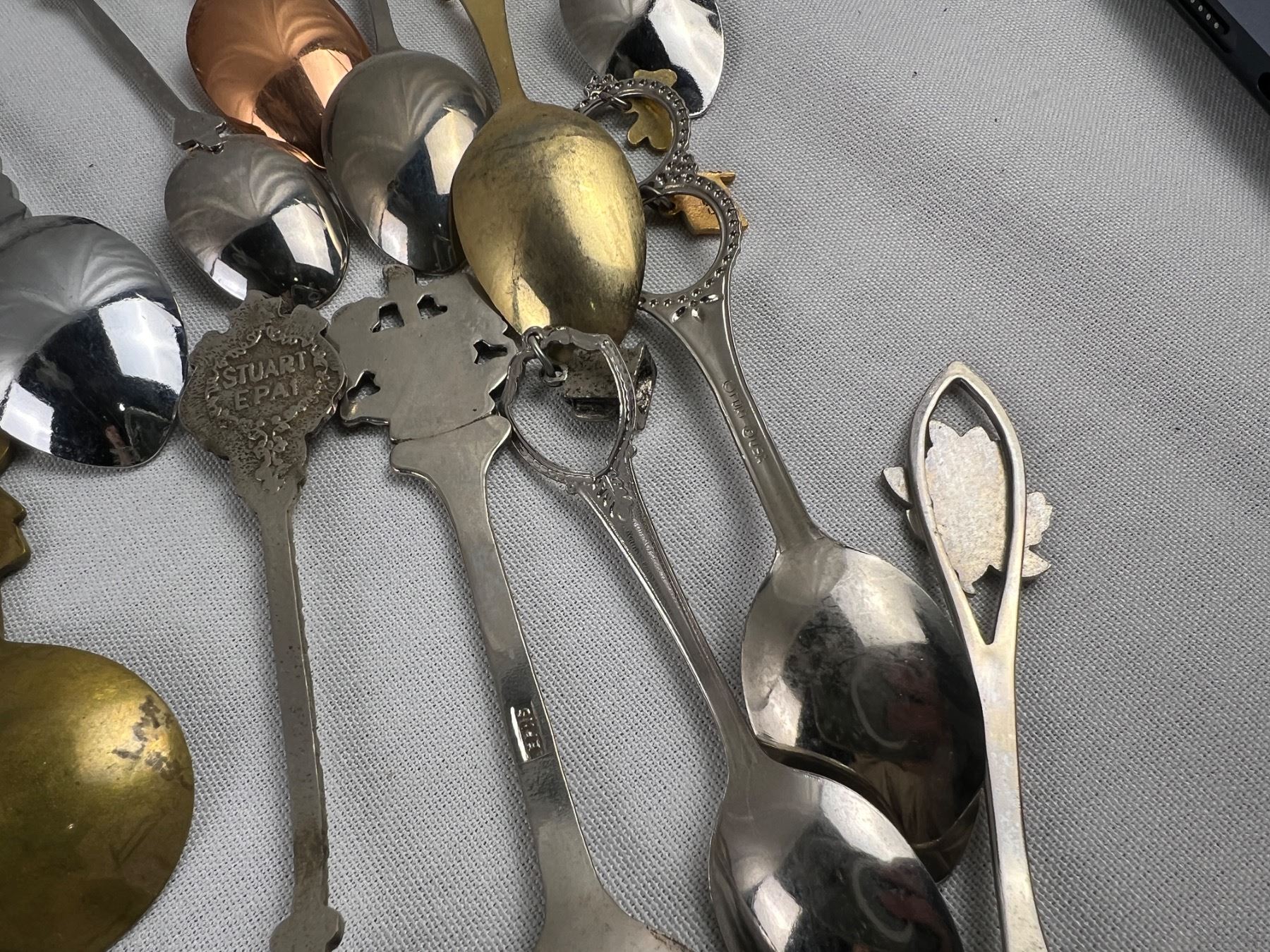Includes a variety of spoons like E.P.N.S, Sunburst Copper, Irwin, E.P.C.M, and more, The wolf hanger is 16x8"