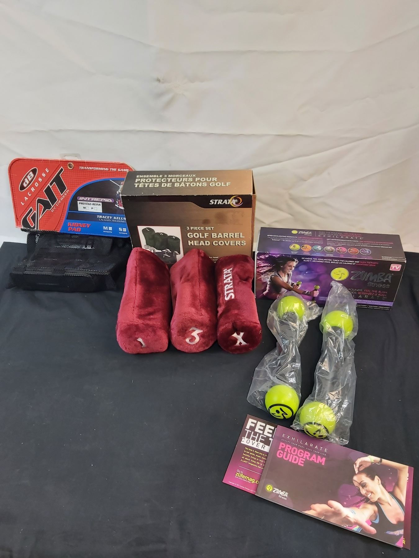 Includes, Strata Golf Barrel Head Covers, Lacrosse Gait Kidney Pad size sm, Zumba Toning Sticks