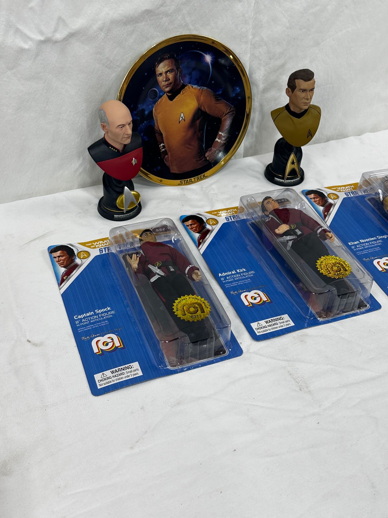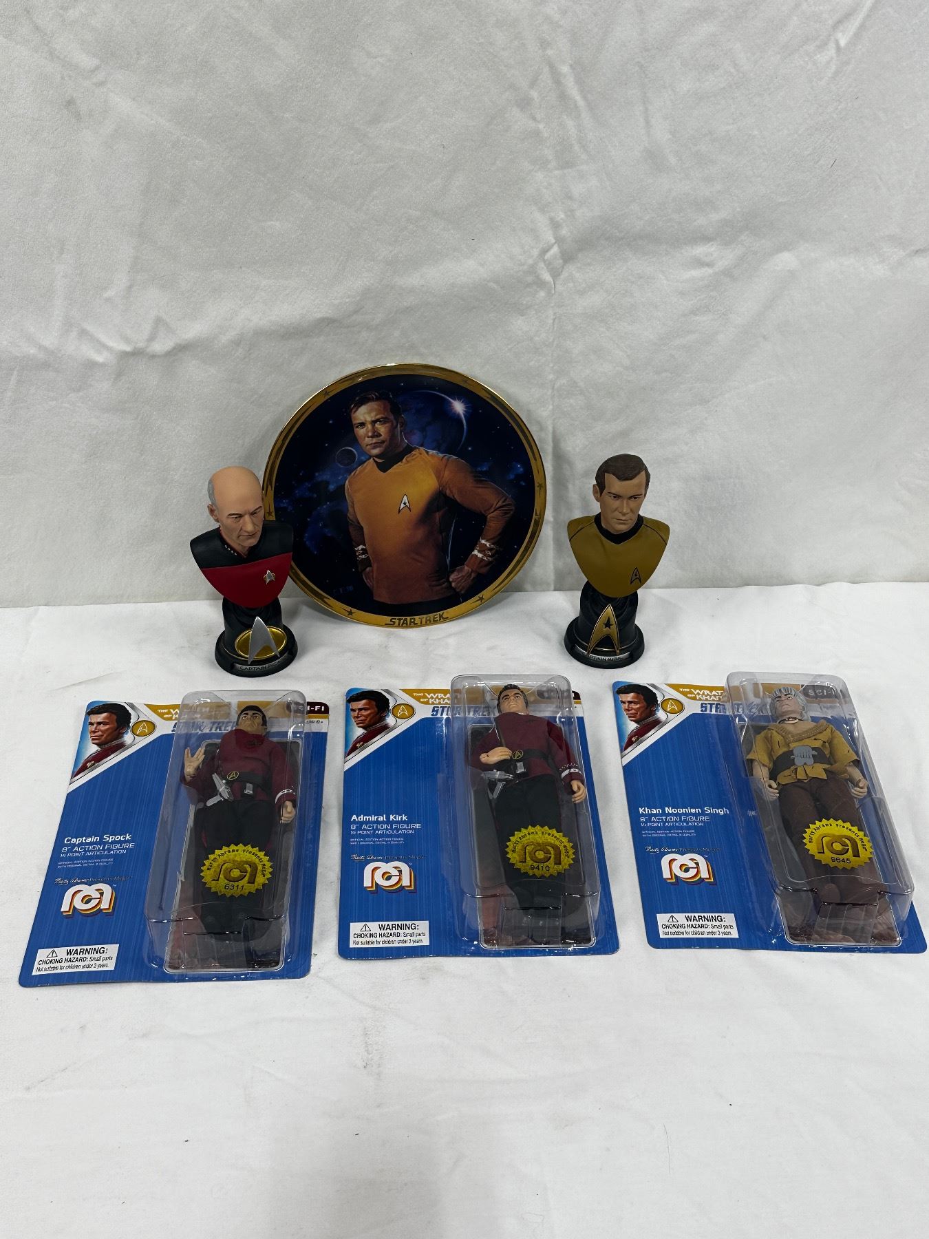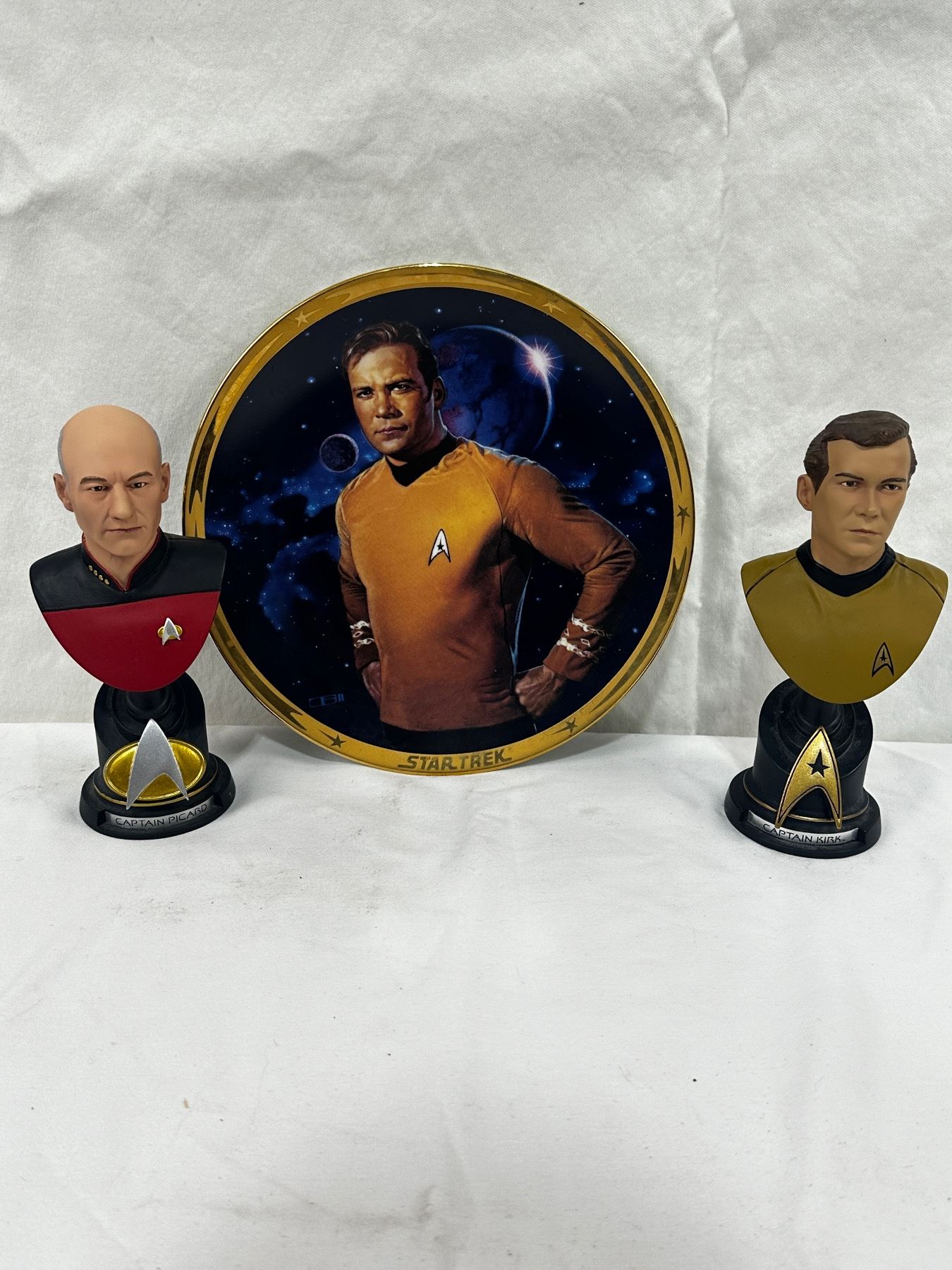 Includes The Star Trek 25th Anniversary Commemorative Collection KIRK Plate #2960H - Captain Picard and Captain Kirk Figurines each 7" tall - 3 8" action figures in boxes including Khan Noonien Singh, Admiral Kirk and Captain Spock.