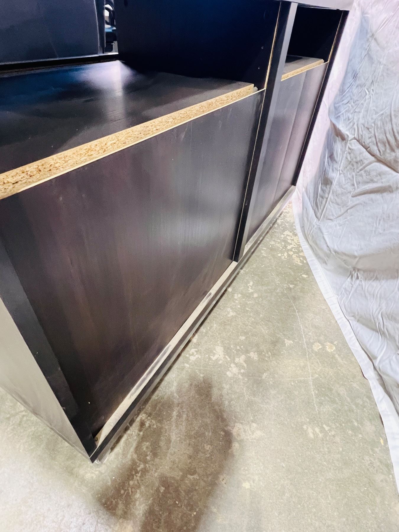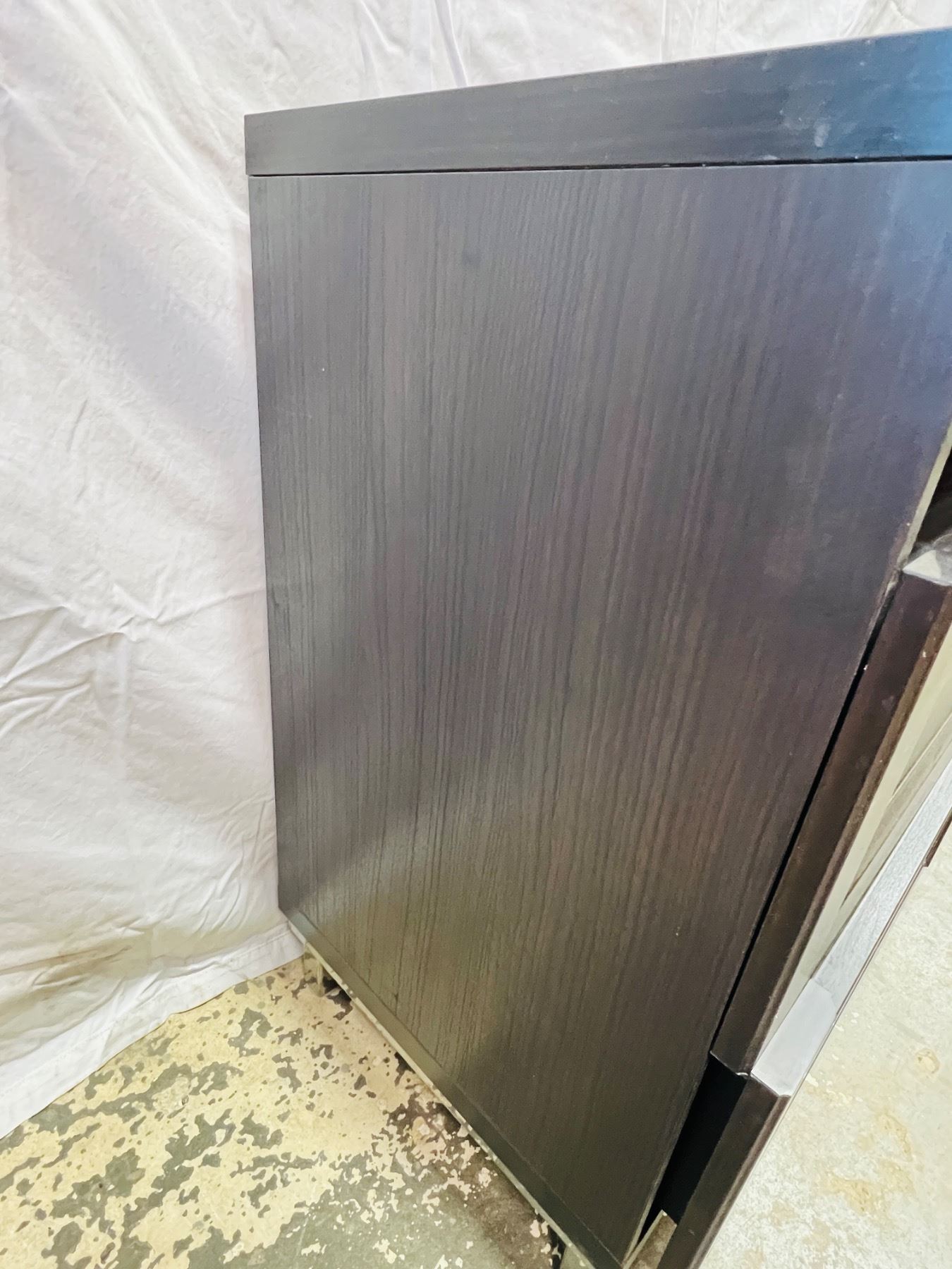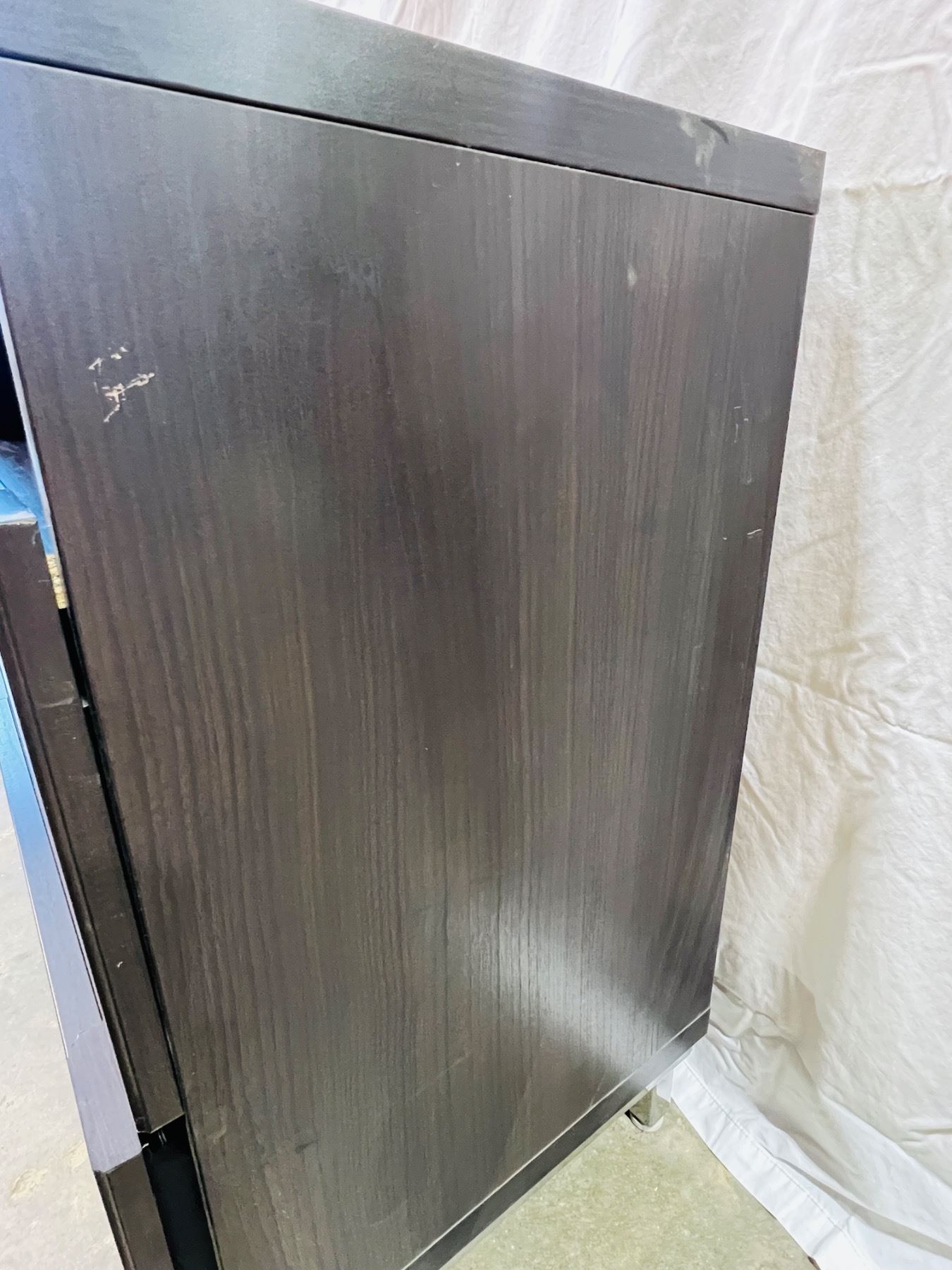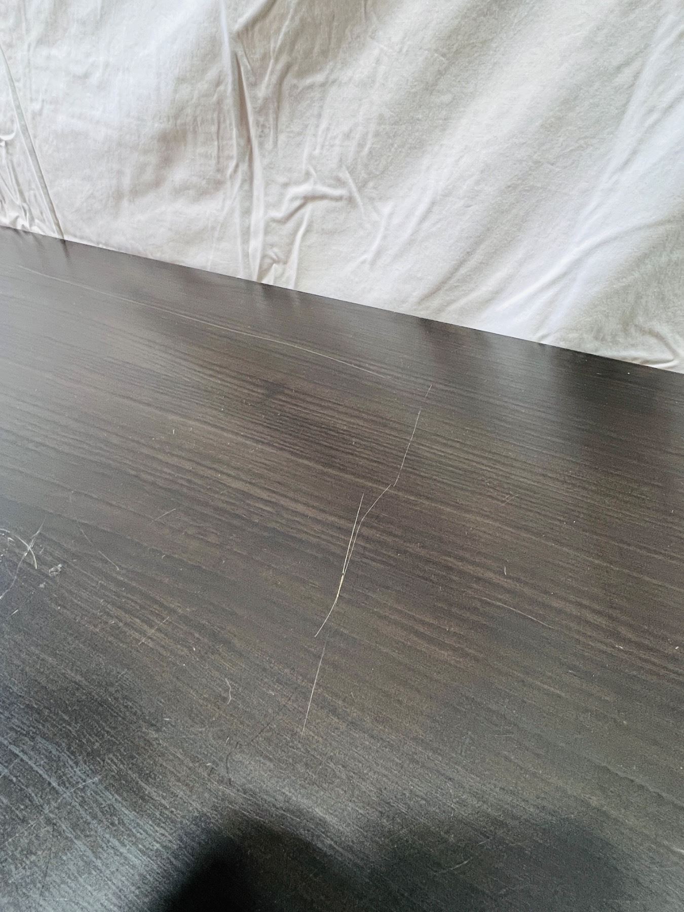 Measures 29"H 47x16", scratches and scuffs on top surface and edging, unstable stability