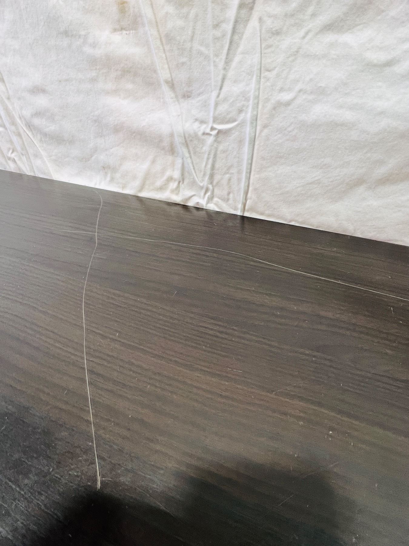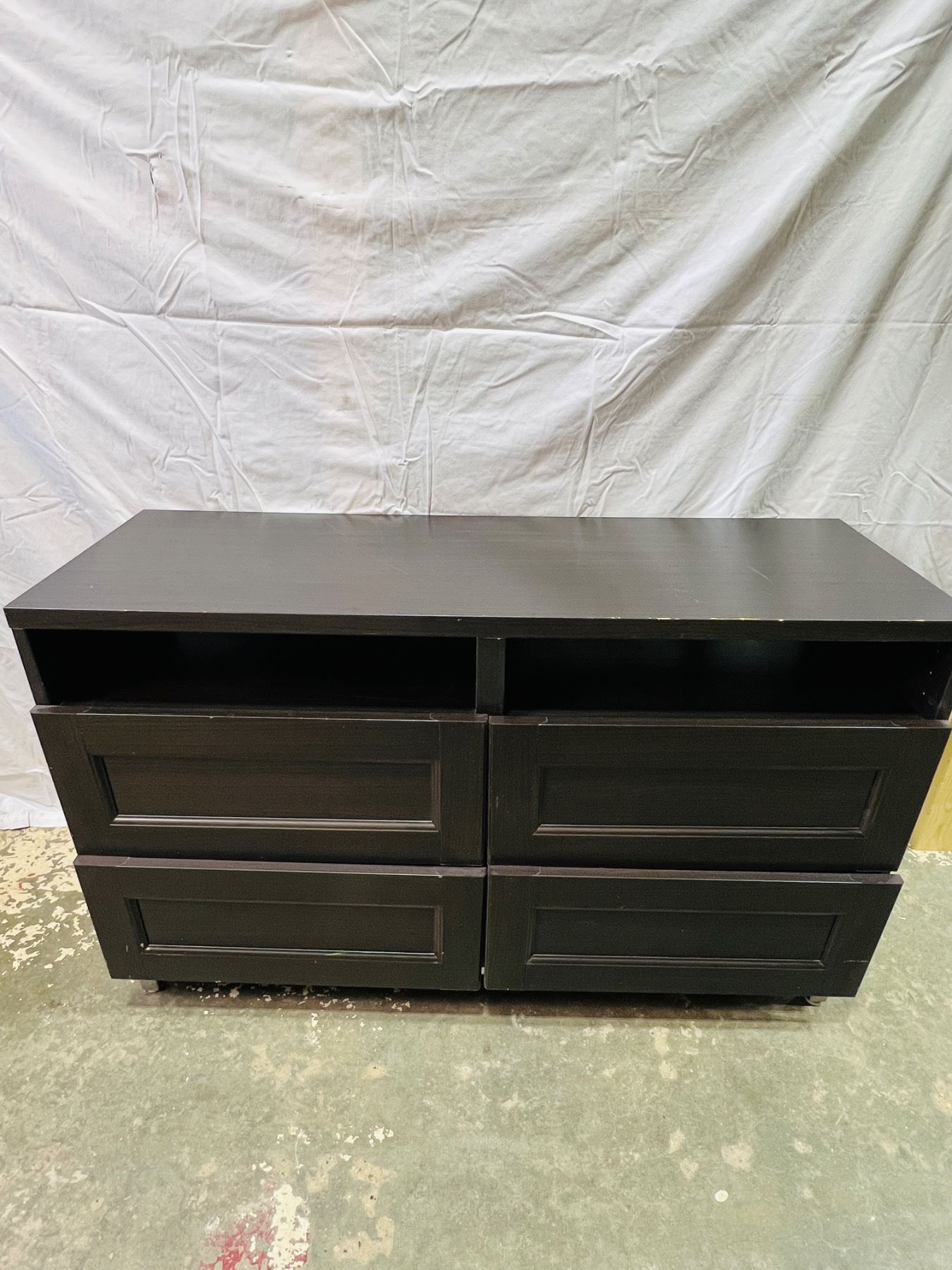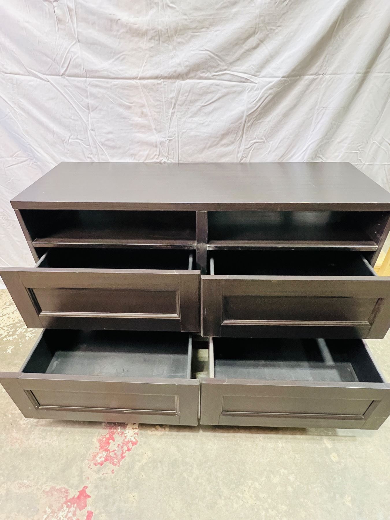 Measures 29"H 47x16", scratches and scuffs on top surface and edging, unstable stability