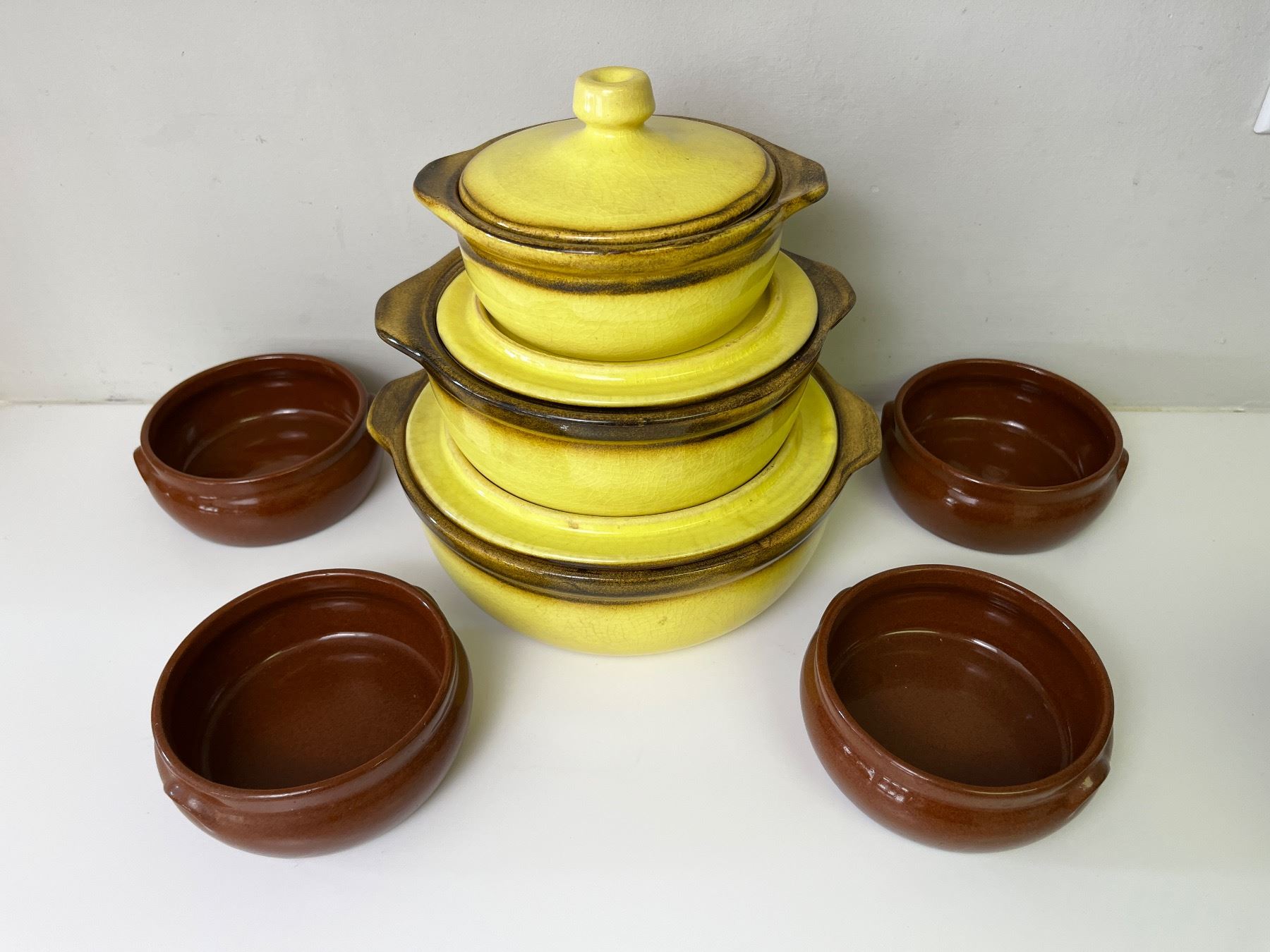 Includes 3 Medalta casserole dishes, 4 Sunburst french onion soup bowls, both in good used condition