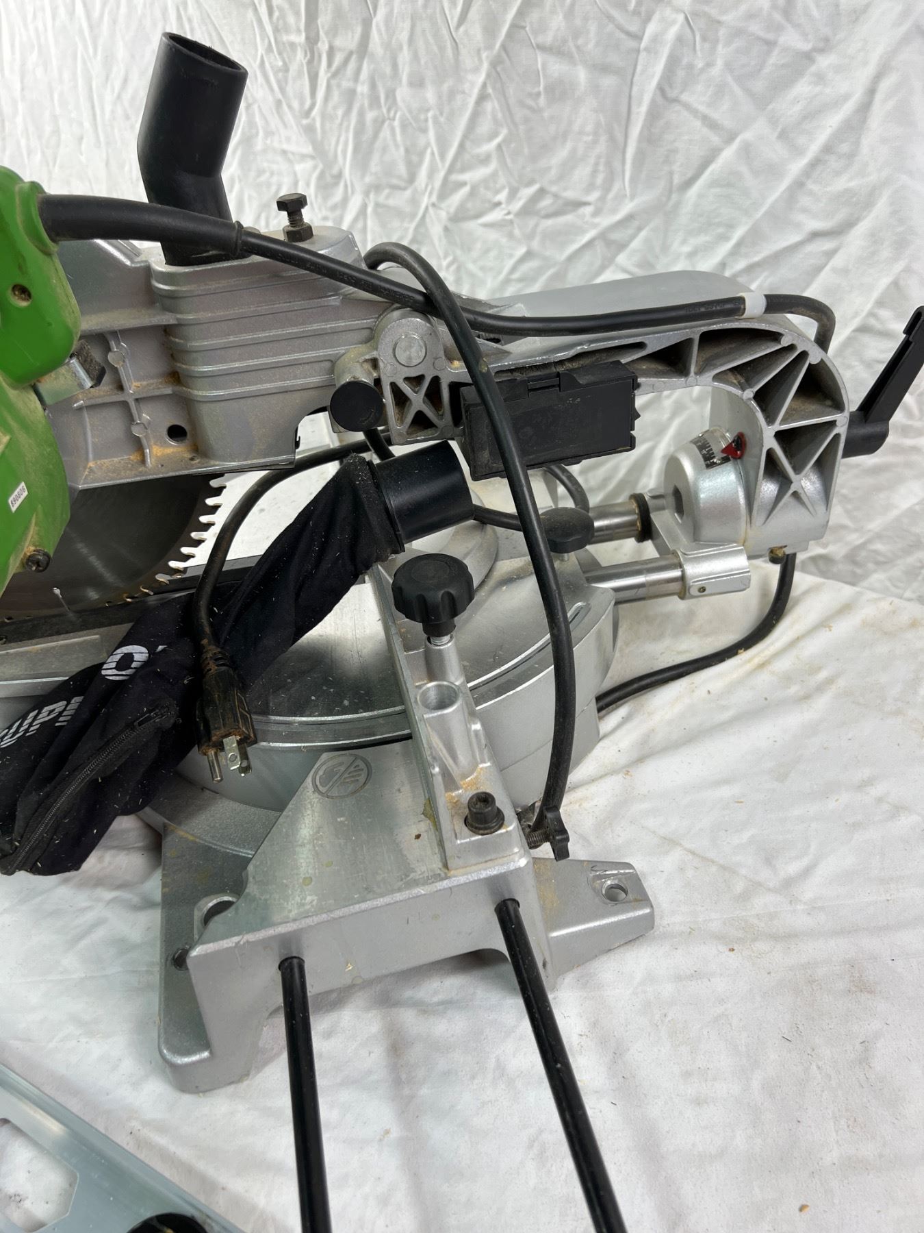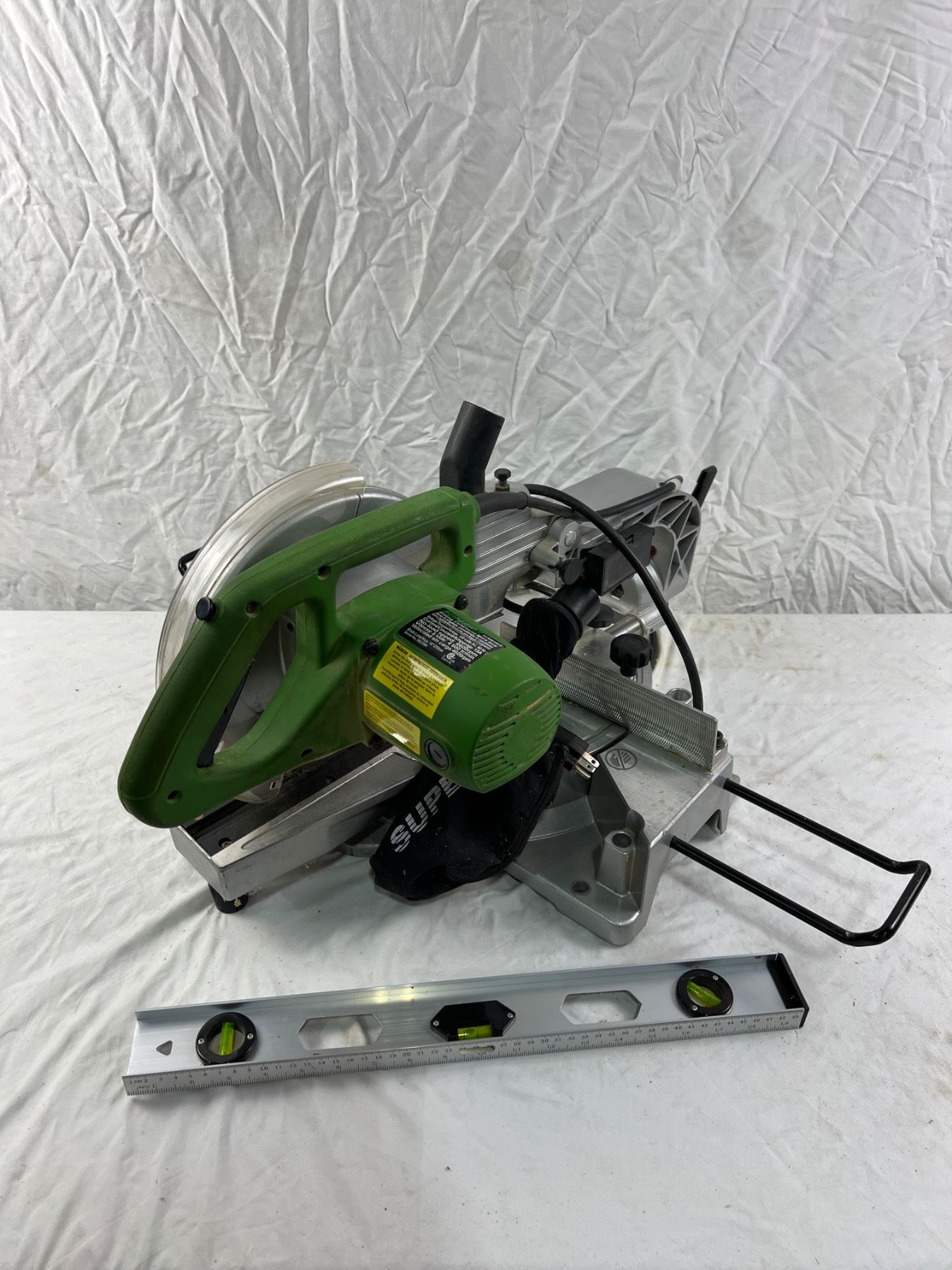 Sliding functionality. Powers on. Sawdust marks on machine. Also includes level with measurements.