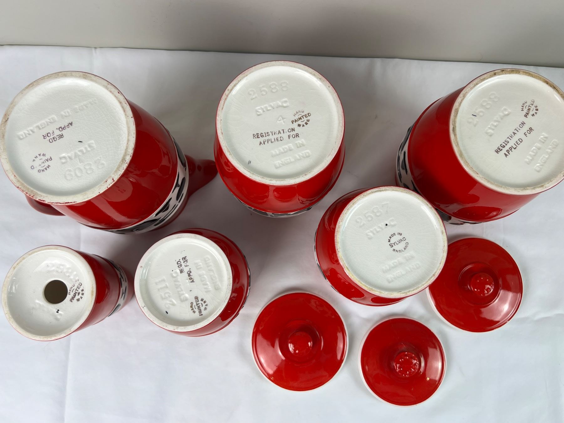 One of the lids on the jars is cracked, shaker jar is missing the stopper, The large pitcher is 7.5"H