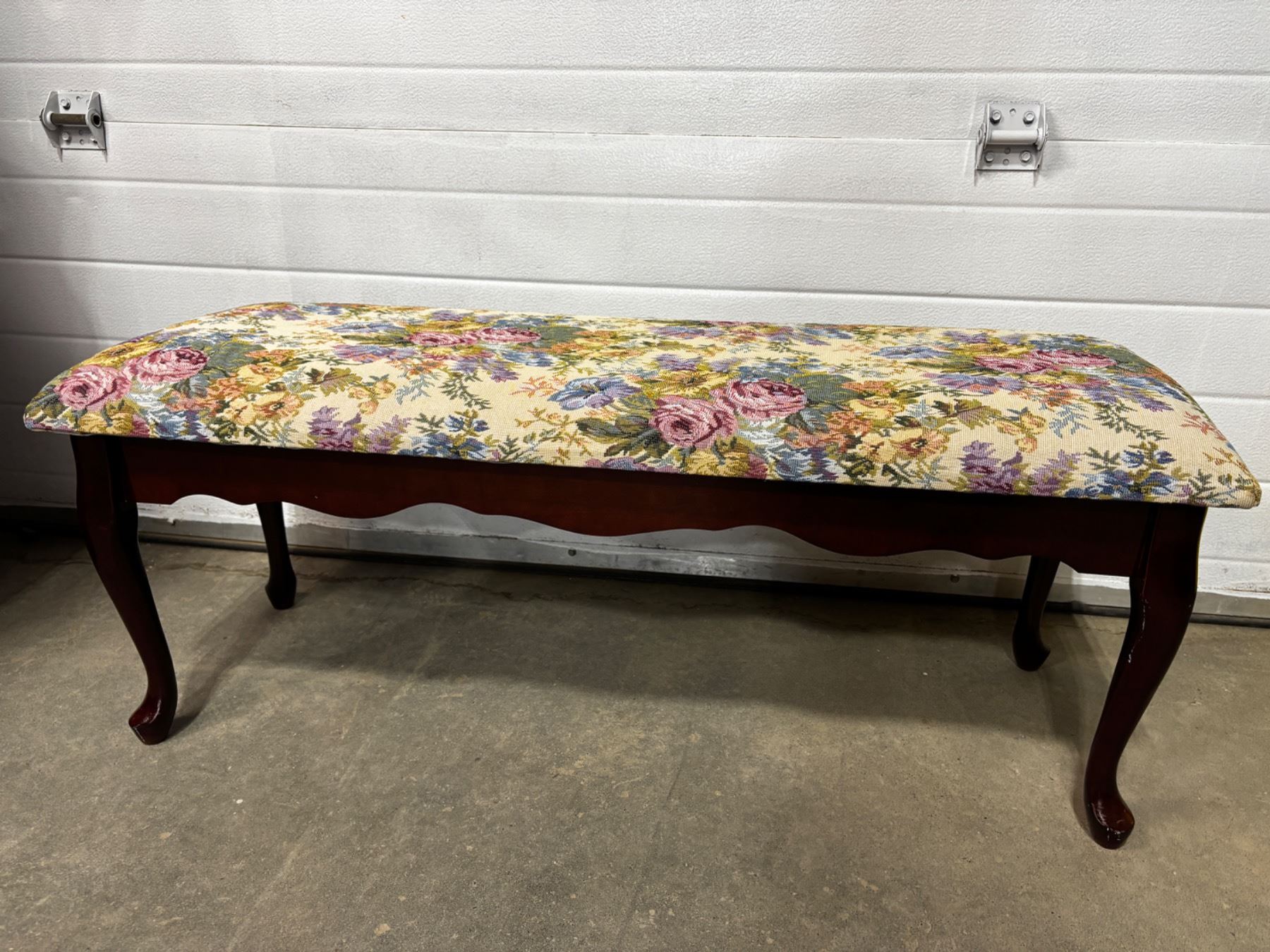 43" wide, 15" deep and 17" high. Some scratches and scuffs on legs.