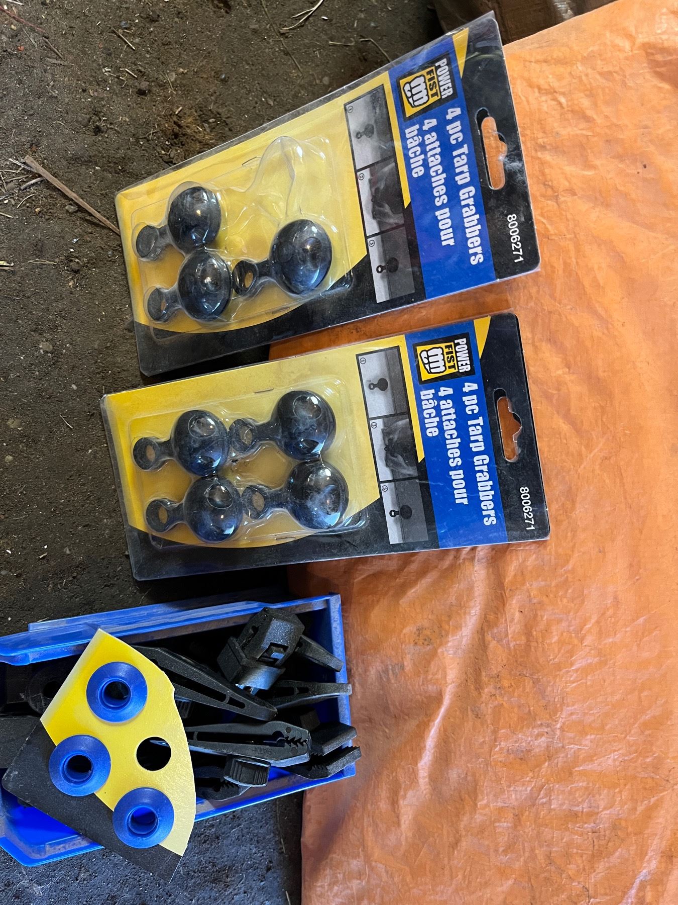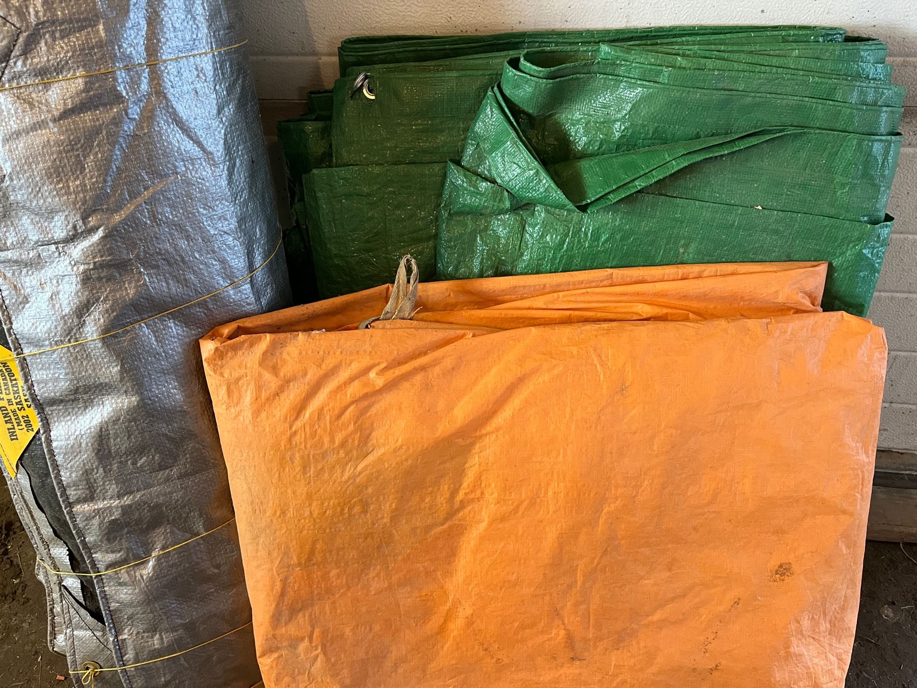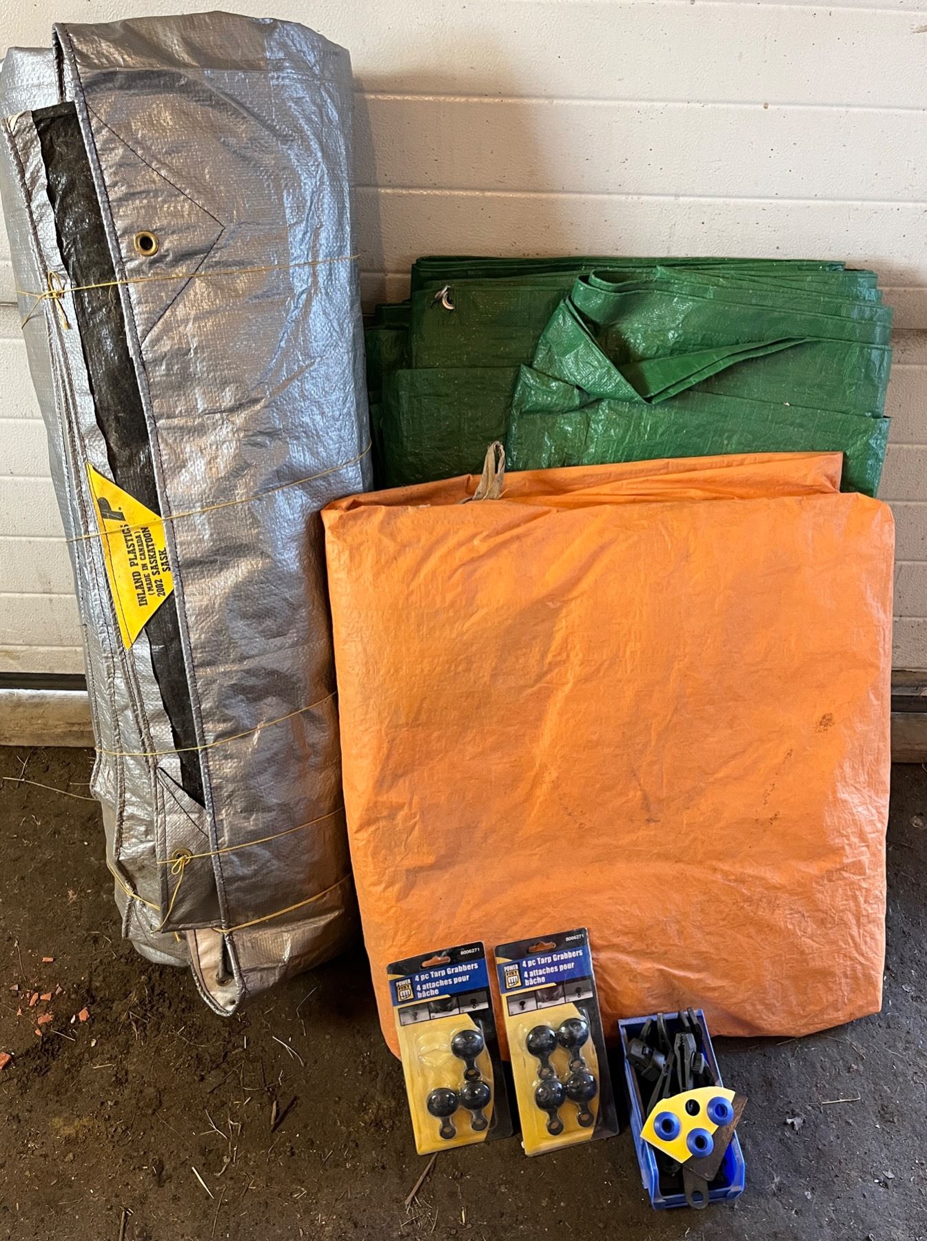 3 large tarps - 1 made by inland plastics with various tarp clips