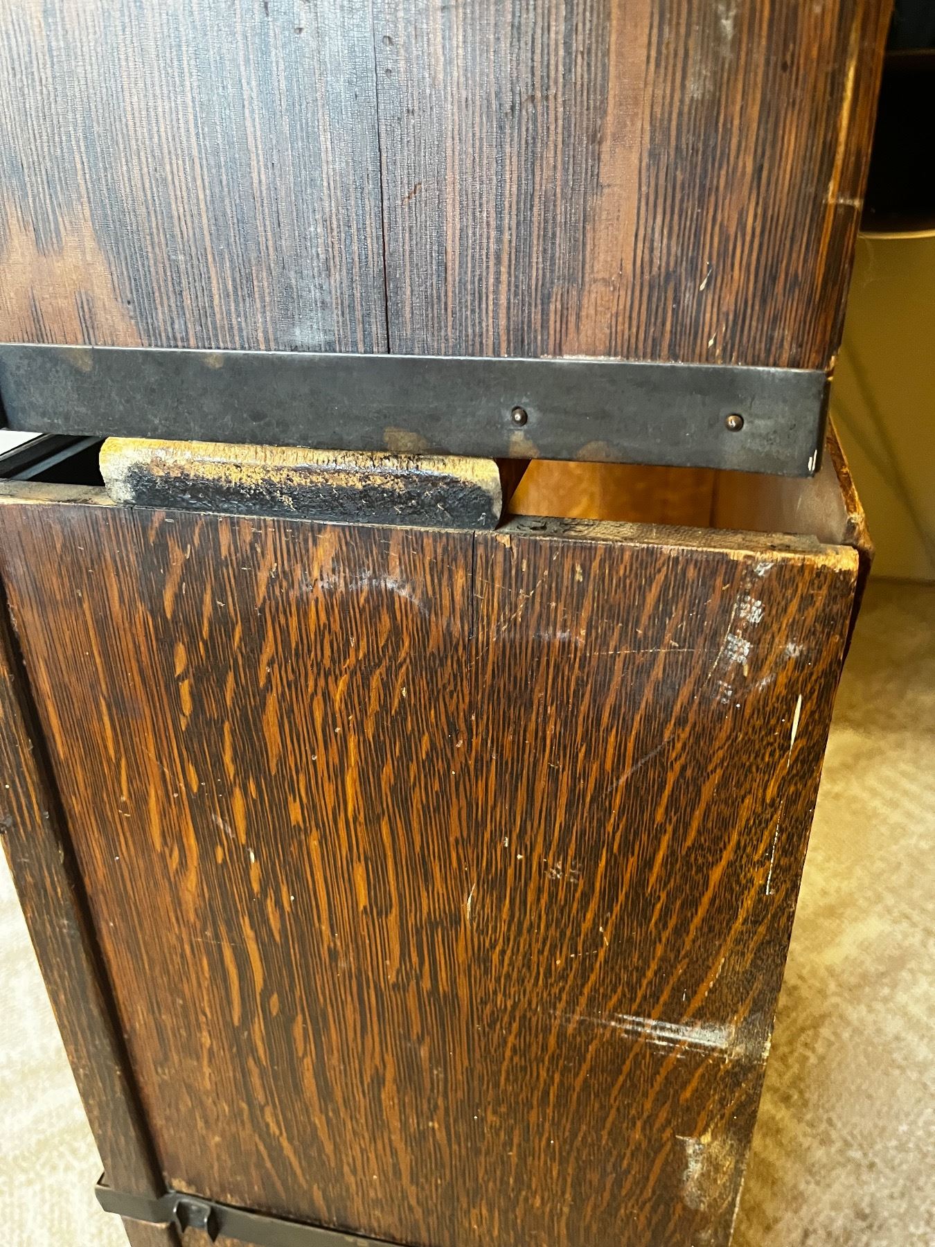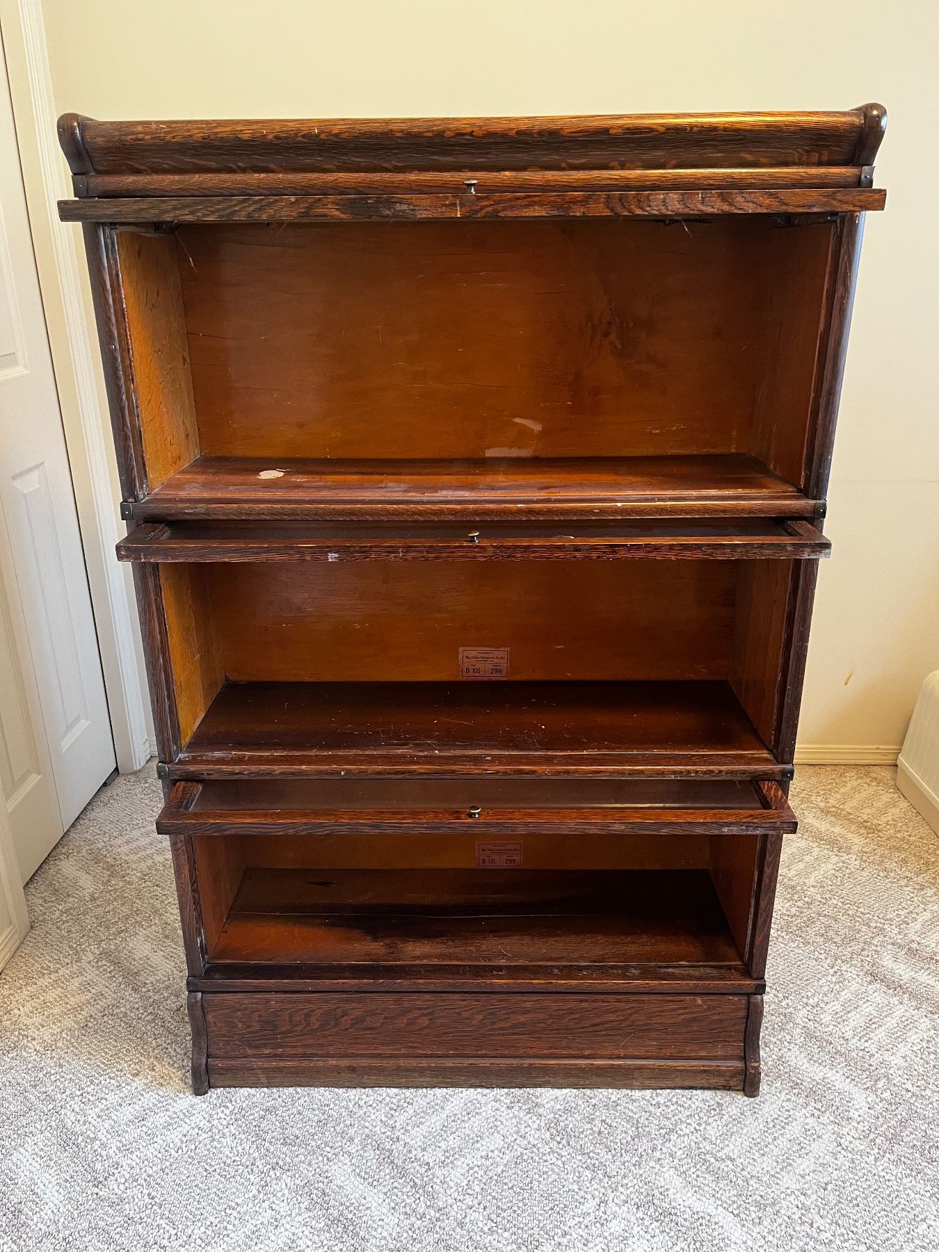 Worn condition, missing glass on top shelf, 34"l x 12"W x 53"H, 3pcs