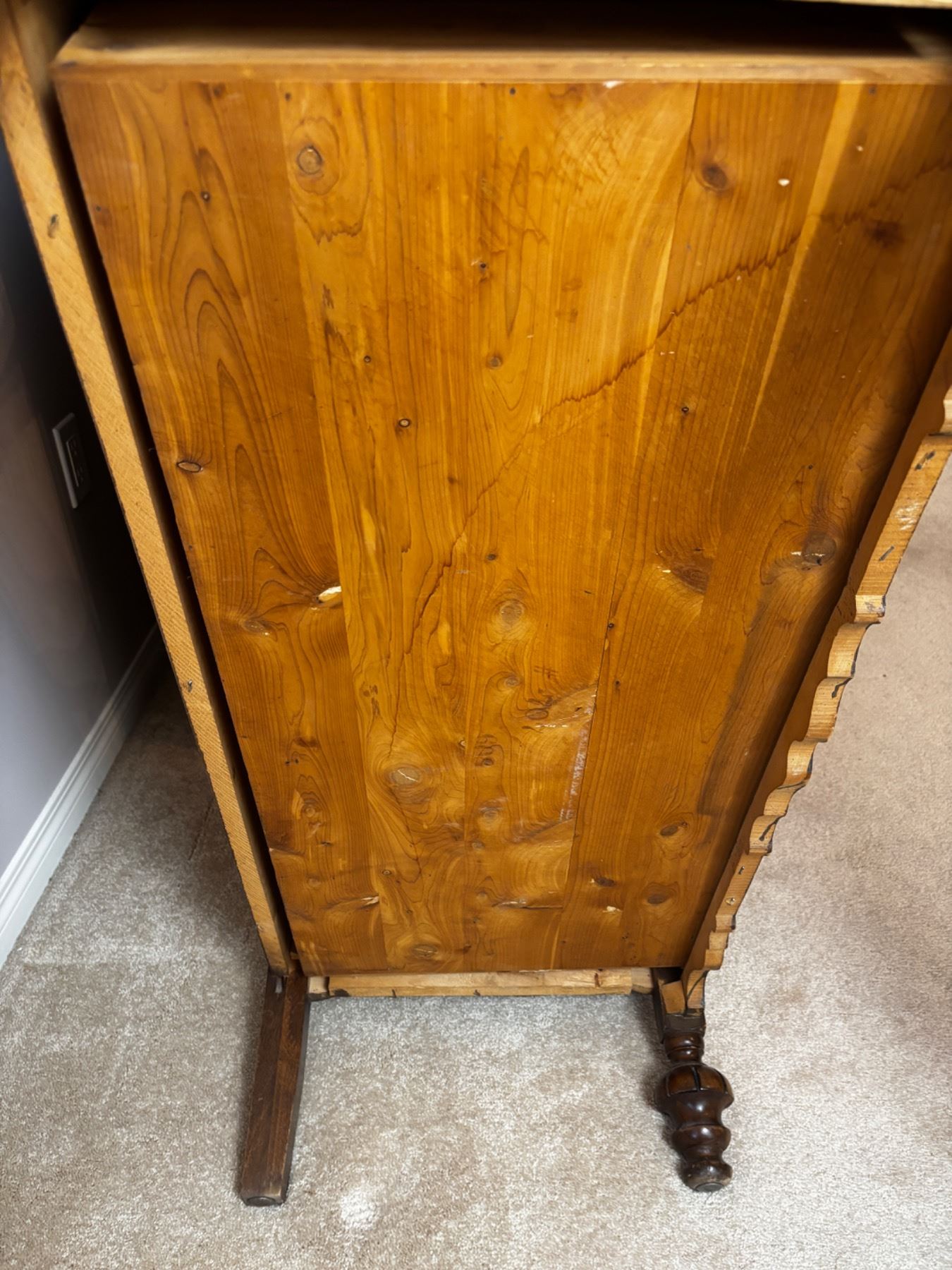 Approximately 40." long by 18.5" wide by 24" tall. Wear to legs and outer wood surface. Interior wood panels have begun to crack and the right side has cracked completely.
