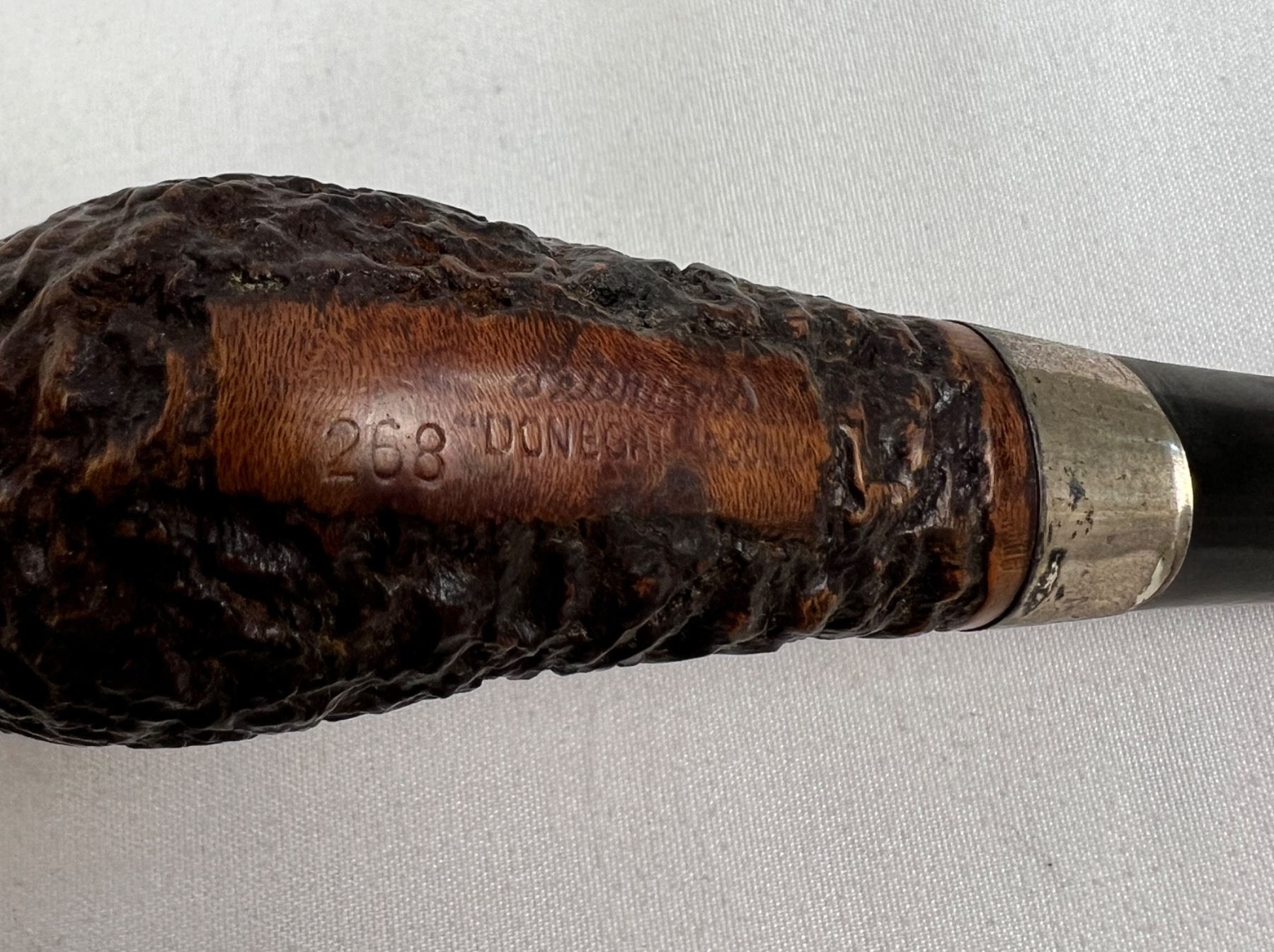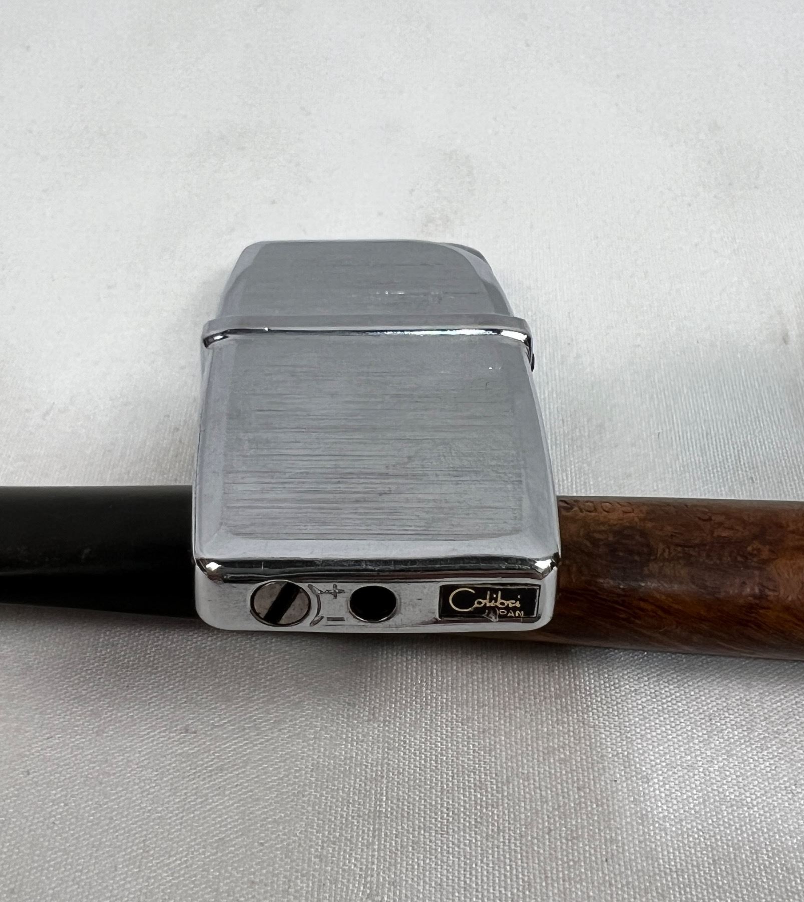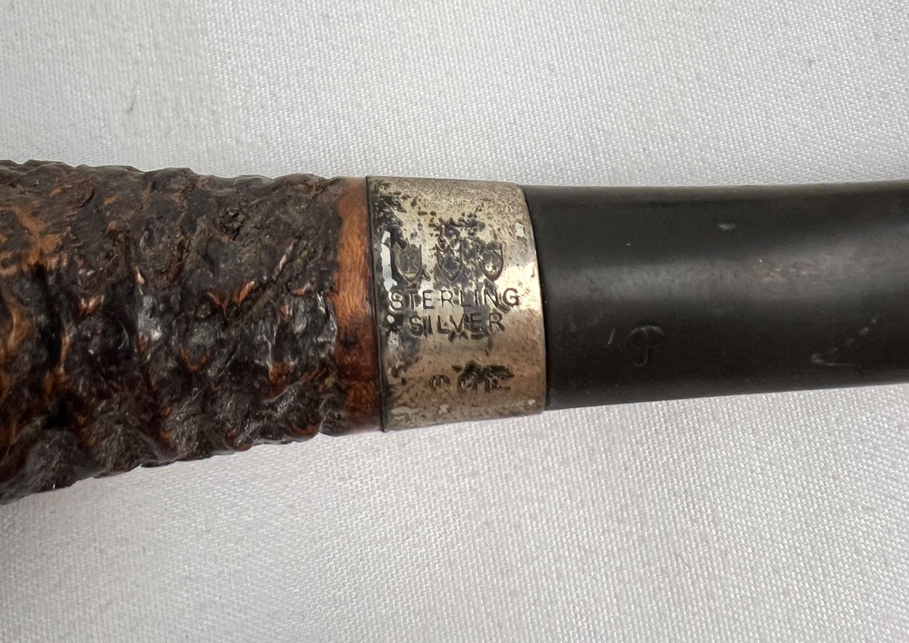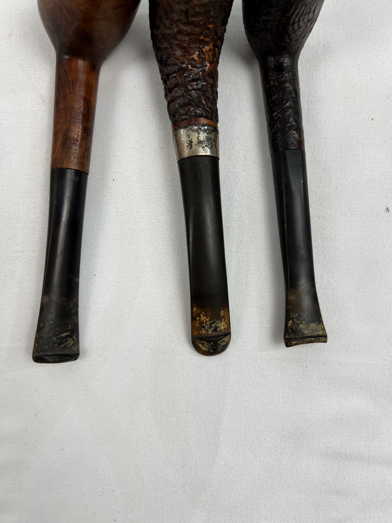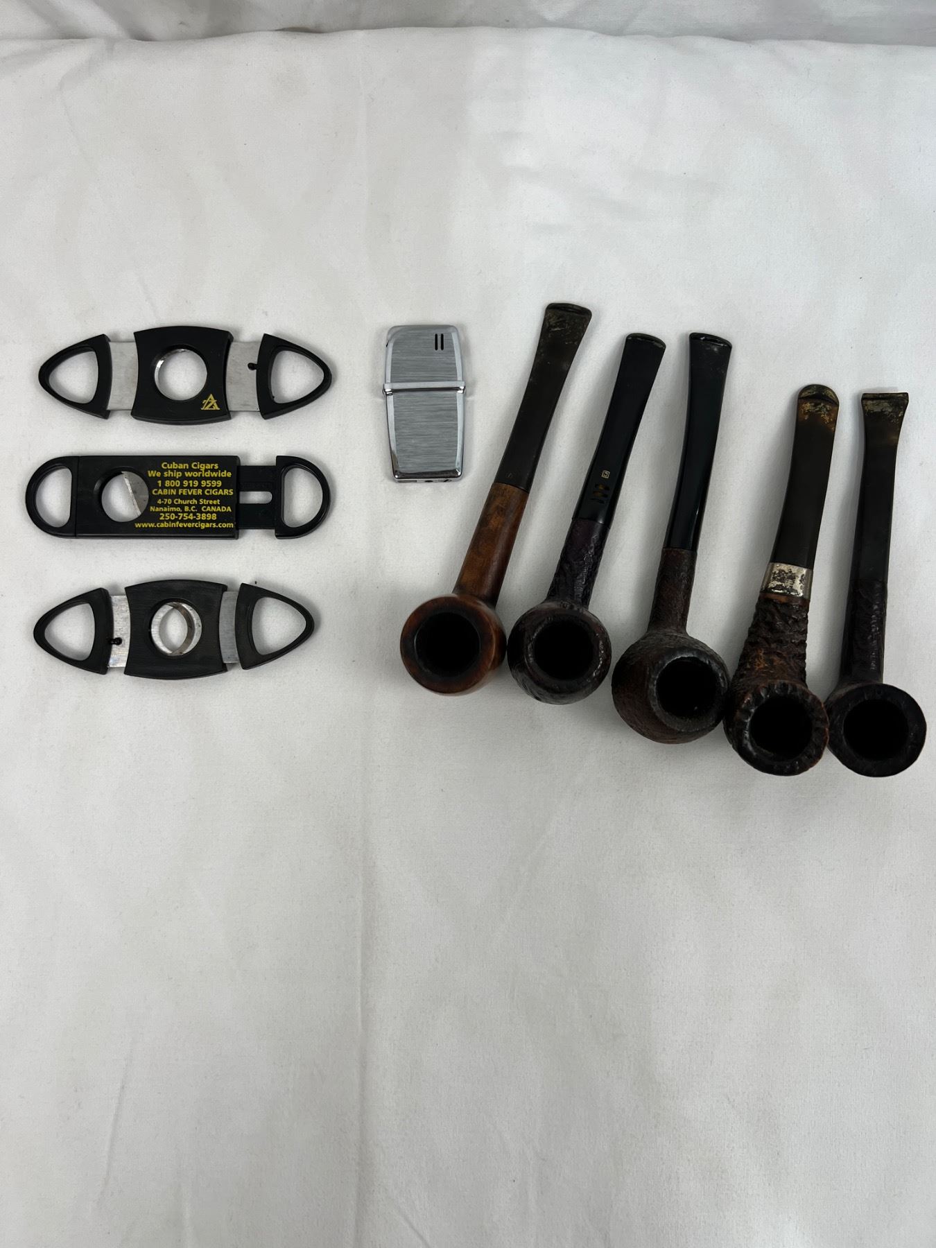 One of the pipes has a sterling silver band. Pipes in varying levels of condition, mostly around mouthpieces, as well as cutters. Also includes a Calibri lighter. Not working but there is spark.
