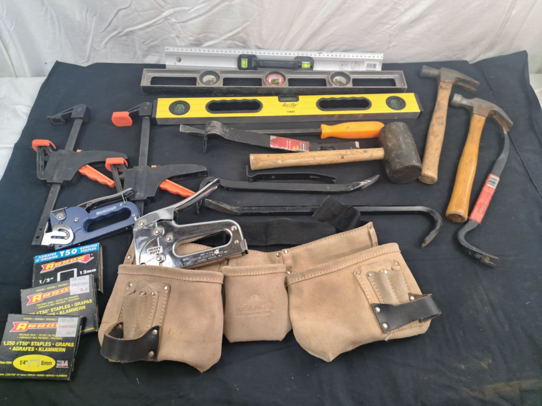 Includes, Levels, hammers, Tuf-E-Nuf tool belt, Mastercraft stapler, etc.