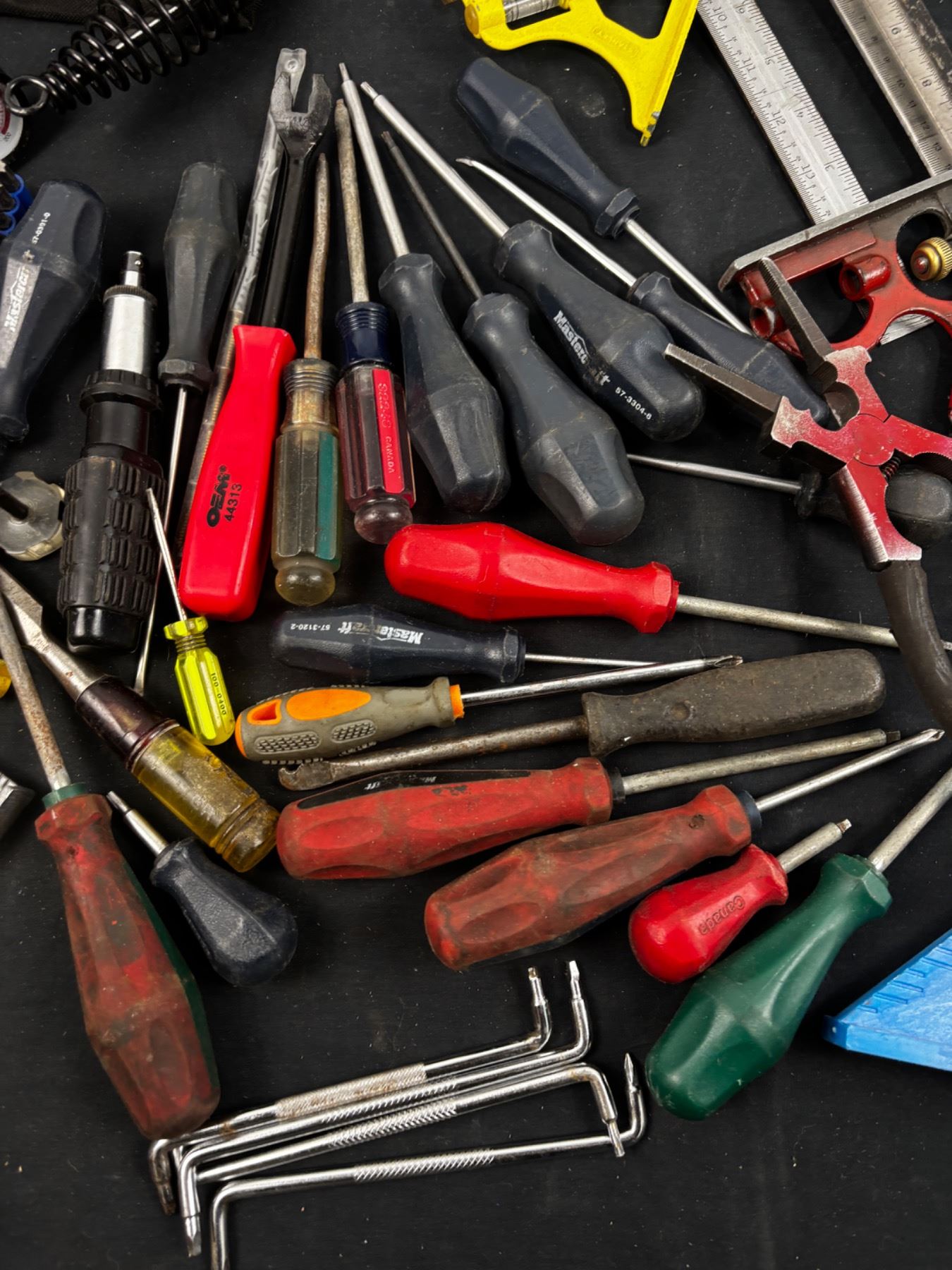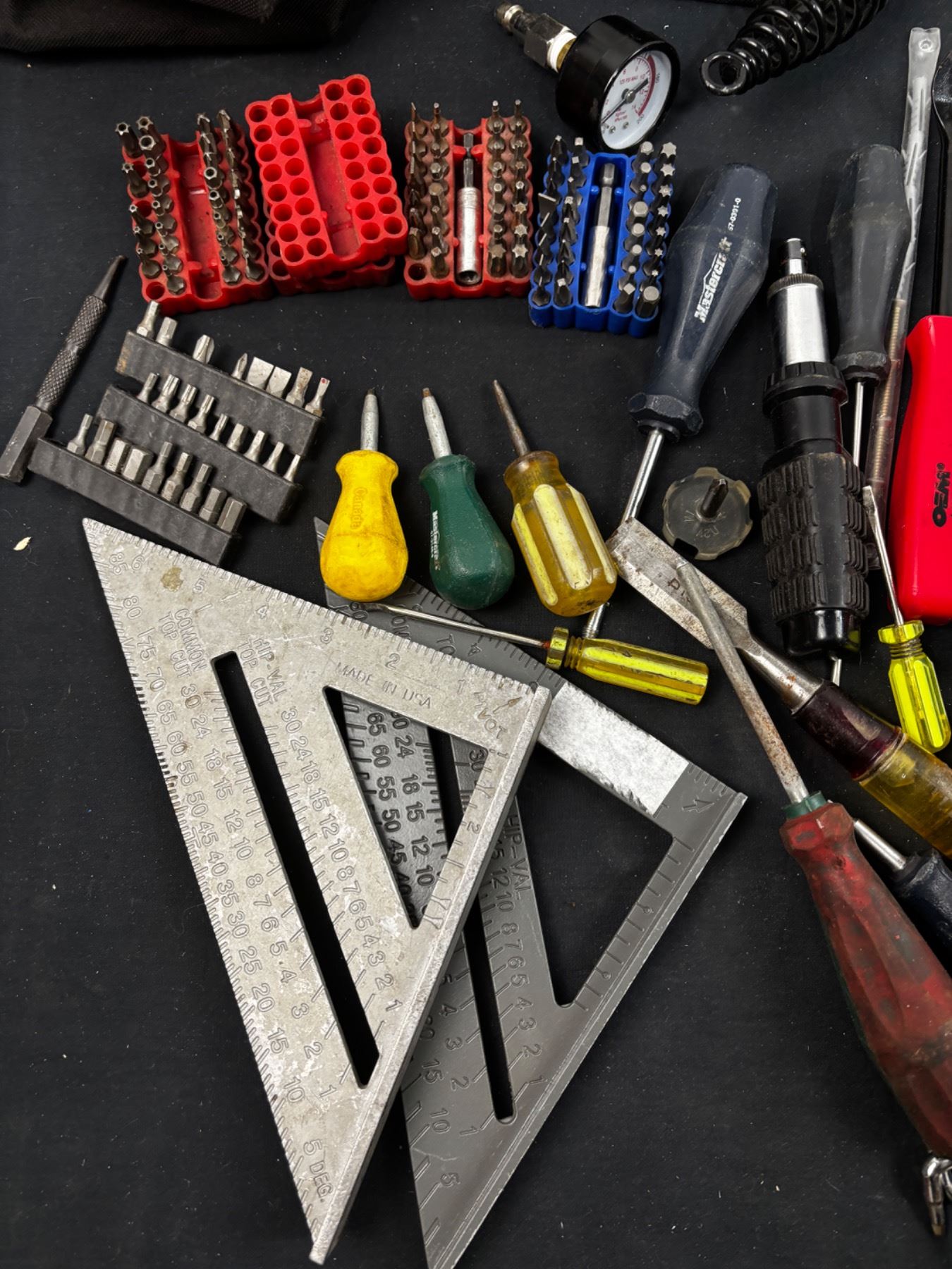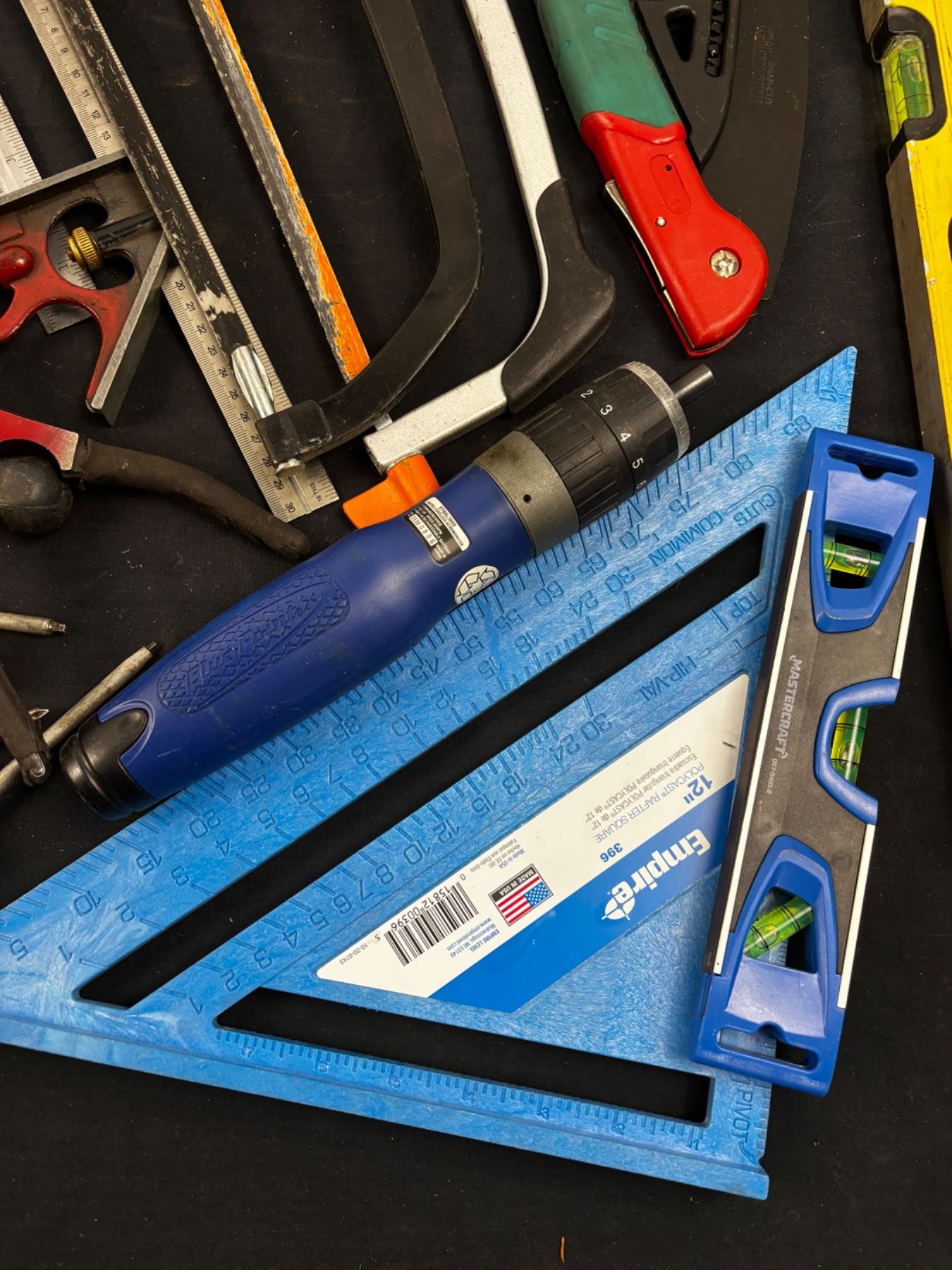 Includes, Powerfist Tool Belt, Lighted Cordless Screwdriver No. ETBSL3659 (works), Hand tools, Levels, and more