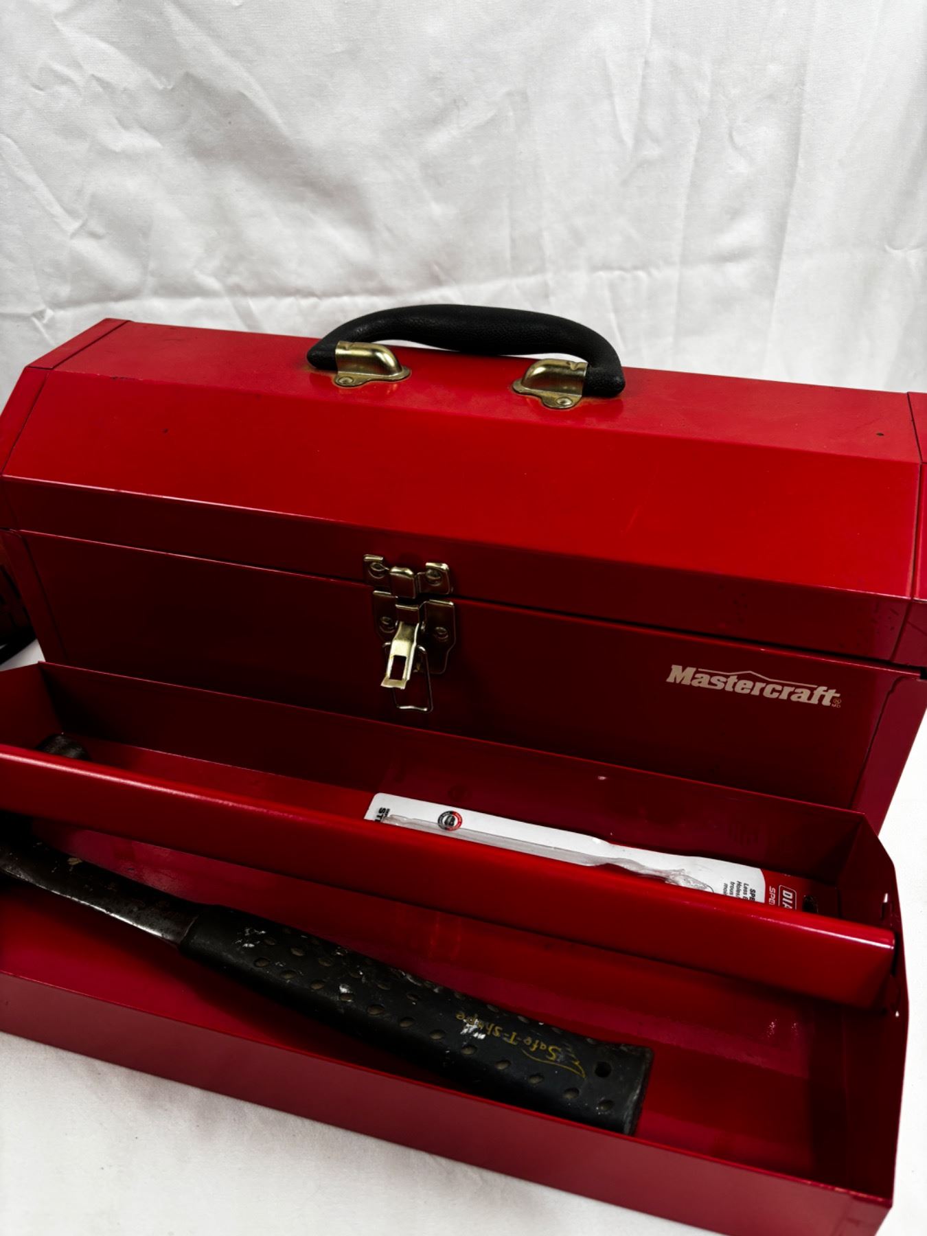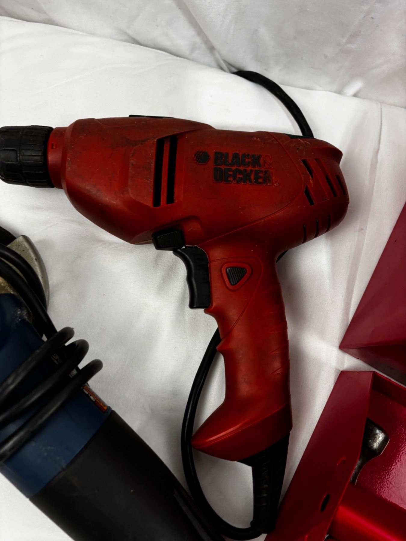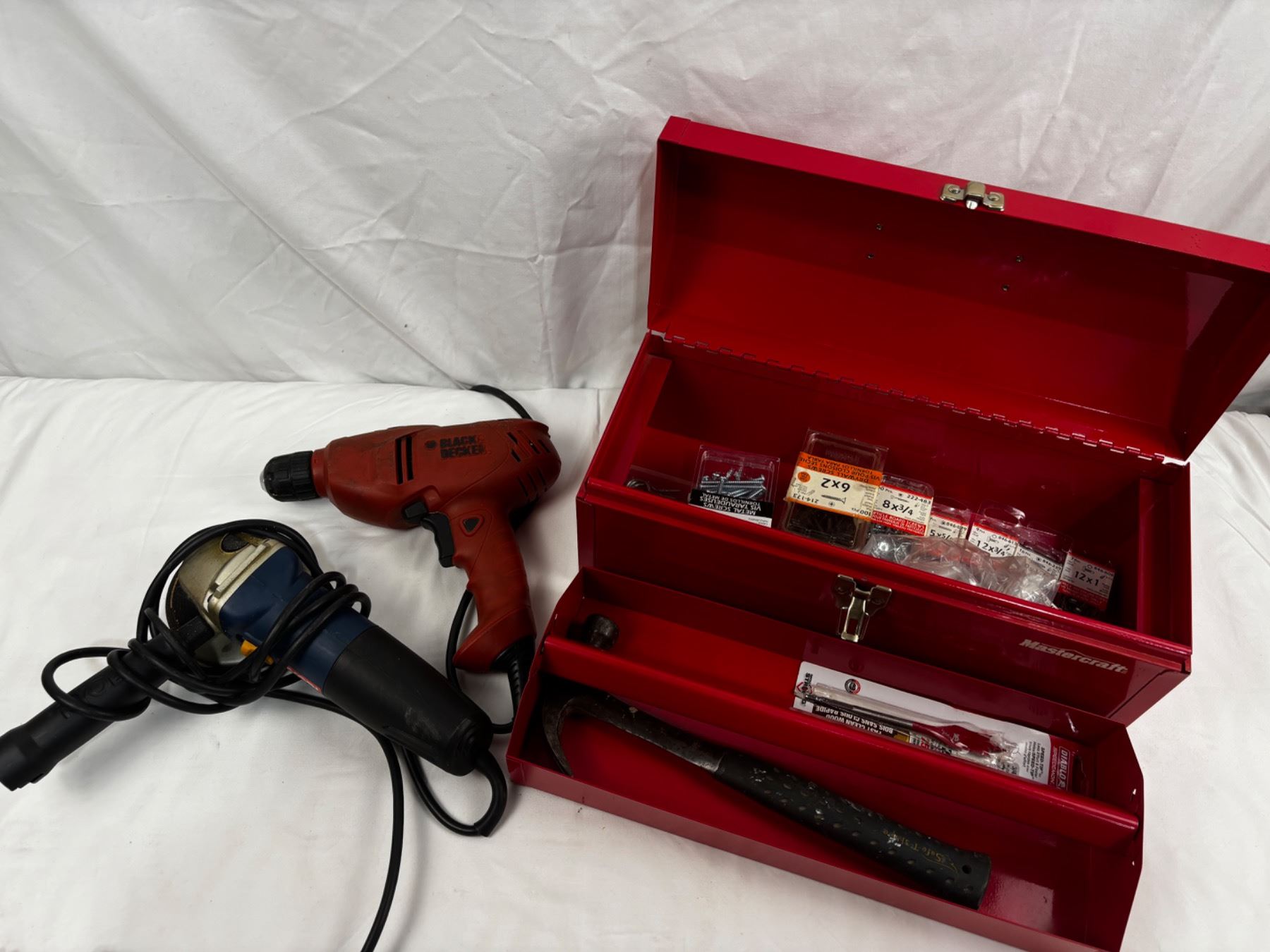 Includes, Mastercraft Toolbox with content (17"L x 7"W x 7.5"H), Black & Decker Drill No. DR201, Ryobi Grinder No. AG402, Both power tools turn on