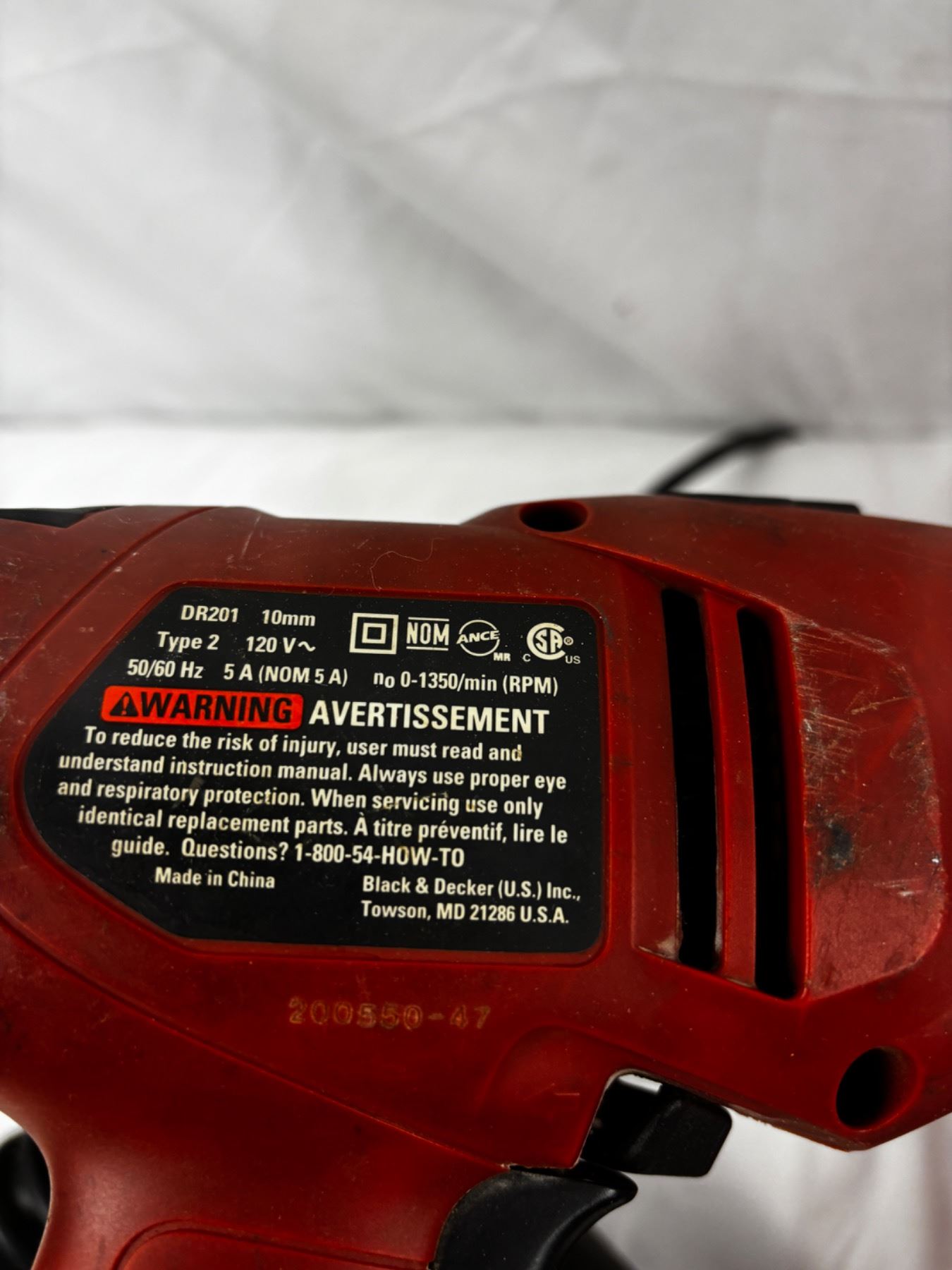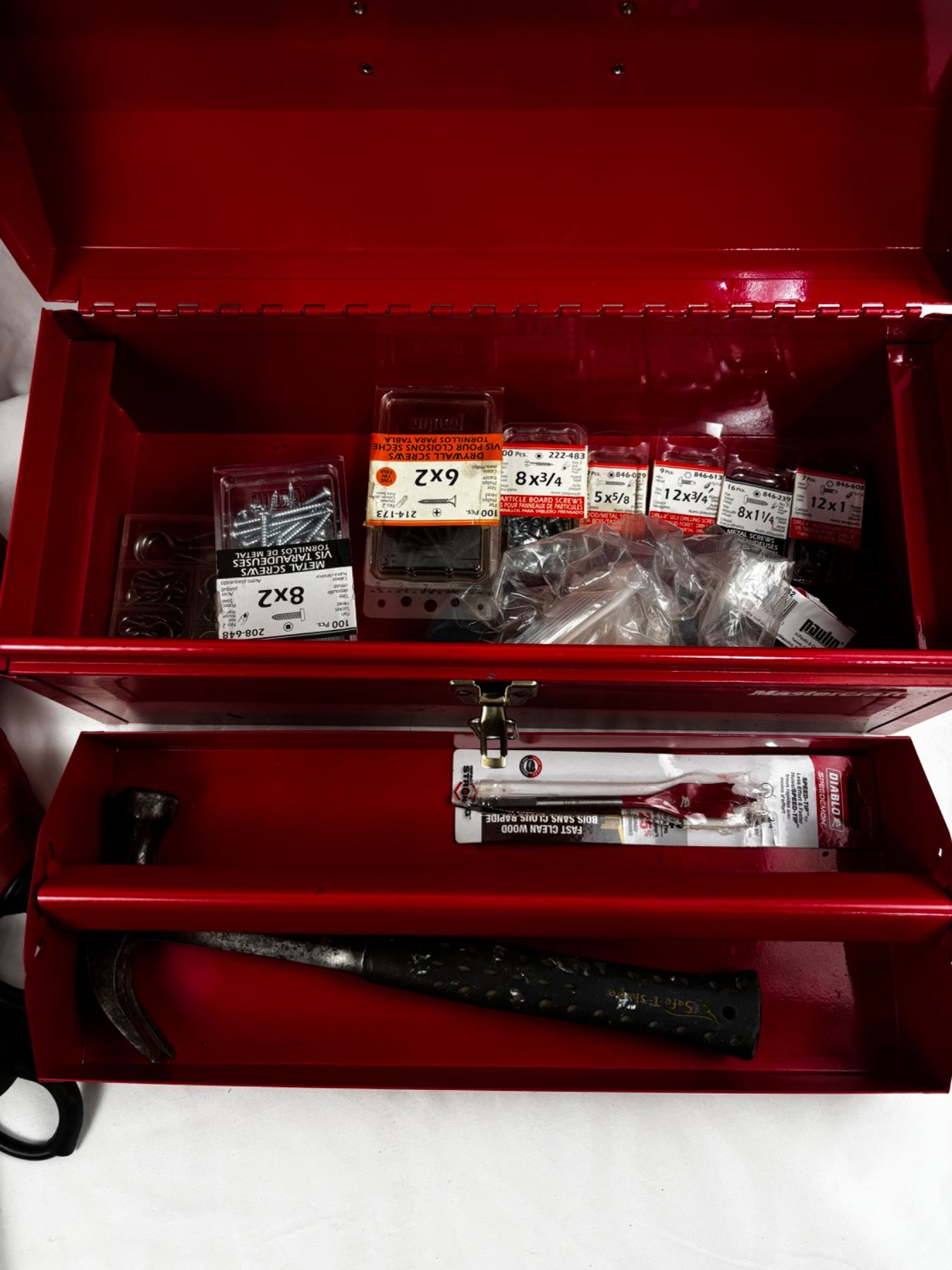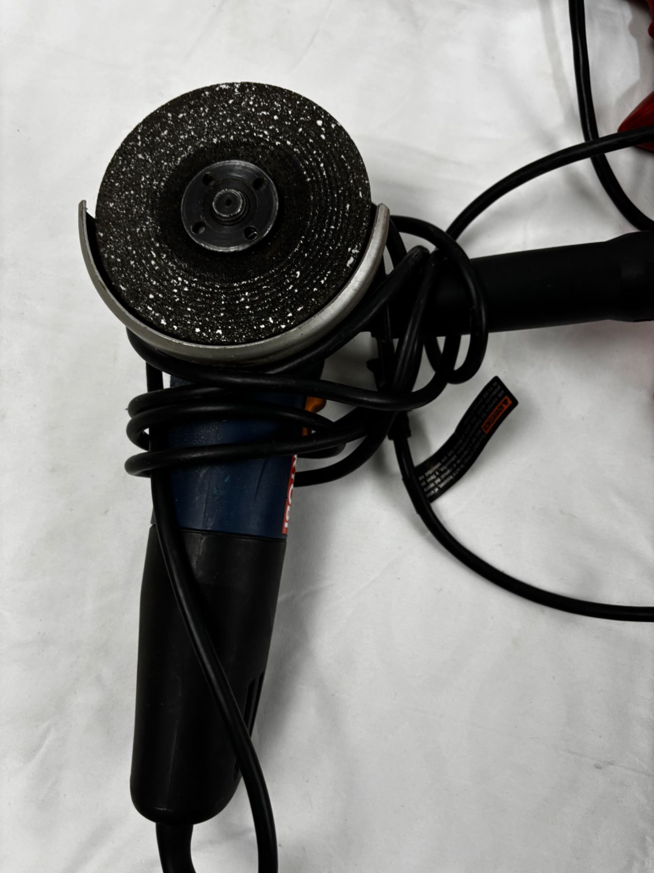 Includes, Mastercraft Toolbox with content (17"L x 7"W x 7.5"H), Black & Decker Drill No. DR201, Ryobi Grinder No. AG402, Both power tools turn on