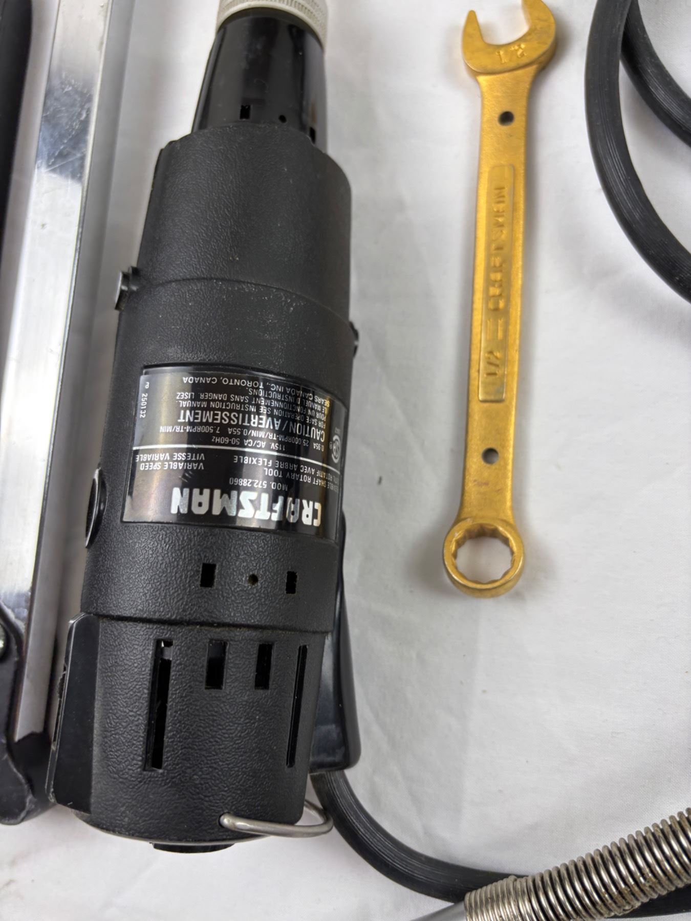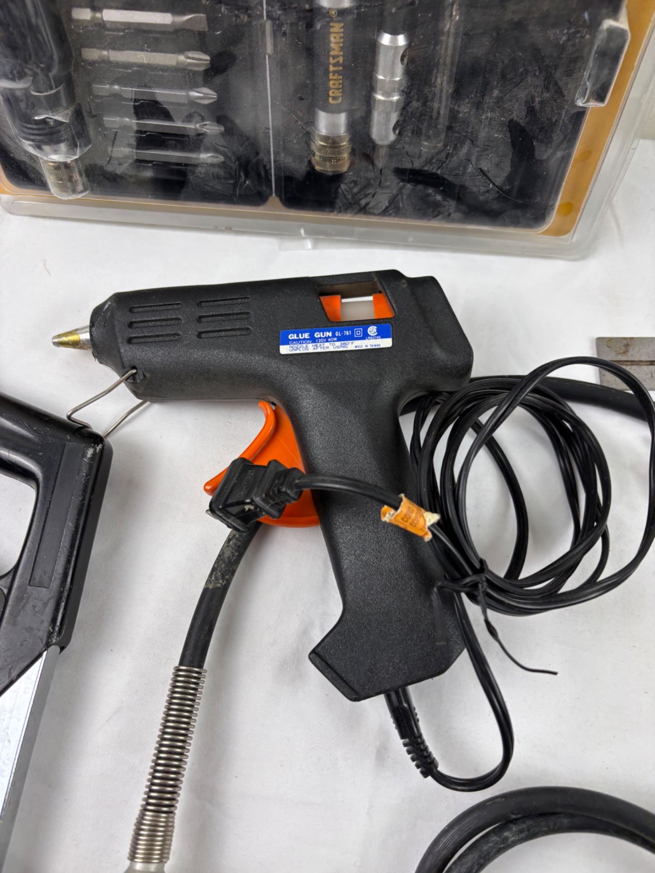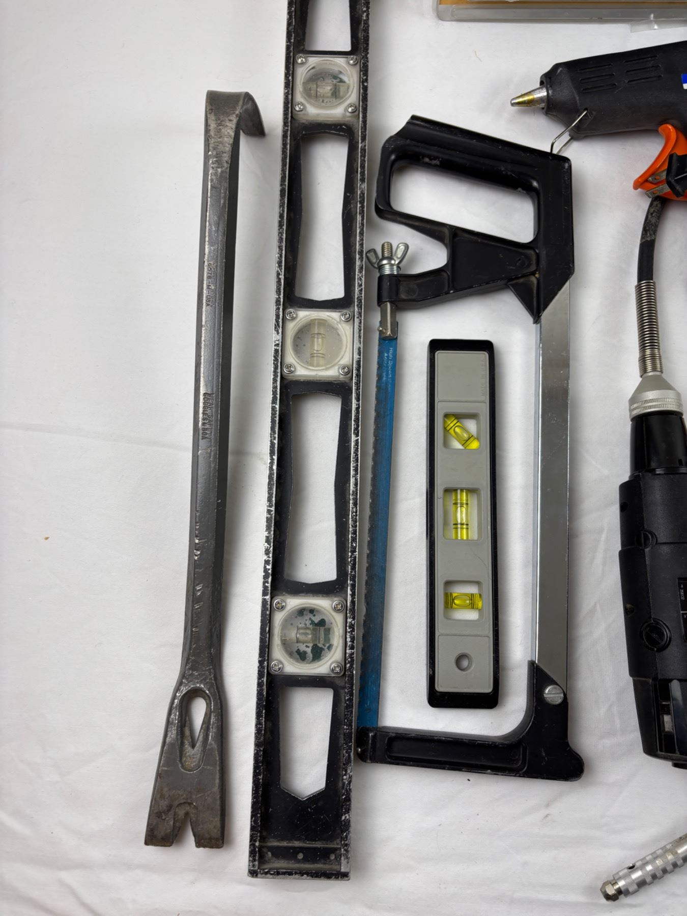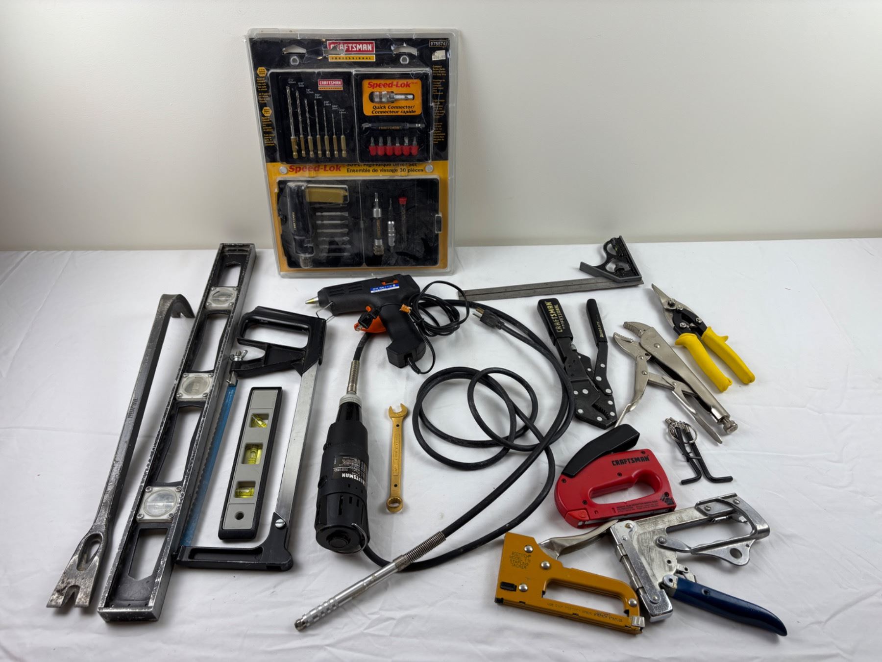 Includes, Craftsman rotary tool (turns on), levels, staplers, and more