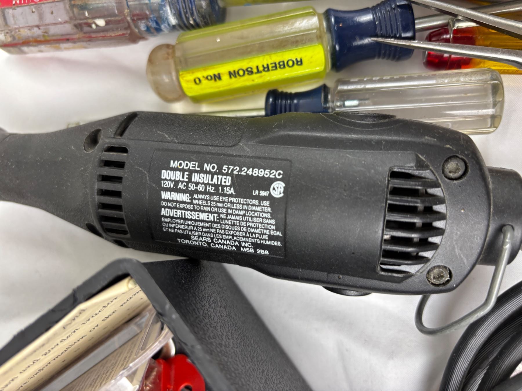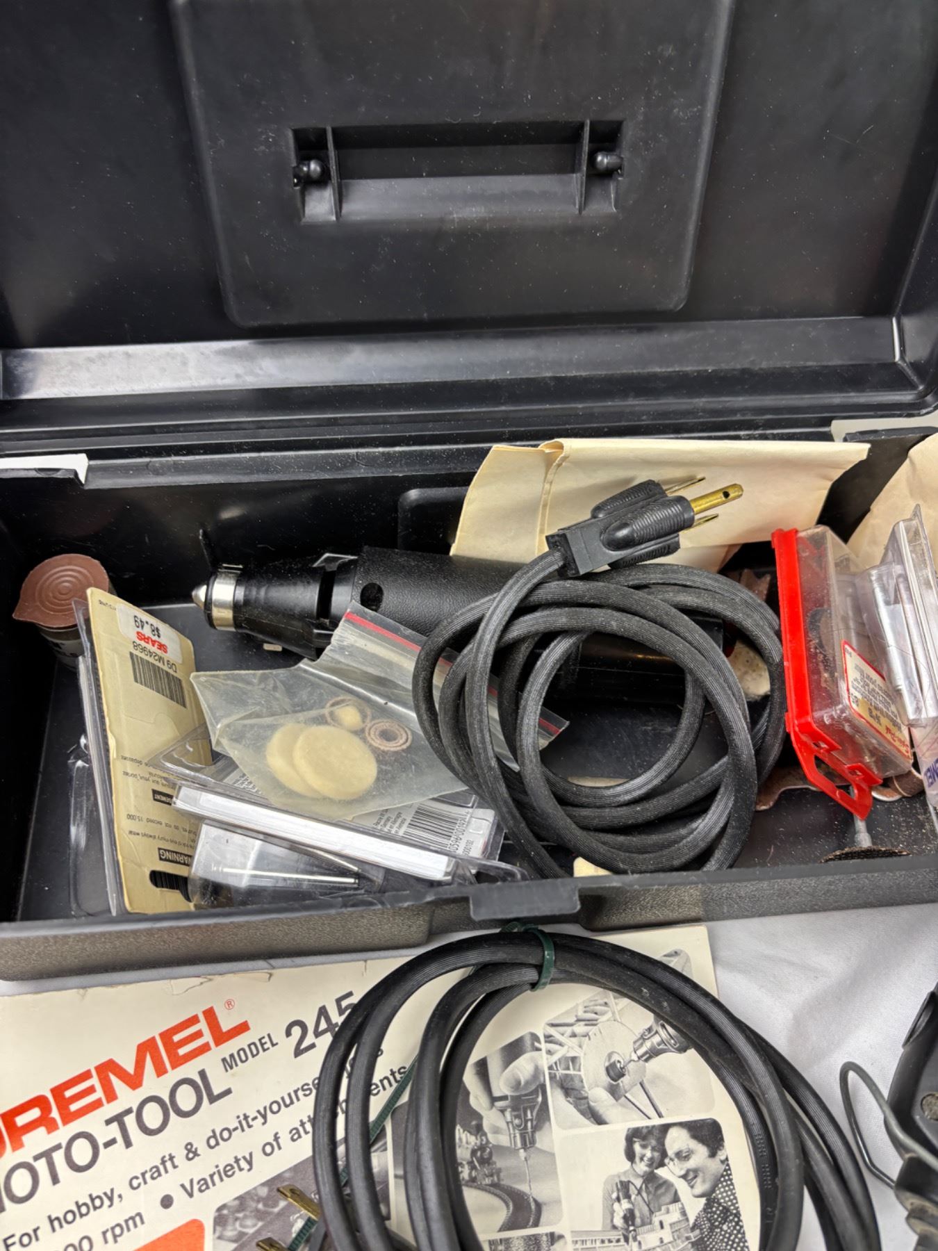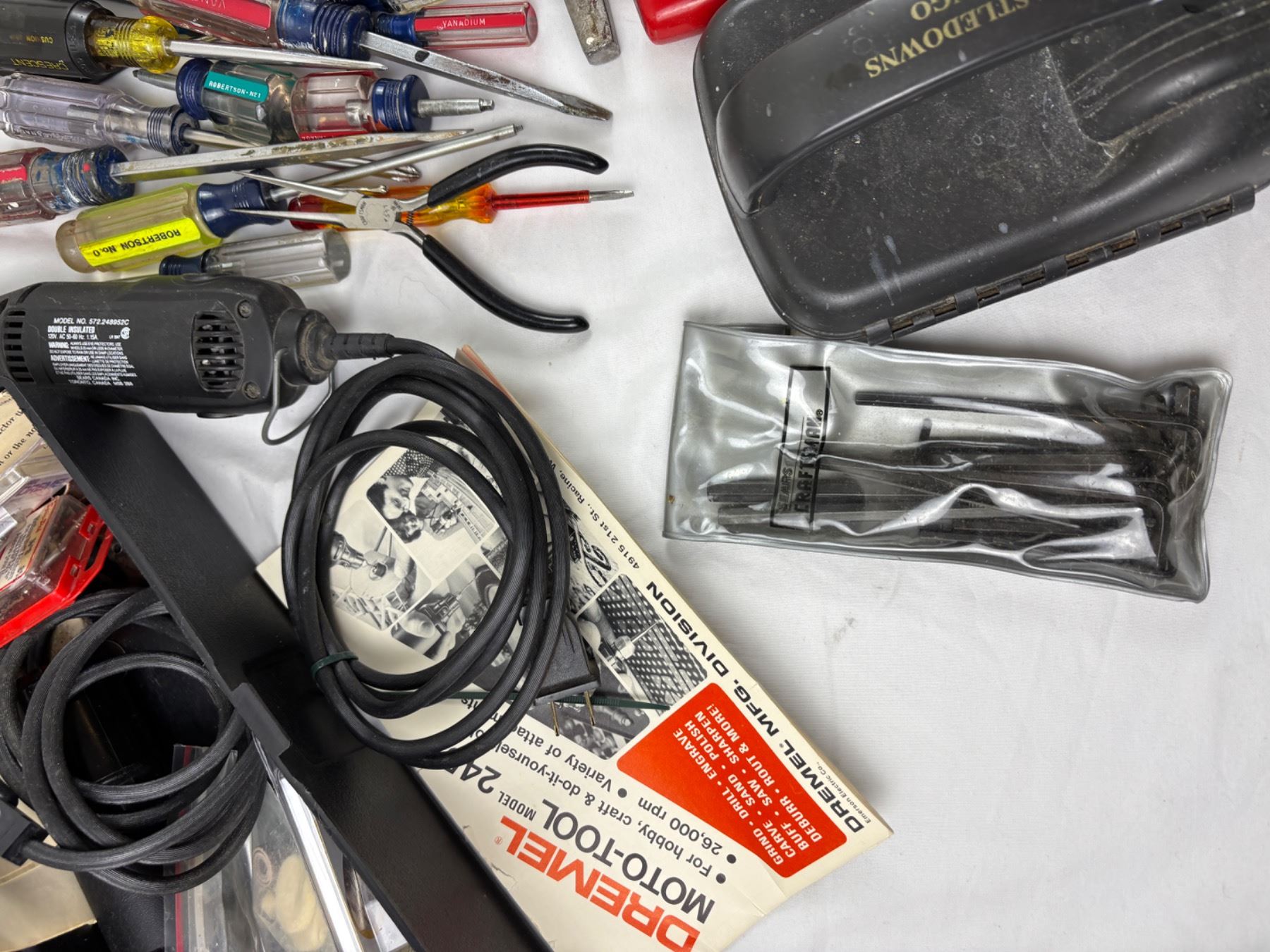 Includes a Dremel Model 245 and Craftsman Rotary Tool (turns on), various screwdrivers and hand tools