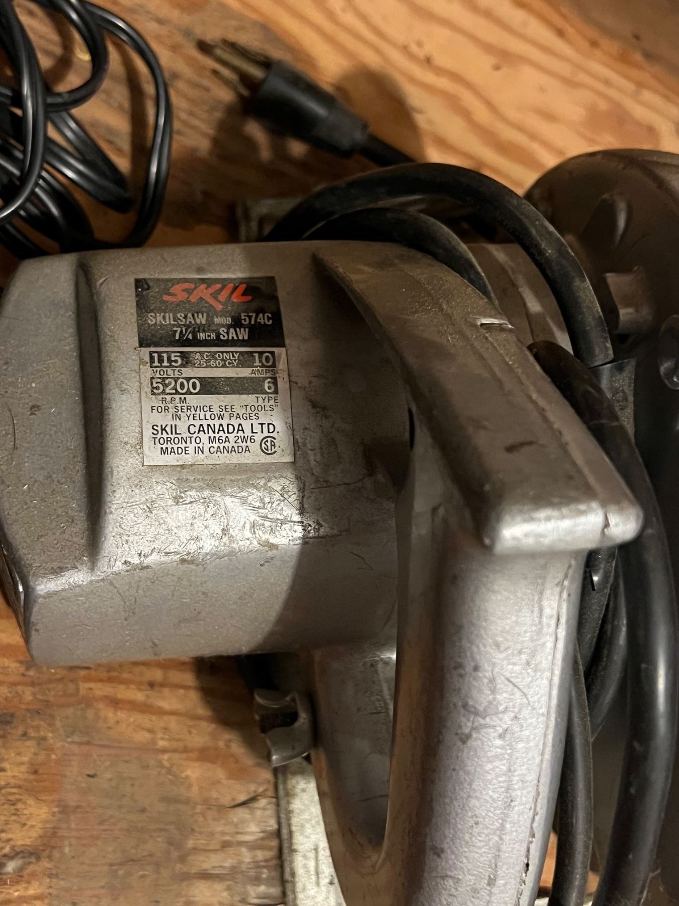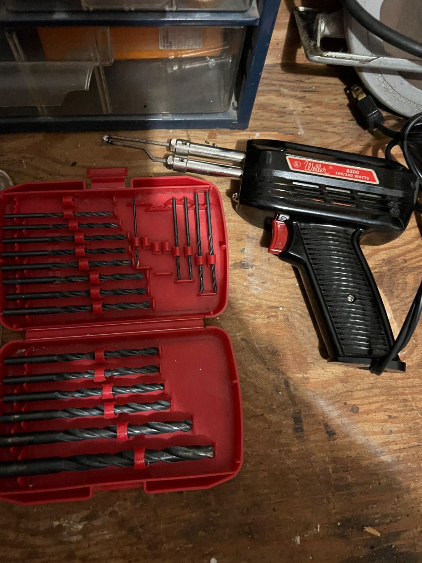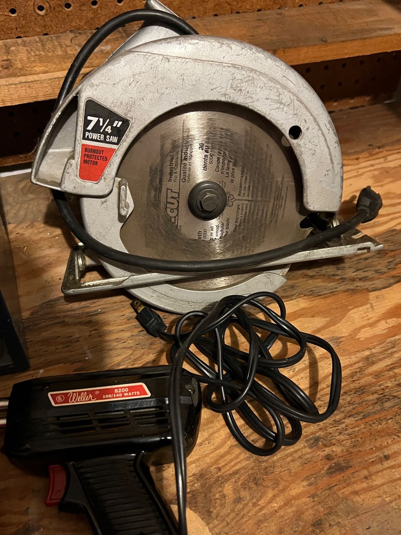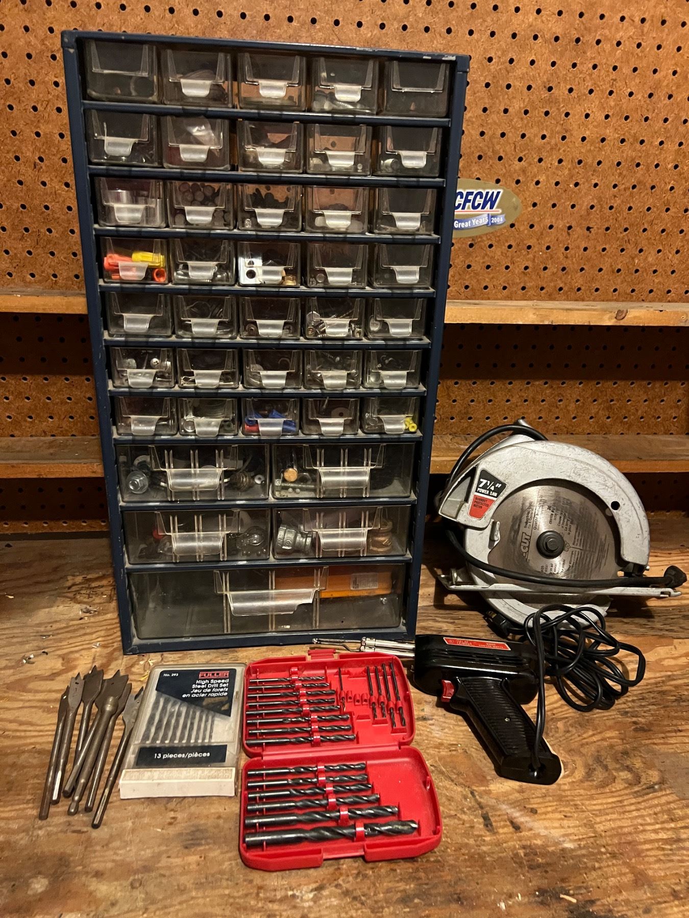 Includes 7 1/4" skil saw, storage container and all content, drill bits, etc