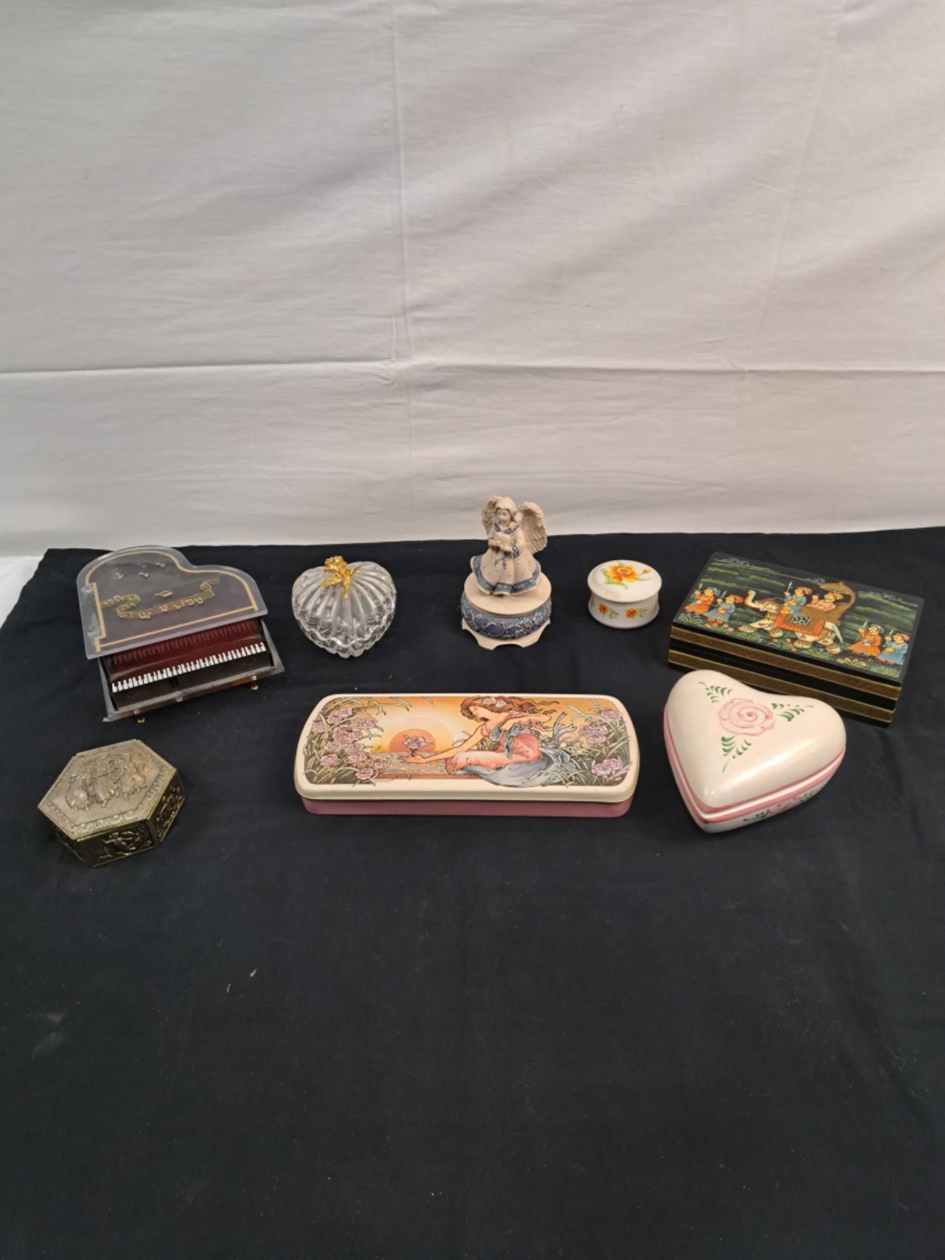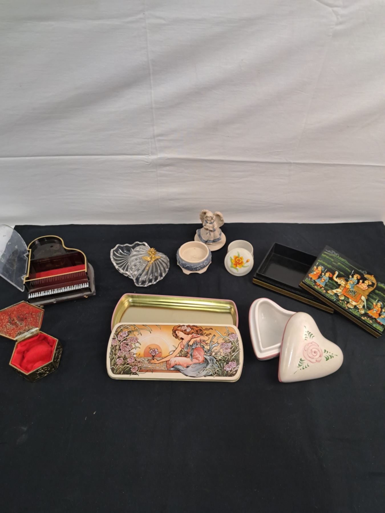 Piano trinket box is musical and works Tin is 8 3/4"L x 1"H x 3.5"W
