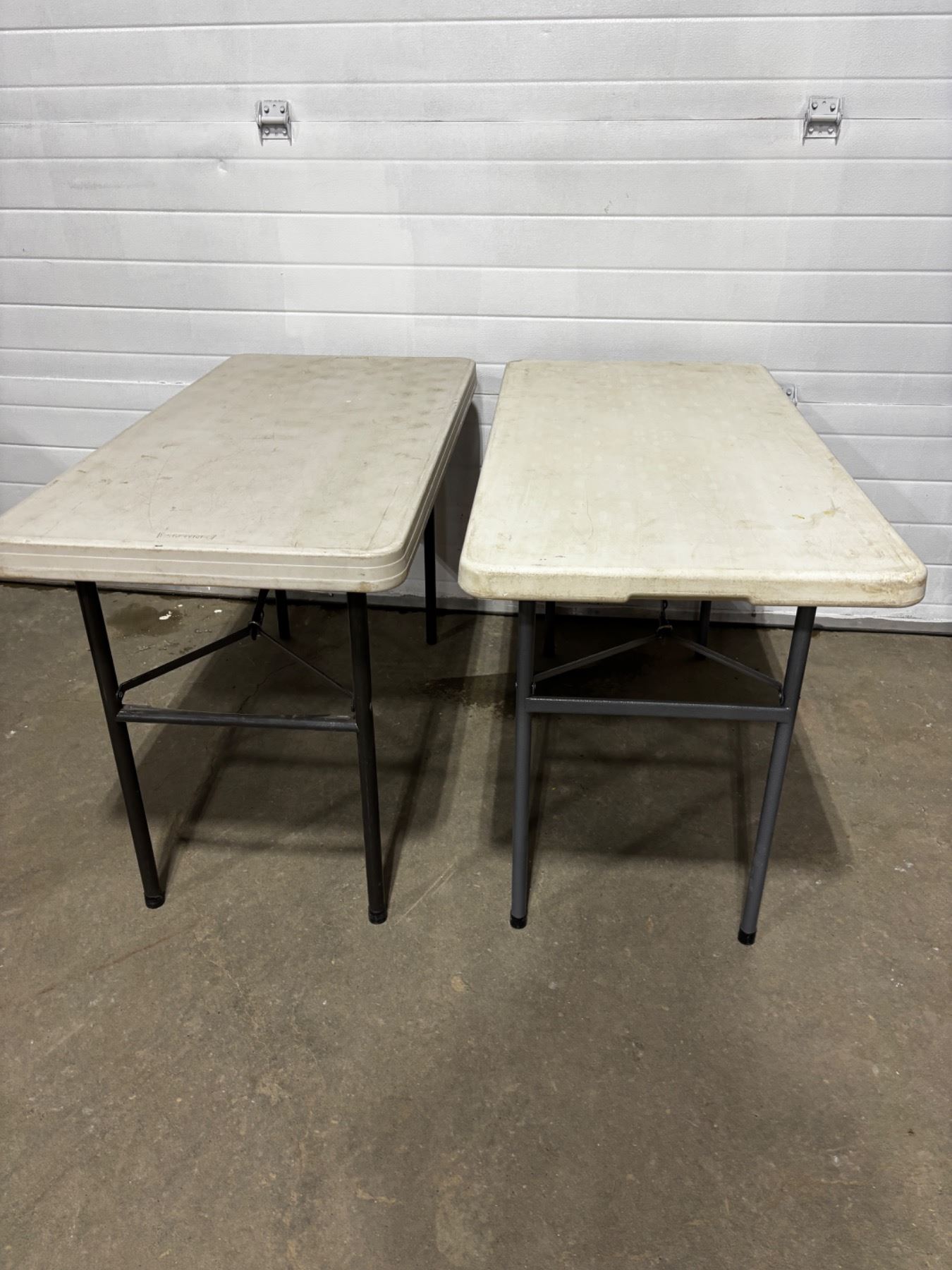 Includes 1 Lifetime table, one table has a cracked corner, both have stains and scratches, each one measures 4'L x 2'W x 29.5"H
